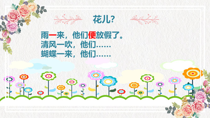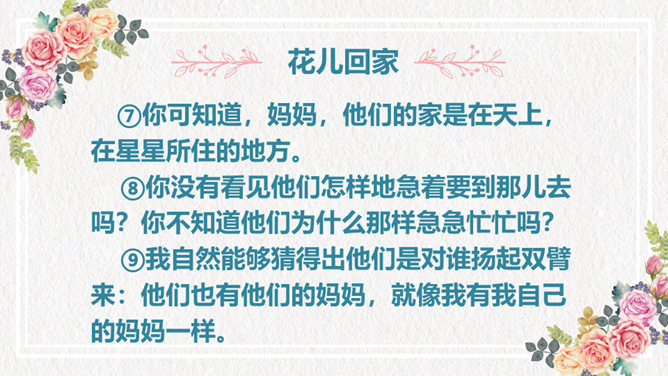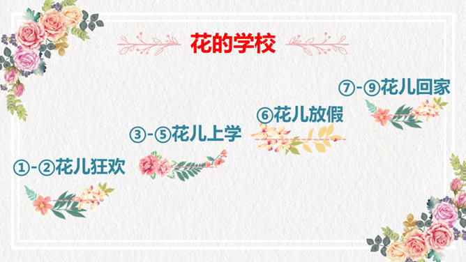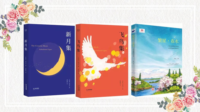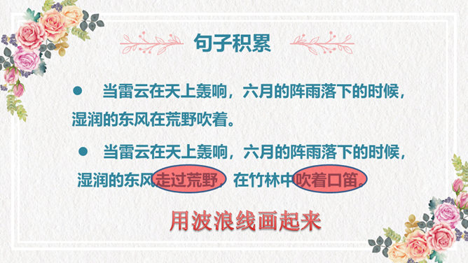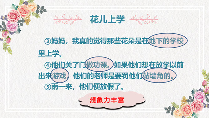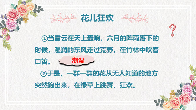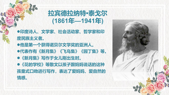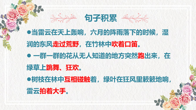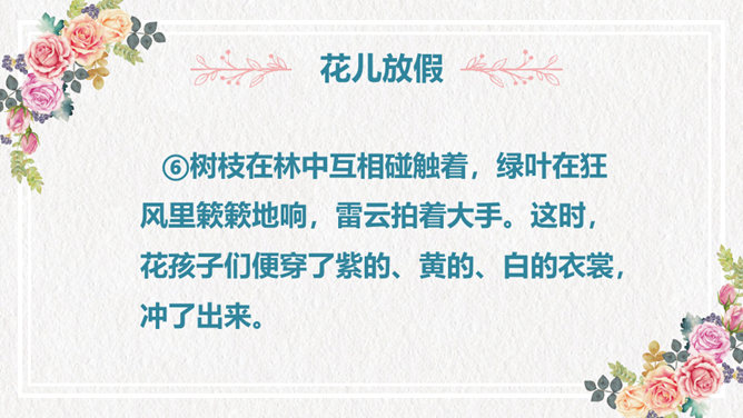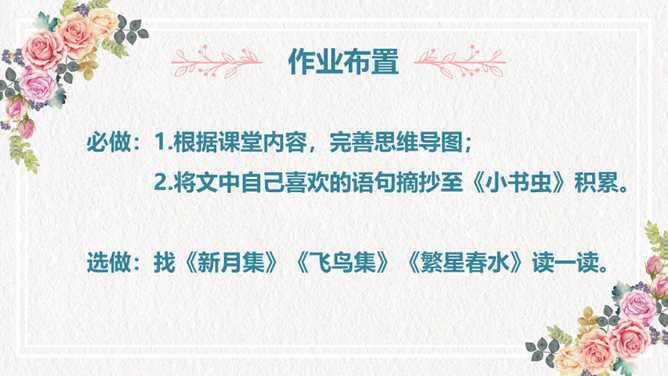 树枝在林中互相碰触着,绿叶在狂风里簌簌地响,雷云拍着大手。一群一群的花从无人知道的地方突然跑出来,在绿草上跳舞、狂欢。当雷云在天上轰响,六月的阵雨落下的时候,湿润的东风走过荒野,在竹林中吹着口笛。作业布置:必做:1.根据课堂内容,完善思维导图;2.将文中自己喜欢的语句摘抄至《小书虫》积累。选做:找《新月集》《飞鸟集》《繁星春水》读一读。所属专题:花的学校ppt。