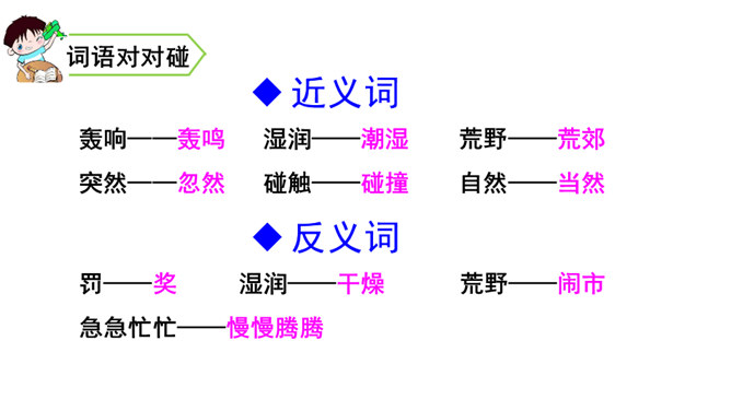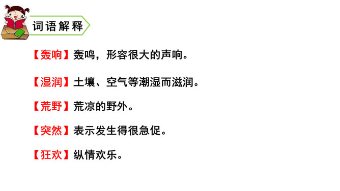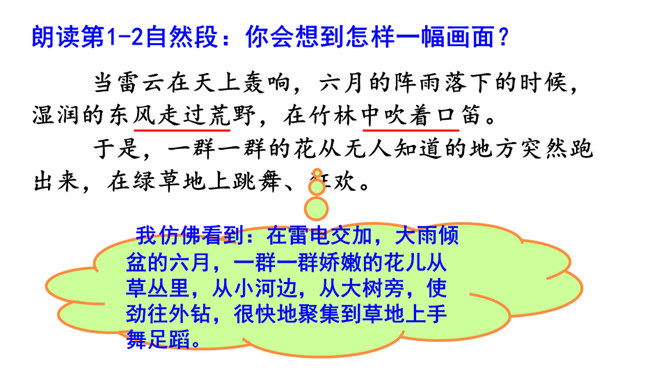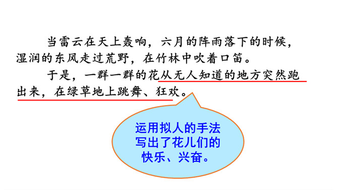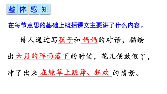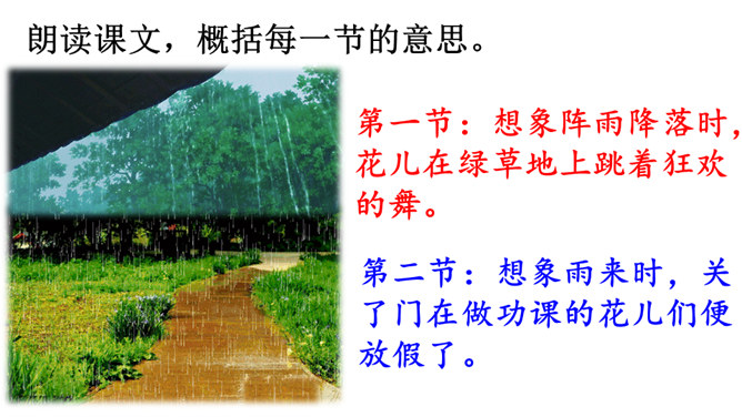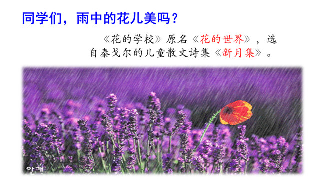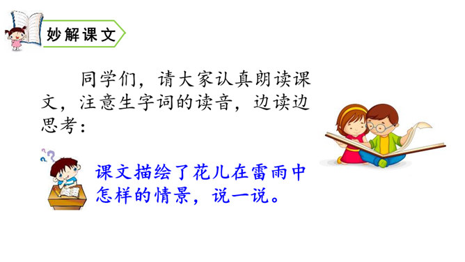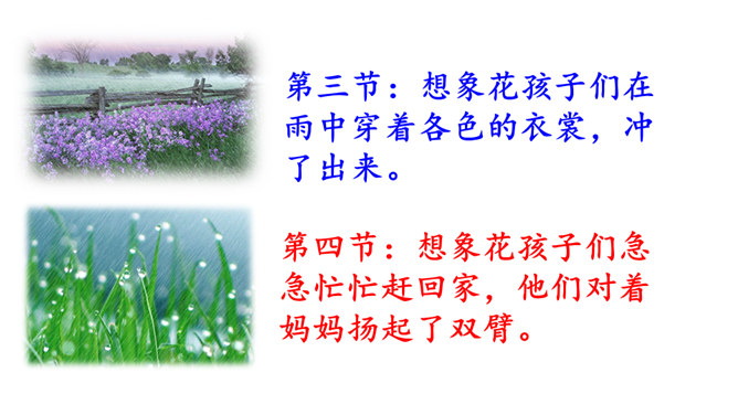 课文描绘了花儿在雷雨中怎样的情景,说一说。诗人连用两个反问句写出了孩子们急切地想回到母亲温暖的怀抱中,表达出孩子是多么希望能得到太阳般的温暖,天空般的自由。本文是一首儿童诗,诗人以清新流畅的笔触,勾画出甜美纯净的儿童世界。描写了在雷云、阵雨、东风的环境中,竹林、草地上冒出了花,花儿们读书、放假、回家等情景,表达了诗人对美好童心的呵护和对妈妈温暖怀抱的怀念。所属专题:花的学校ppt。