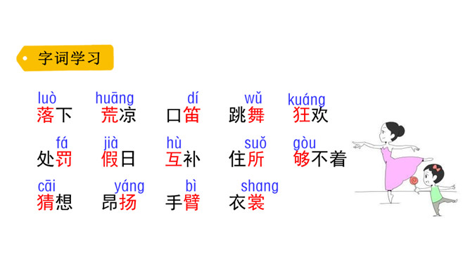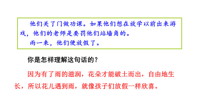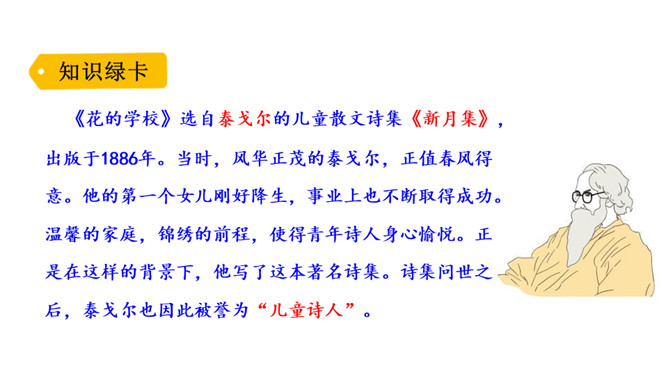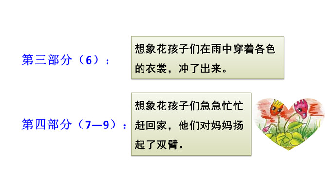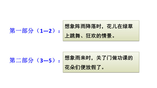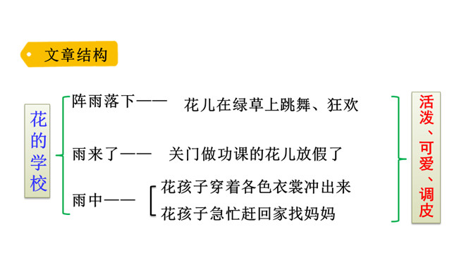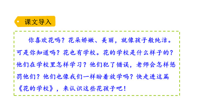 你喜欢花吗?花朵娇嫩、美丽,就像孩子般纯洁。可是你知道吗?花也有学校。花的学校是什么样子的?他们在学校里怎样学习?他们犯了错误,老师会怎样惩罚他们?他们也像我们一样盼着放学吗?快走进这篇课文,来认识这些花孩子吧!1.会认5个生字,会写13个生字,掌握多音字“假”。正确读写“阵雨、荒野、绿草、跳舞、狂欢、功课、放假、互相”等词语。2.正确、流利地朗读课文,能想象花“在绿草上跳舞、狂欢”等情景。3.能找出课文中有新鲜感的词句。能仿照“雨一来,他们便放假了”的表达写句子。所属专题:花的学校ppt。