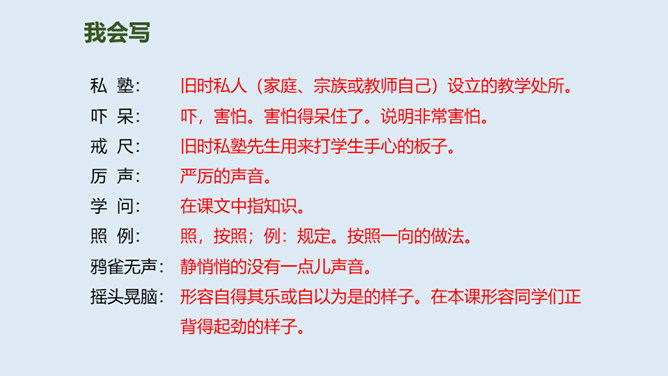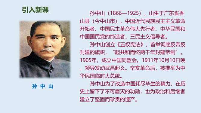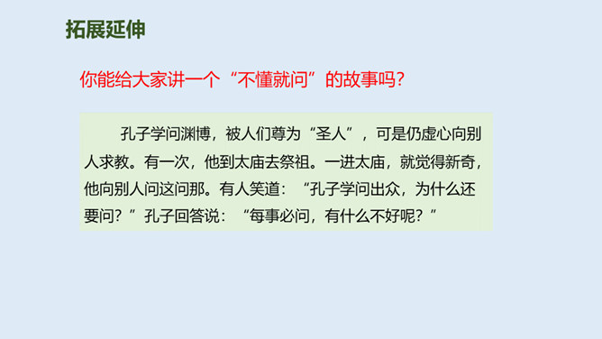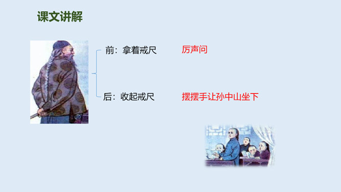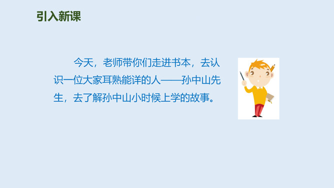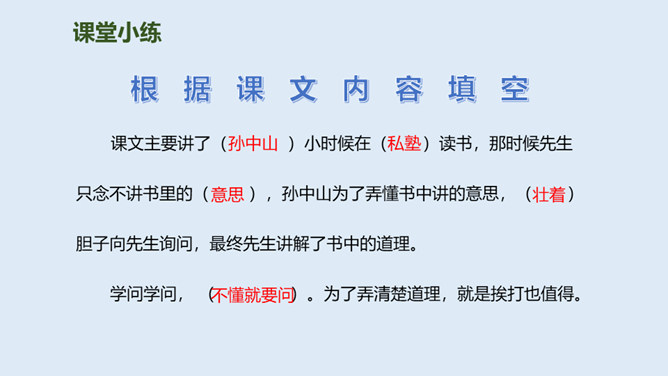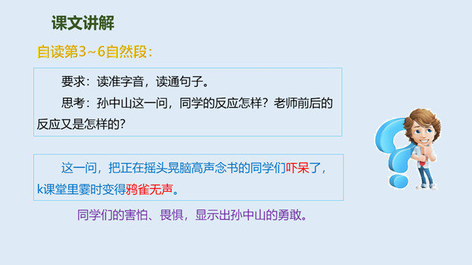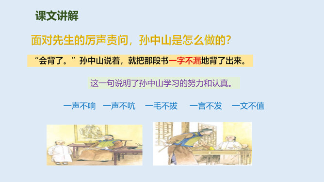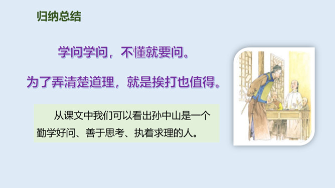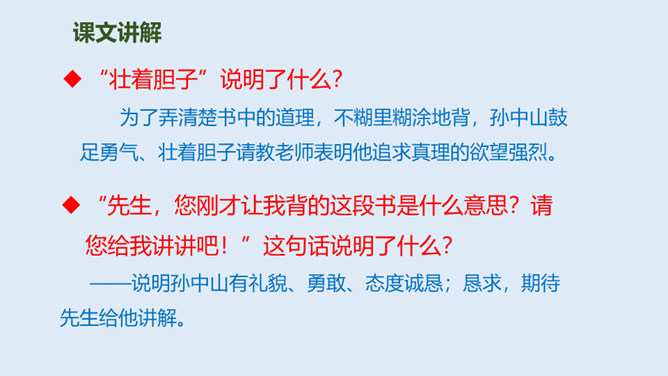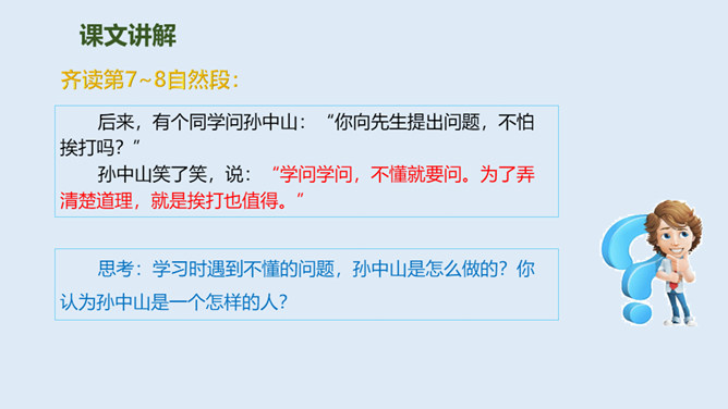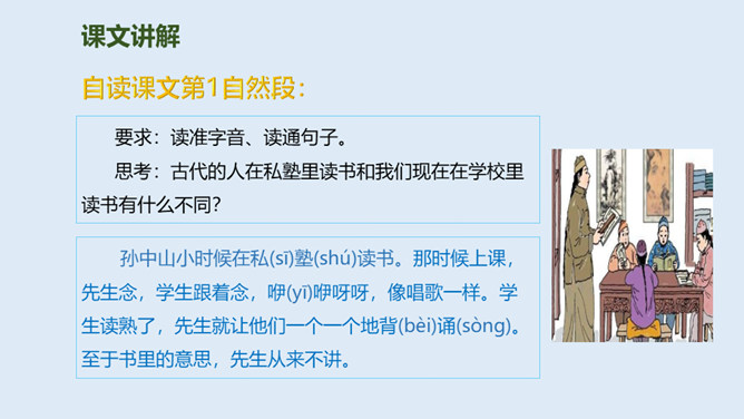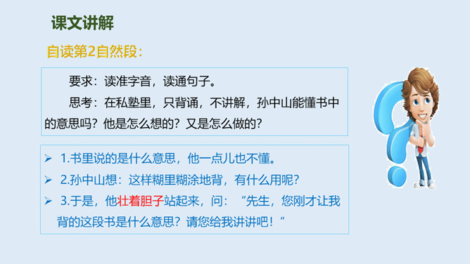 今天,老师带你们走进书本,去认识一位大家耳熟能详的人——孙中山先生,去了解孙中山小时候上学的故事。自读课文第1自然段,要求:读准字音、读通句子。思考:古代的人在私塾里读书和我们现在在学校里读书有什么不同?自读第2自然段,要求:读准字音,读通句子。思考:在私塾里,只背诵,不讲解,孙中山能懂书中的意思吗?他是怎么想的?又是怎么做的?“壮着胆子”说明了什么?为了弄清楚书中的道理,不糊里糊涂地背,孙中山鼓足勇气、壮着胆子请教老师表明他追求真理的欲望强烈。所属专题:不懂就要问ppt。
