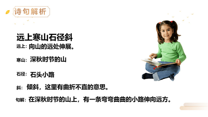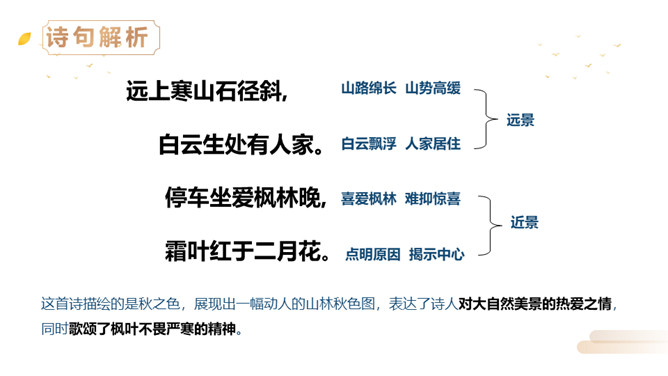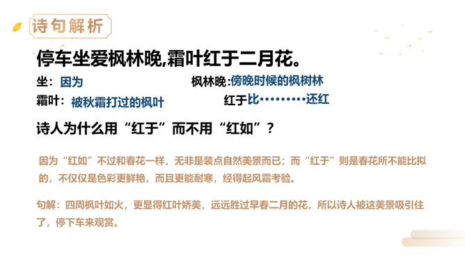 “生处”和“深处”都给人有点朦胧飘渺,产生超越世俗的神往之感,都是很动人的。但“生处”为云之源头,给人高山之巅、更为遥远的感觉,同时又有云腾雾涌、白云飘忽的动态感。应当是“生”字好于“深”字。因为“红如”不过和春花一样,无非是装点自然美景而已;而“红于”则是春花所不能比拟的,不仅仅是色彩更鲜艳,而且更能耐寒,经得起风霜考验。这首诗描绘的是秋之色,展现出一幅动人的山林秋色图。所属专题:山行ppt。