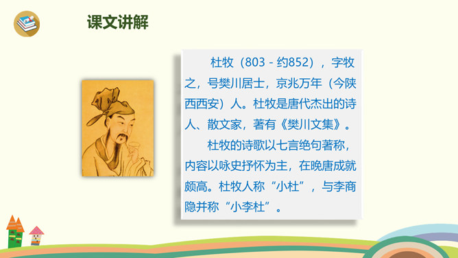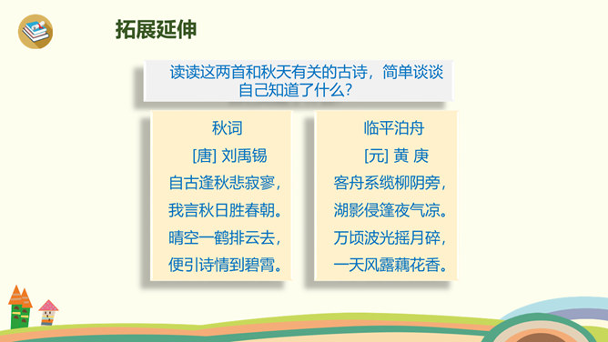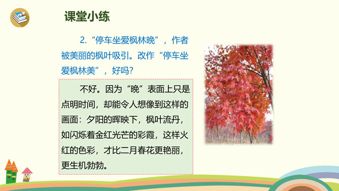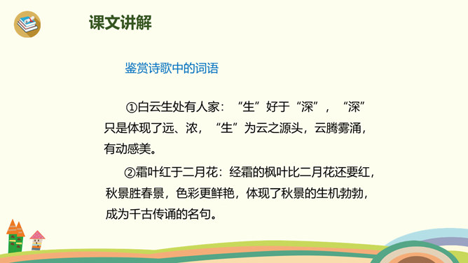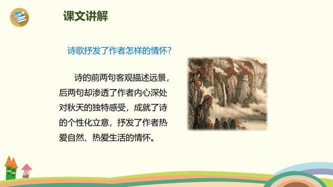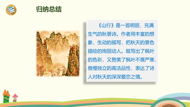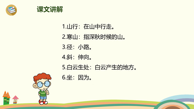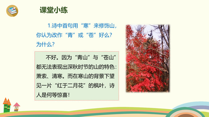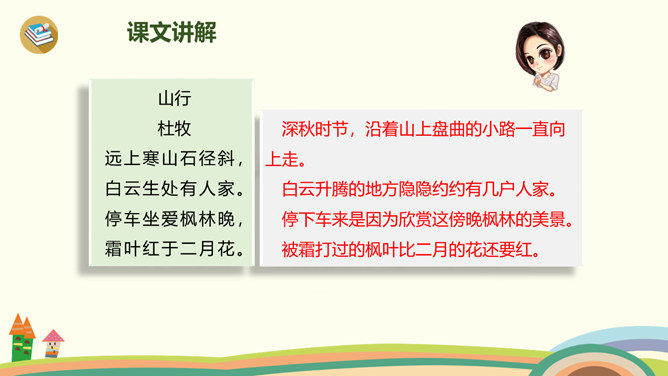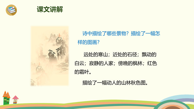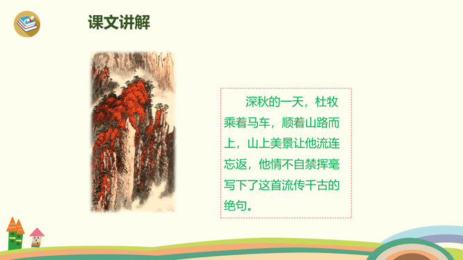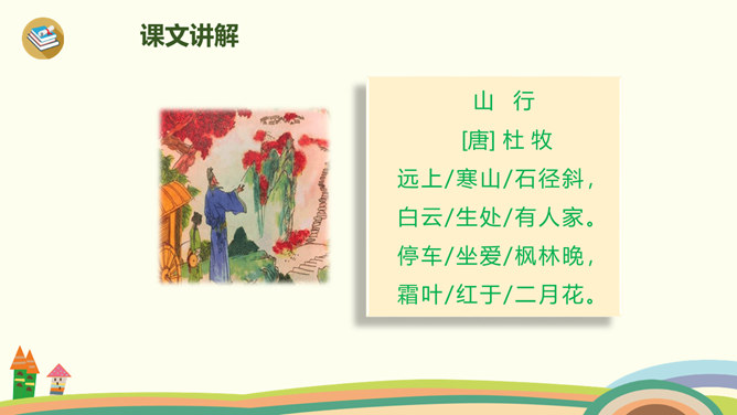 有人说“秋”是美的,秋高气爽,晴空万里;有人说“秋”是萧瑟的,秋风吹起,落叶飘零。不同的人,不同的心情对相同的景物有不同的感受。在你眼中秋天是怎样的呢?深秋的一天,杜牧乘着马车,顺着山路而上,山上美景让他流连忘返,他情不自禁挥毫写下了这首流传千古的绝句。诗中描绘了哪些景物?描绘了一幅怎样的图画?远处的寒山;近处的石径;飘动的白云;寂静的人家;傍晚的枫林;红色的霜叶。描绘了一幅动人的山林秋色图。所属专题:山行ppt。