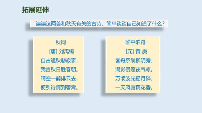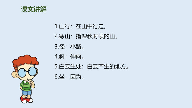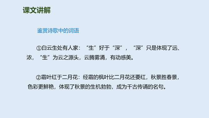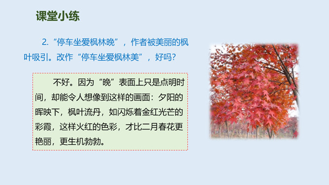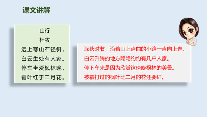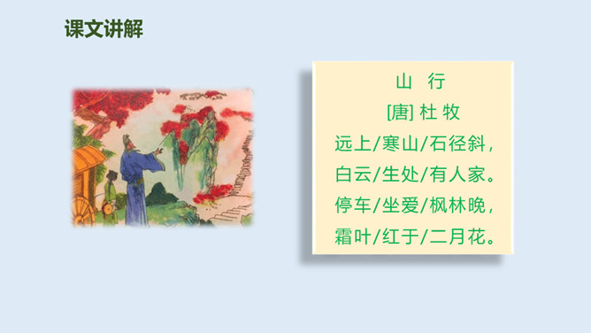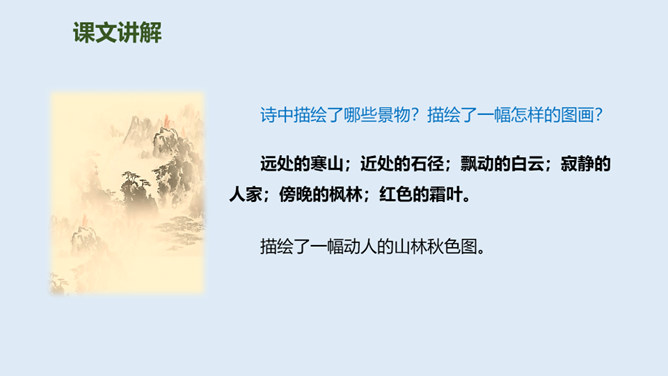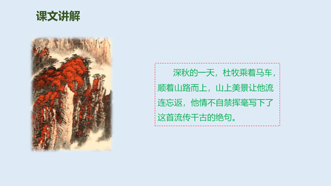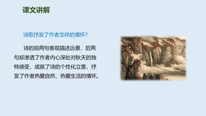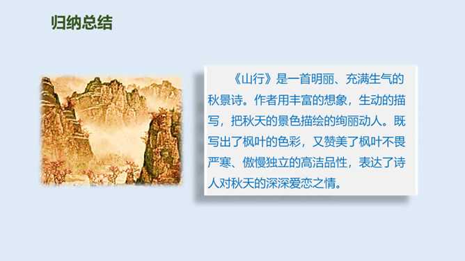诗歌抒发了作者怎样的情怀?诗的前两句客观描述远景,后两句却渗透了作者内心深处对秋天的独特感受,成就了诗的个性化立意,抒发了作者热爱自然、热爱生活的情怀。《山行》是一首明丽、充满生气的秋景诗。作者用丰富的想象,生动的描写,把秋天的景色描绘的绚丽动人。既写出了枫叶的色彩,又赞美了枫叶不畏严寒、傲慢独立的高洁品性,表达了诗人对秋天的深深爱恋之情。所属专题:山行ppt。