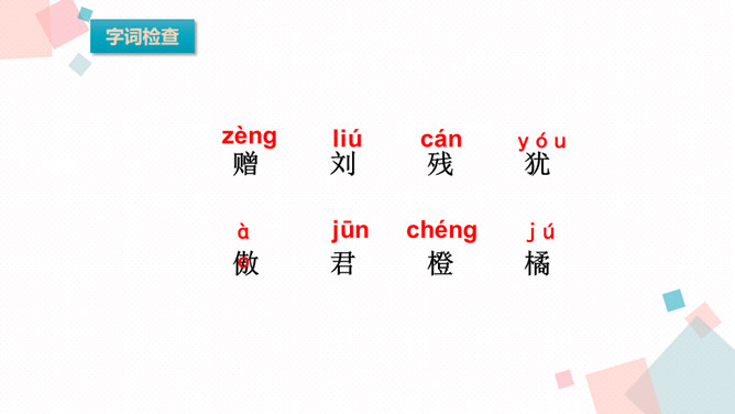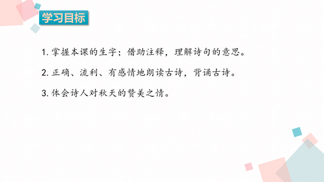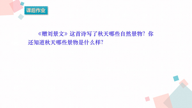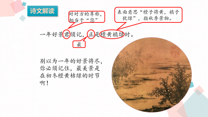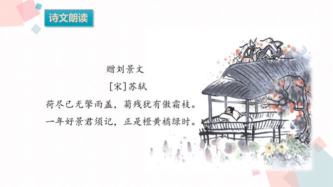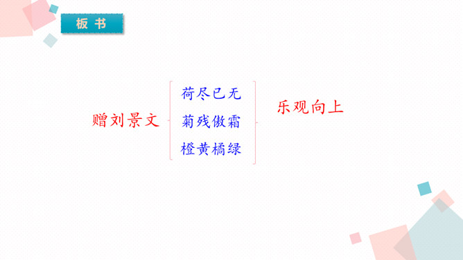 第一句以荷败、菊残,写出了秋末的特征,以橙子的金黄与橘子的青绿,把深秋的景色点缀得色彩鲜明而富有生气。第二行诗赞颂了菊花的残枝有傲霜凌寒的气概,唤起了我们面对生活要乐观向上,不泄气,珍惜现在的大好时光。表达了作者怎样的思想感情?突出了秋天是收获的季节,唤起了学生面对生活要乐观向上,不泄气,珍惜现在的大好时光。掌握本课的生字;借助注释,理解诗句的意思。正确、流利、有感情地朗读古诗,背诵古诗。体会诗人对秋天的赞美之情。所属专题:赠刘景文ppt。
