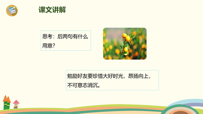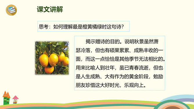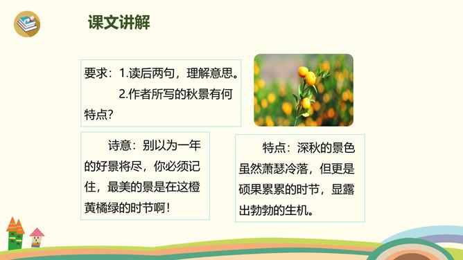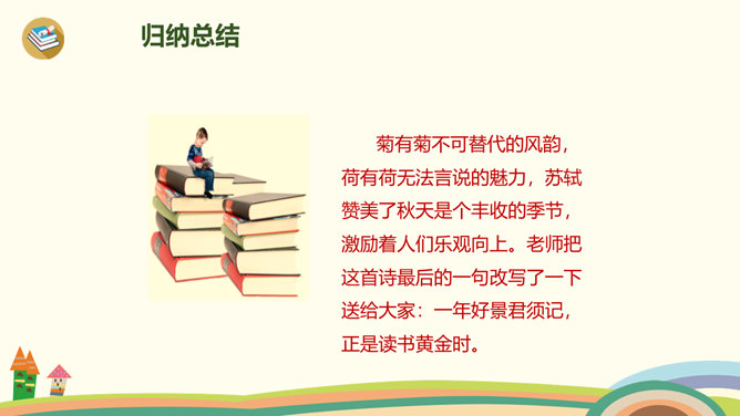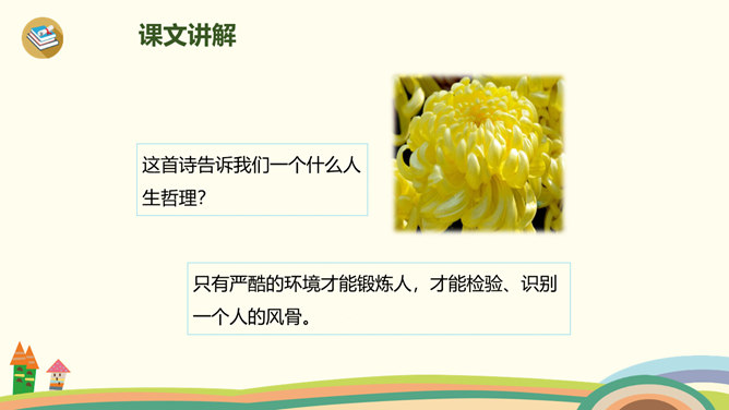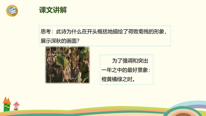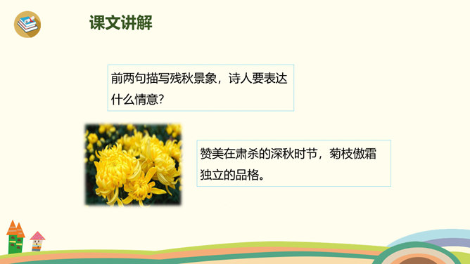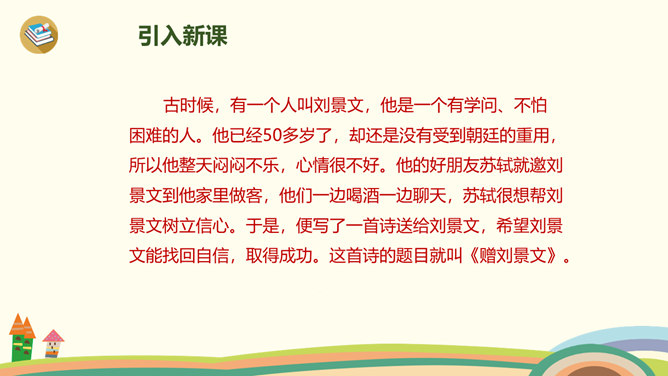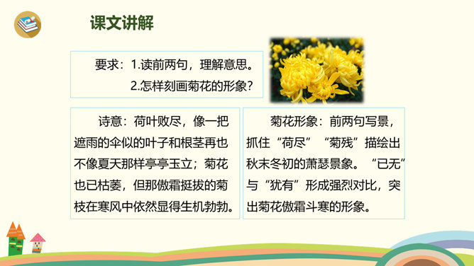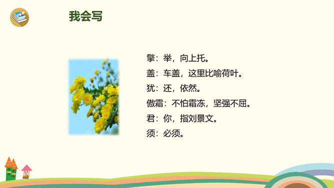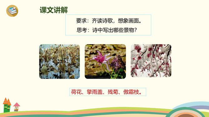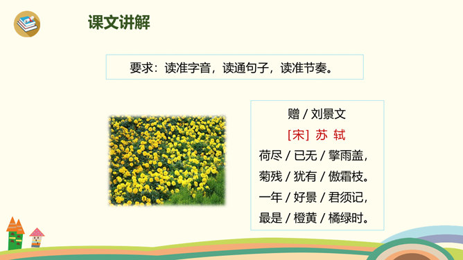 古时候,有一个人叫刘景文,他是一个有学问、不怕困难的人。他已经50多岁了,却还是没有受到朝廷的重用,所以他整天闷闷不乐,心情很不好。他的好朋友苏轼就邀刘景文到他家里做客,他们一边喝酒一边聊天,苏轼很想帮刘景文树立信心。于是,便写了一首诗送给刘景文,希望刘景文能找回自信,取得成功。要求:1.读前两句,理解意思。2.怎样刻画菊花的形象?思考:此诗为什么在开头概括地描绘了荷败菊残的形象,展示深秋的画面?所属专题:赠刘景文ppt。