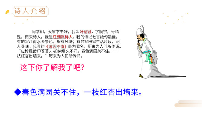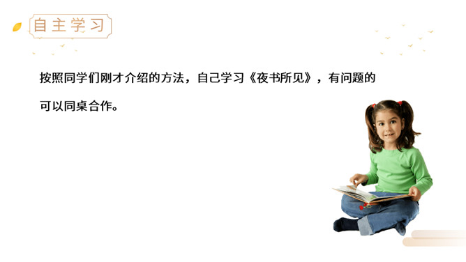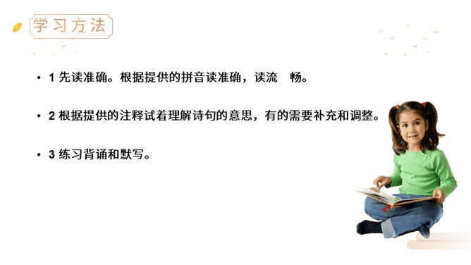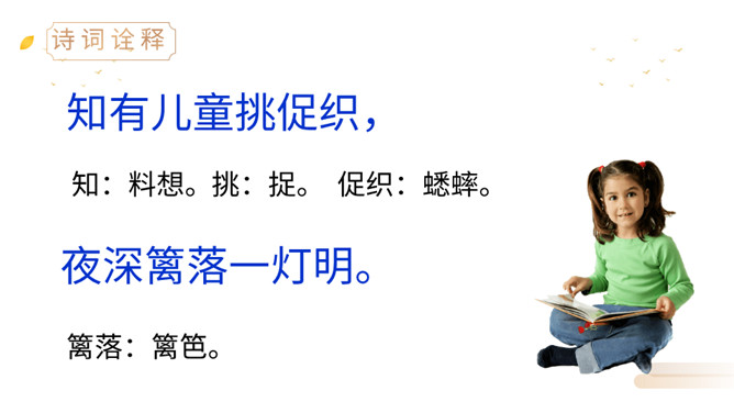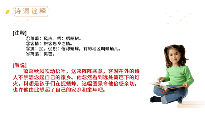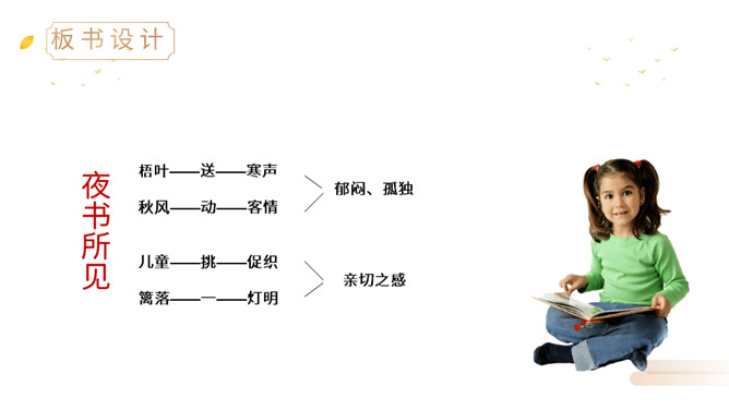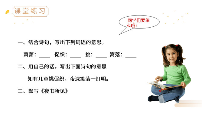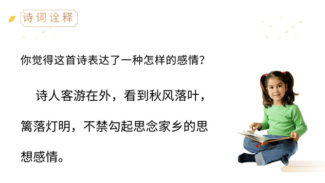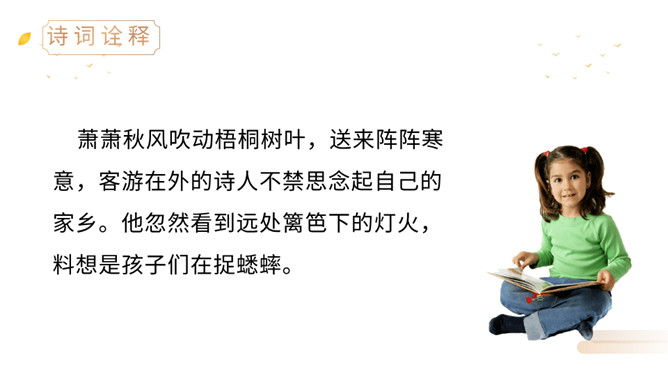 先读准确。根据提供的拼音读准确,读流畅。根据提供的注释试着理解诗句的意思,有的需要补充和调整。练习背诵和默写。萧萧秋风吹动梧桐树叶,送来阵阵寒意,客游在外的诗人不禁思念起自己的家乡。他忽然看到远处篱笆下的灯火,料想是孩子们在捉蟋蟀。你觉得这首诗表达了一种怎样的感情?诗人客游在外,看到秋风落叶,篱落灯明,不禁勾起思念家乡的思想感情。所属专题:夜书所见ppt。