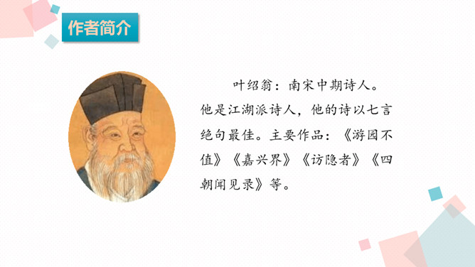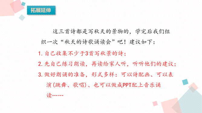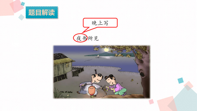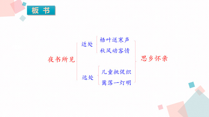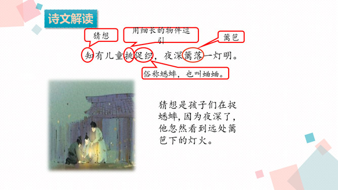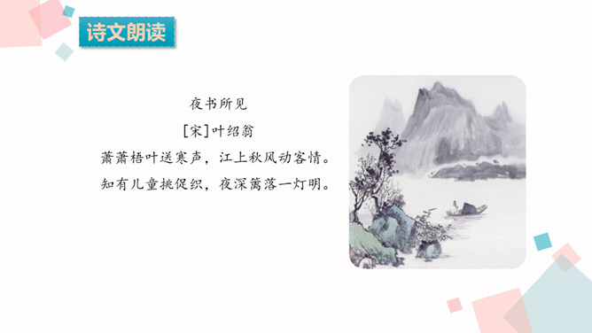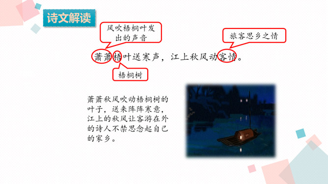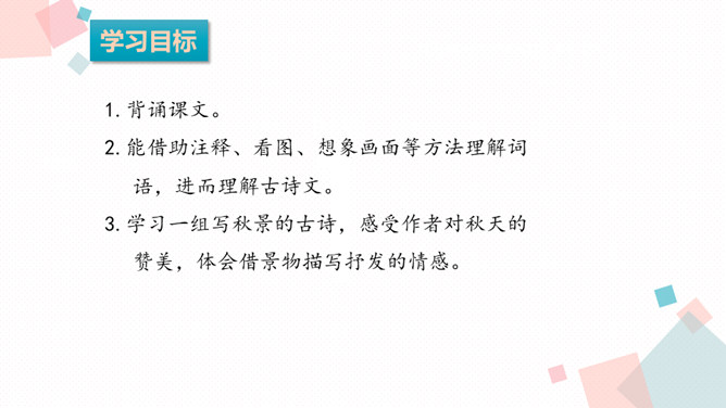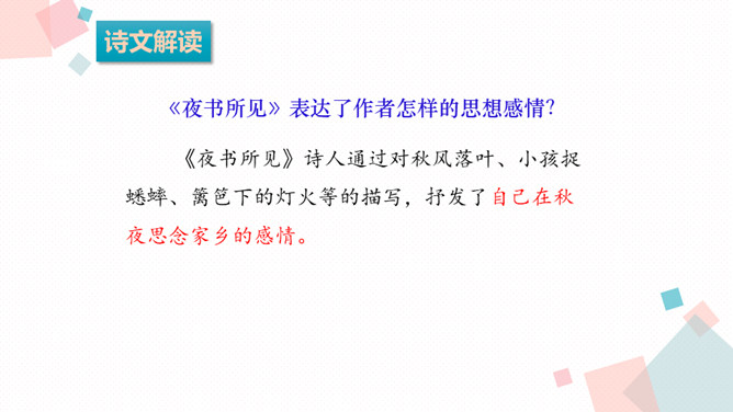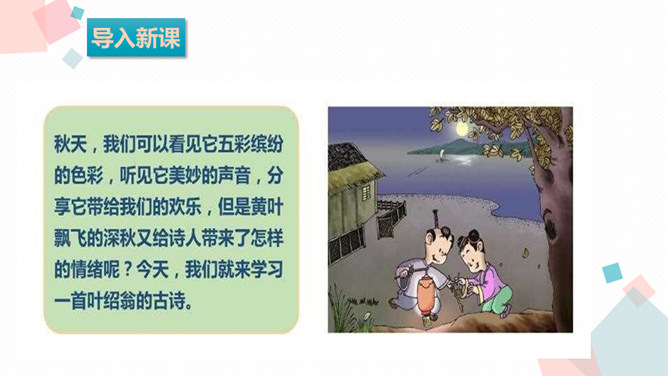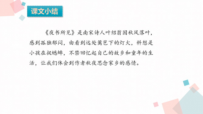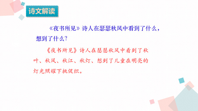 学习目标:1.背诵课文。2.能借助注释、看图、想象画面等方法理解词语,进而理解古诗文。3.学习一组写秋景的古诗,感受作者对秋天的赞美,体会借景物描写抒发的情感。诗人在瑟瑟秋风中看到了秋叶、秋风、秋江、秋灯、想到了儿童在明亮的灯光照耀下挑促织。诗人通过对秋风落叶、小孩捉蟋蟀、篱笆下的灯火等的描写,抒发了自己在秋夜思念家乡的感情。课后作业:在生活中寻找秋天的足迹。所属专题:夜书所见ppt。