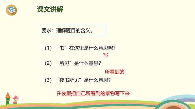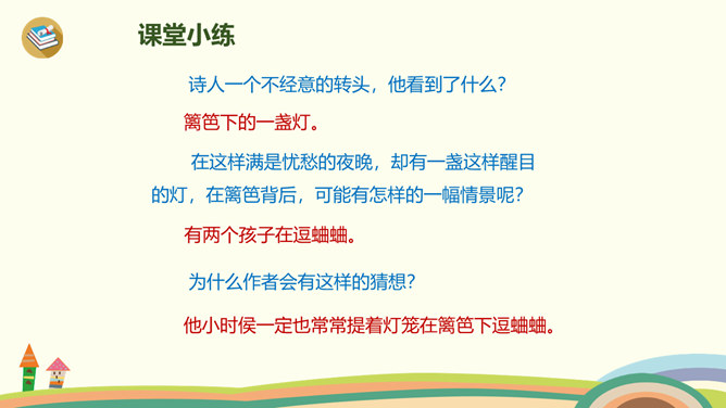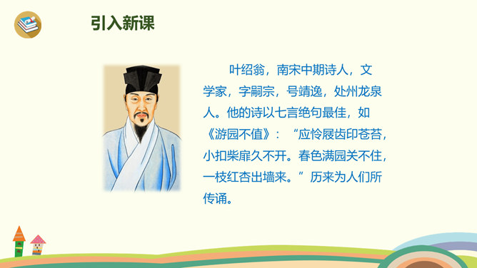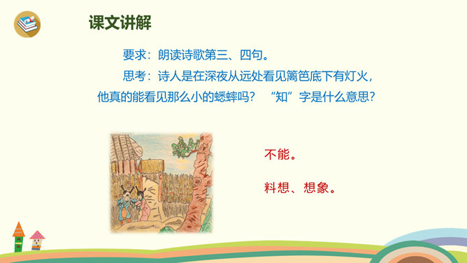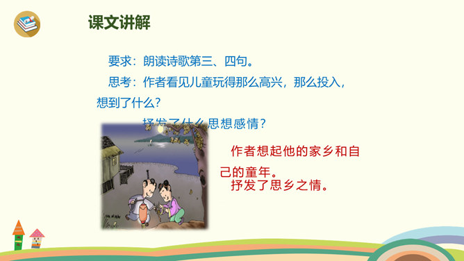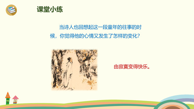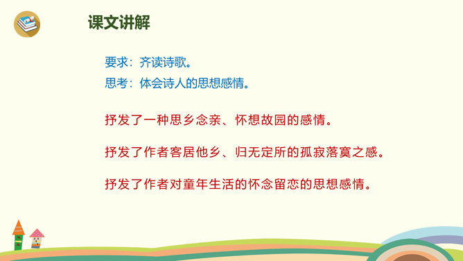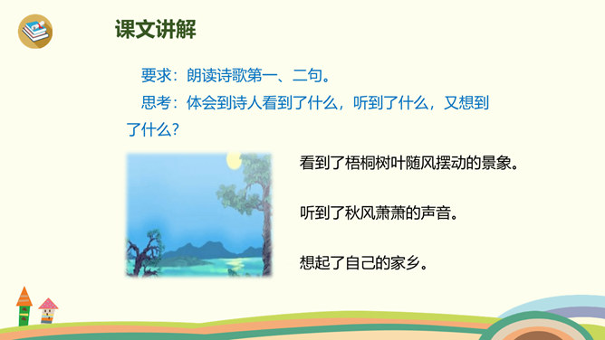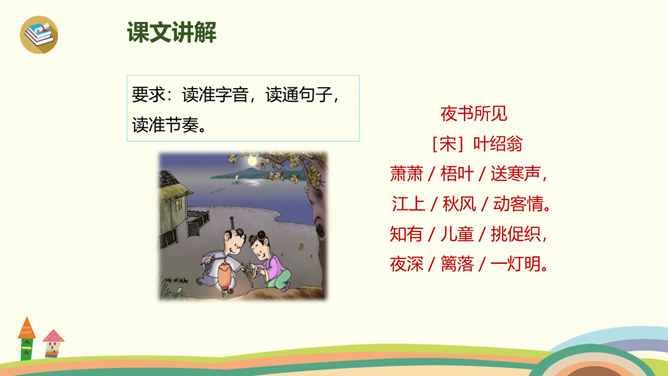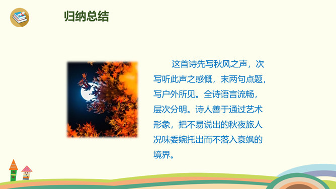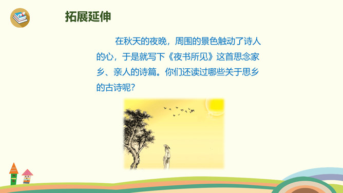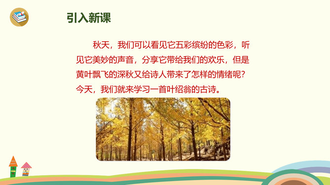 秋天,我们可以看见它五彩缤纷的色彩,听见它美妙的声音,分享它带给我们的欢乐,但是黄叶飘飞的深秋又给诗人带来了怎样的情绪呢?今天,我们就来学习一首叶绍翁的古诗。要求:朗读诗歌第一、二句。思考:体会到诗人看到了什么,听到了什么,又想到了什么?抒发了一种思乡念亲、怀想故园的感情。抒发了作者客居他乡、归无定所的孤寂落寞之感。抒发了作者对童年生活的怀念留恋的思想感情。所属专题:夜书所见ppt。