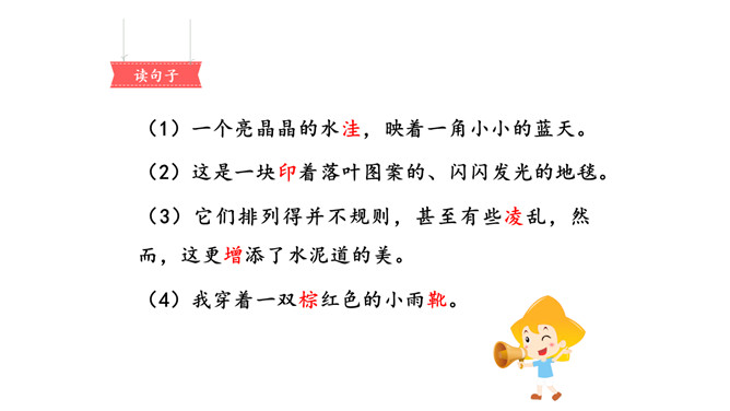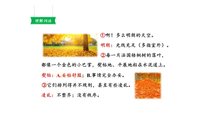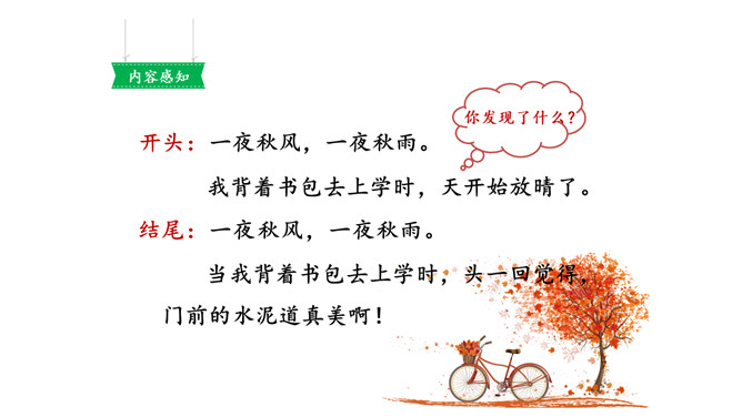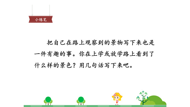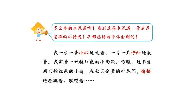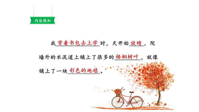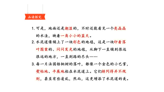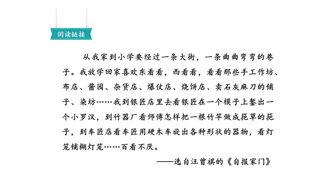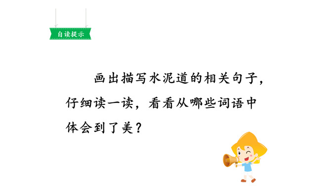 画出描写水泥道的相关句子,仔细读一读,看看从哪些词语中体会到了美?多么美的水泥道啊!看到这条水泥道,作者是怎样的心情呢?从哪些语句中体会到的?把自己在路上观察到的景物写下来也是一件有趣的事。你在上学或放学路上看到了什么样的景色?用几句话写下来吧。从我家到小学要经过一条大街,一条曲曲弯弯的巷子。我放学回家喜欢东看看,西看看,看看那些手工作坊、布店、杂货店、爆仗店卖石灰麻刀的铺子、染坊……所属专题:铺满金色巴掌的水泥道ppt。