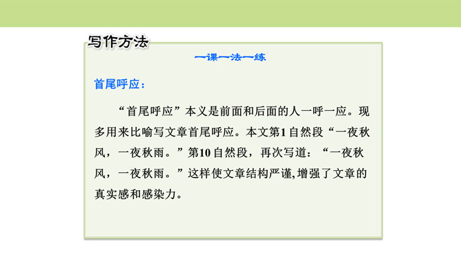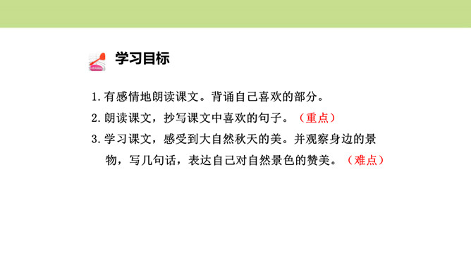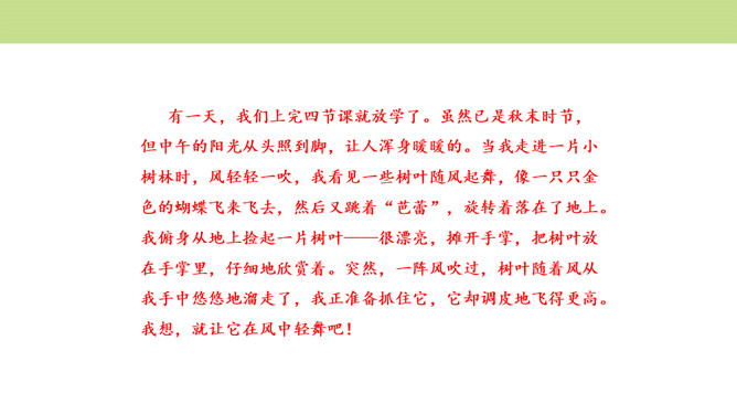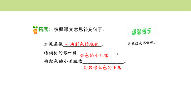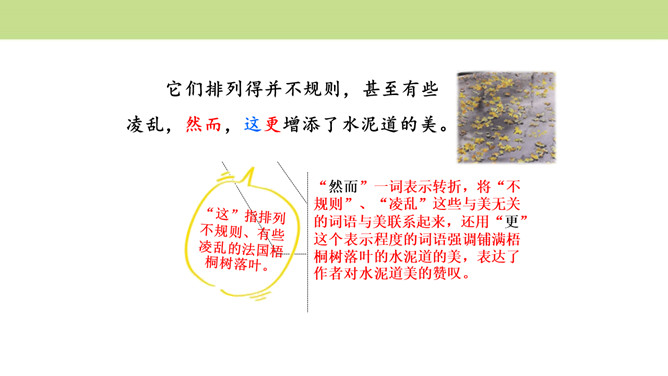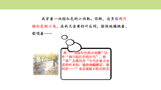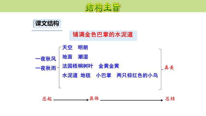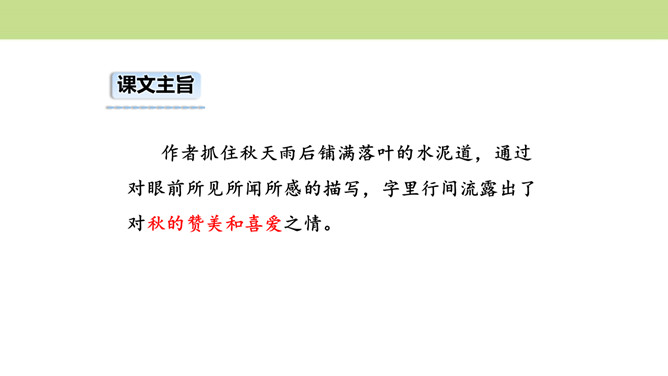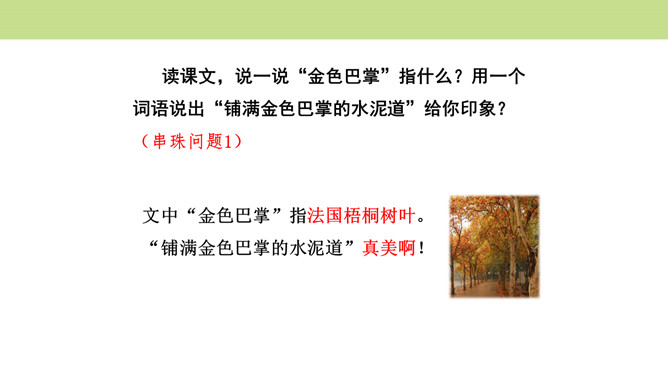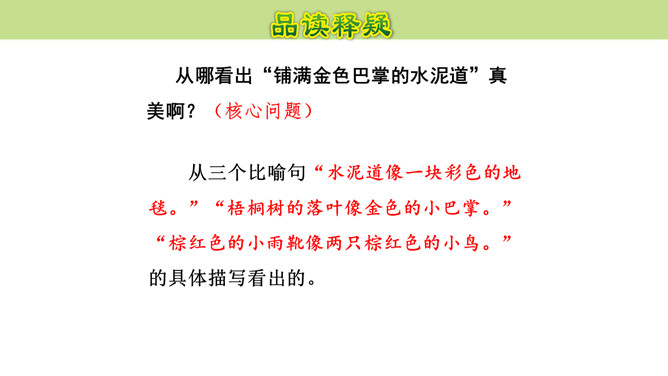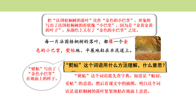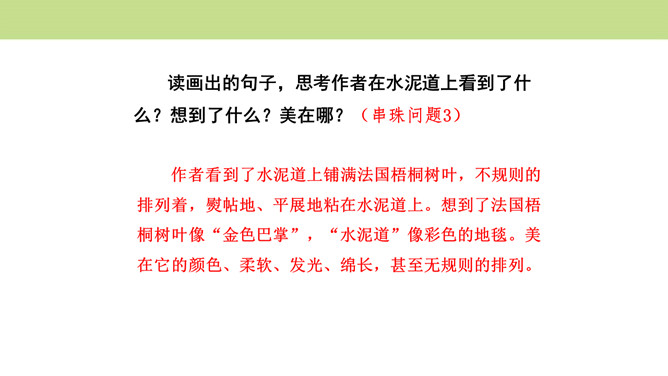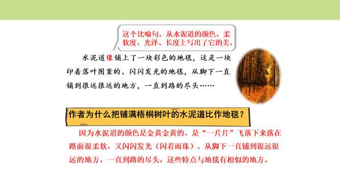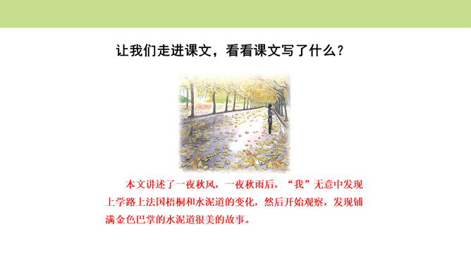 1.有感情地朗读课文。背诵自己喜欢的部分。2.朗读课文,抄写课文中喜欢的句子。(重点)3.学习课文,感受到大自然秋天的美。并观察身边的景物,写几句话,表达自己对自然景色的赞美。(难点)本文讲述了一夜秋风,一夜秋雨后,“我”无意中发现上学路上法国梧桐和水泥道的变化,然后开始观察,发现铺满金色巴掌的水泥道很美的故事。因为水泥道的颜色是金黄金黄的、是“一片片”飞落下来落在路面很柔软,又闪闪发光(闪着雨珠)、从脚下一直铺到很远很远的地方,一直到路的尽头,这些特点与地毯有相似的地方。所属专题:铺满金色巴掌的水泥道ppt。