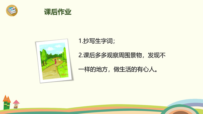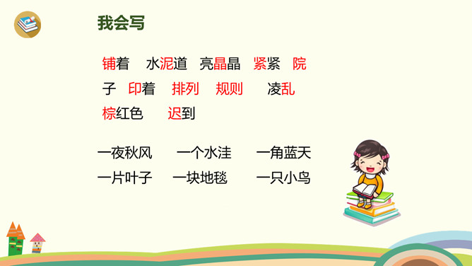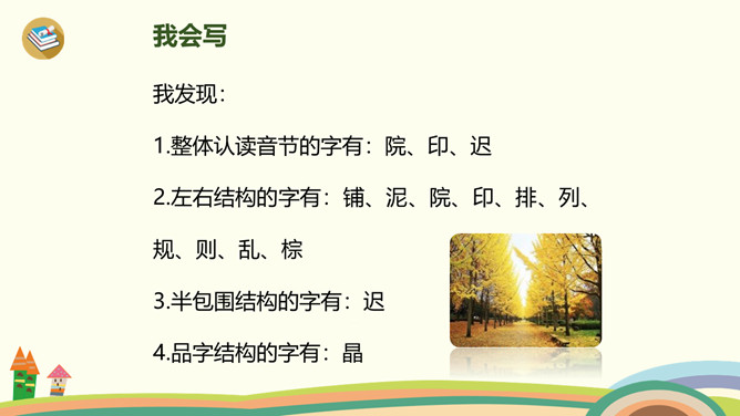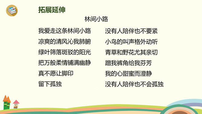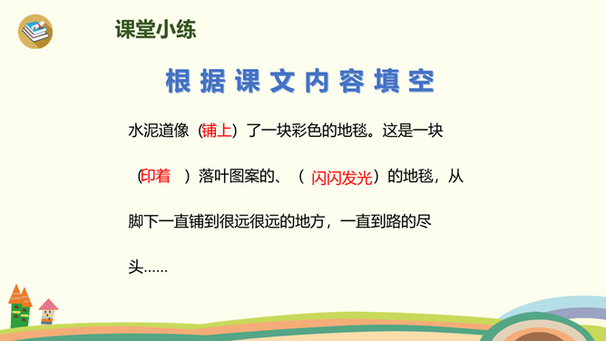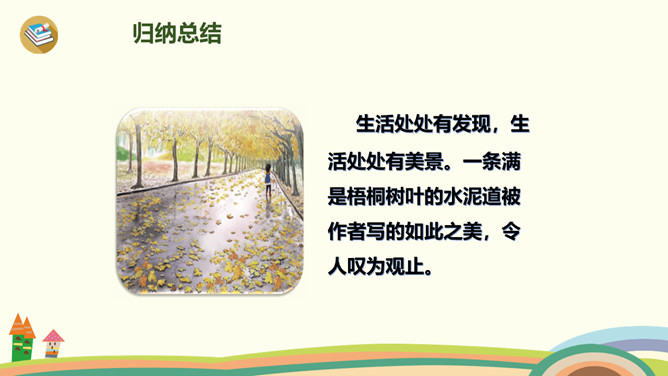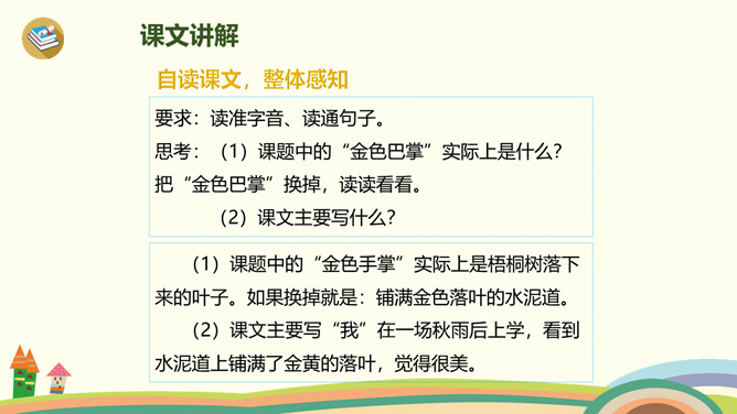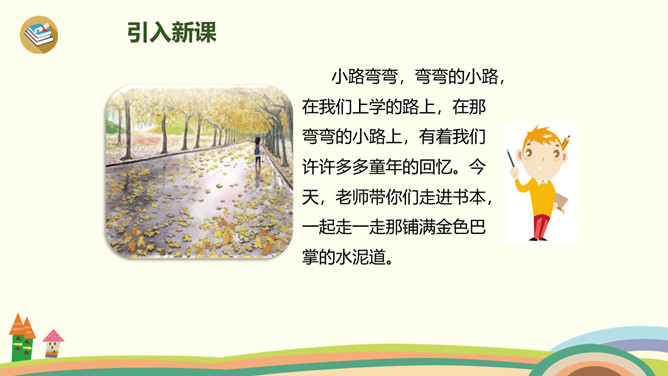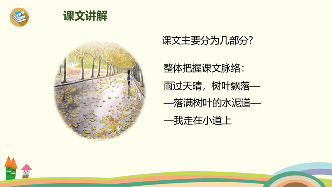 小路弯弯,弯弯的小路,在我们上学的路上,在那弯弯的小路上,有着我们许许多多童年的回忆。今天,老师带你们走进书本,一起走一走那铺满金色巴掌的水泥道。课文主要分为几部分?整体把握课文脉络:雨过天晴,树叶飘落——落满树叶的水泥道——我走在小道上。要求:读准字音、读通句子。思考:(1)课题中的“金色巴掌”实际上是什么?把“金色巴掌”换掉,读读看看。(2)课文主要写什么?所属专题:铺满金色巴掌的水泥道ppt。
