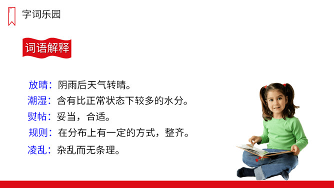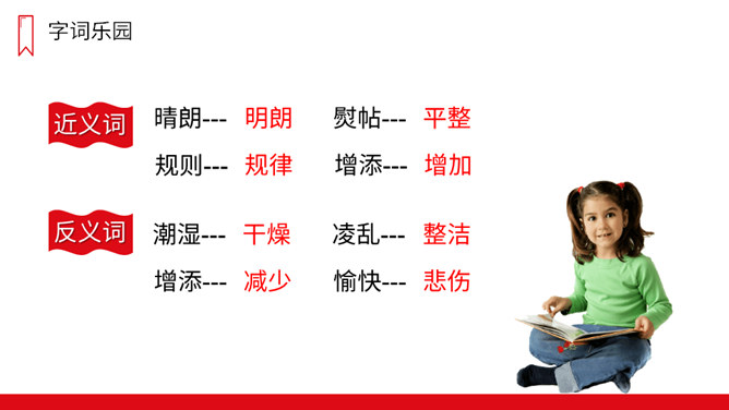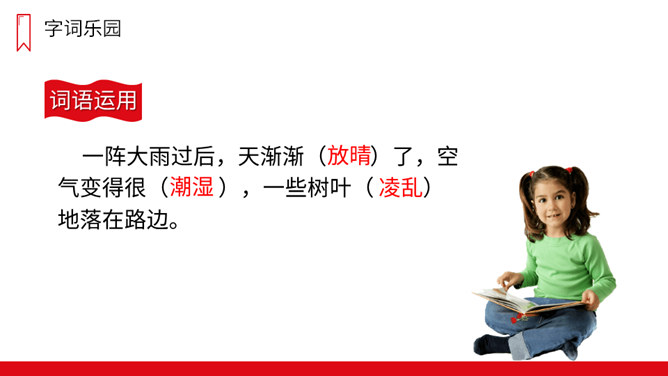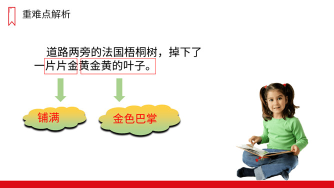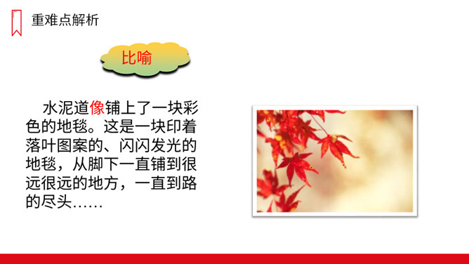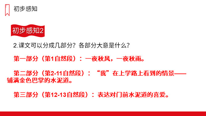 课文可以分成几部分?各部分大意是什么?第一部分(第1自然段):一夜秋风,一夜秋雨。第二部分(第2-11自然段):“我”在上学路上看到的情景——铺满金色巴掌的水泥道。第三部分(第12-13自然段):表达对门前水泥道的喜爱。秋天到了,你在上学放学的路上,观察过马路上的变化吗?是不是多了很多落叶呢?铺满落叶的道路是怎样的?让我们一起去看看吧!放晴:阴雨后天气转晴。规则:在分布上有一定的方式,整齐。所属专题:铺满金色巴掌的水泥道ppt。