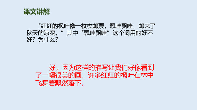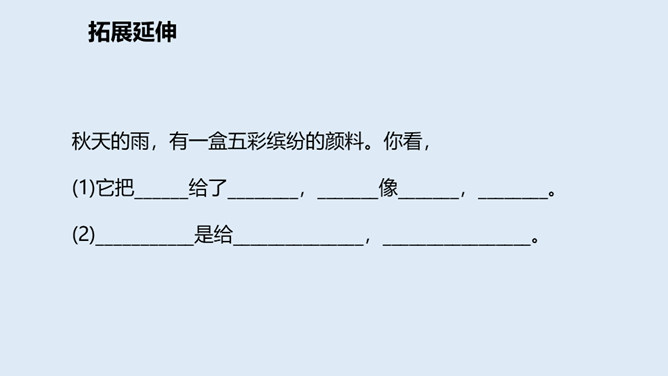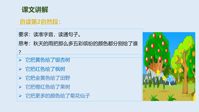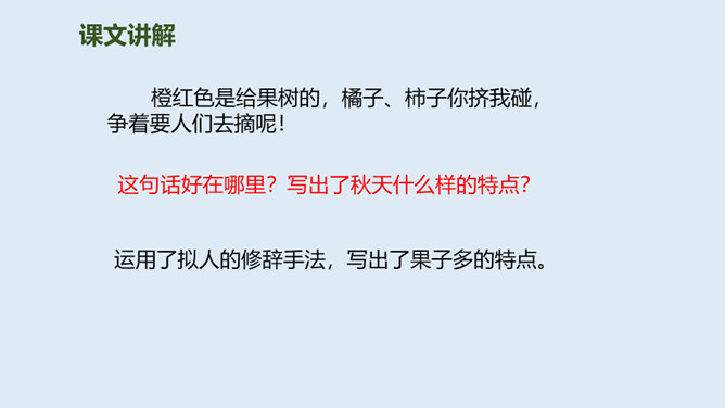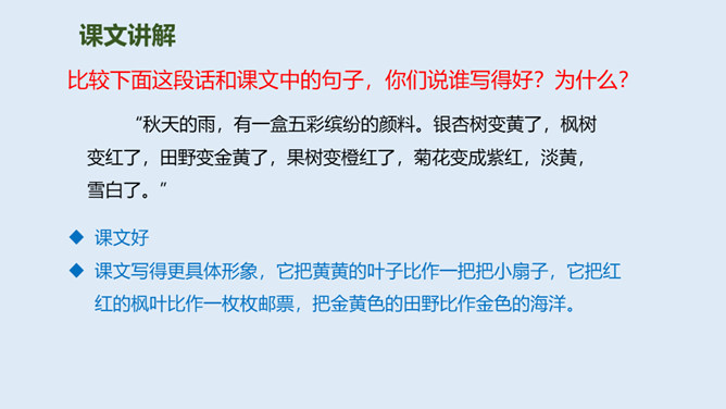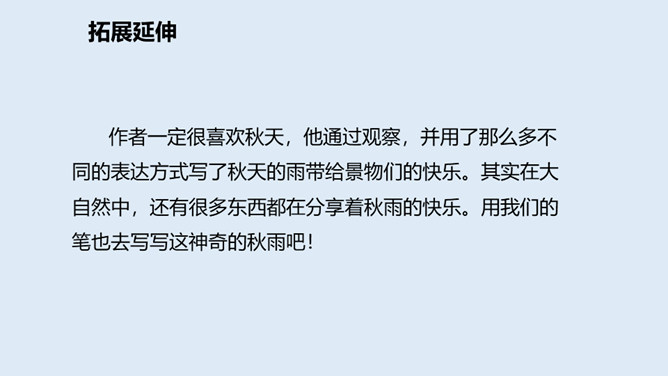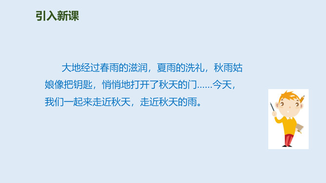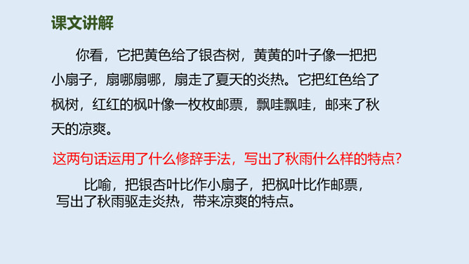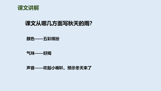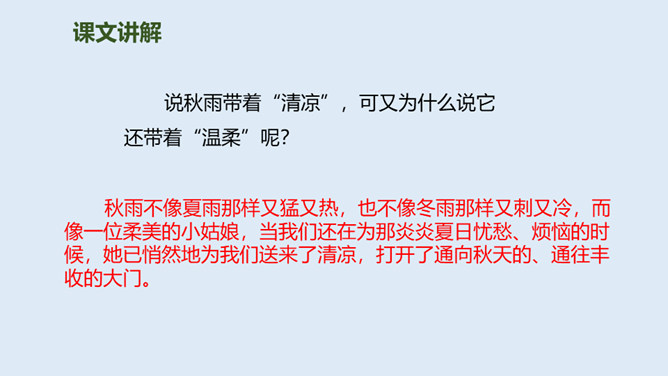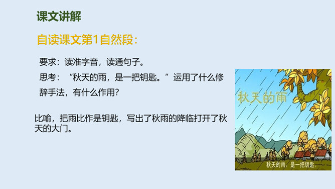 大地经过春雨的滋润,夏雨的洗礼,秋雨姑娘像把钥匙,悄悄地打开了秋天的门……今天,我们一起来走近秋天,走近秋天的雨。要求:读准字音,读通句子。思考:“秋天的雨,是一把钥匙。”运用了什么修辞手法,有什么作用?比喻,把雨比作是钥匙,写出了秋雨的降临打开了秋天的大门。说秋雨带着“清凉”,可又为什么说它还带着“温柔”呢?秋雨不像夏雨那样又猛又热,也不像冬雨那样又刺又冷,而像一位柔美的小姑娘,当我们还在为那炎炎夏日忧愁、烦恼的时候,她已悄然地为我们送来了清凉,打开了通向秋天的、通往丰收的大门。所属专题:秋天的雨ppt。