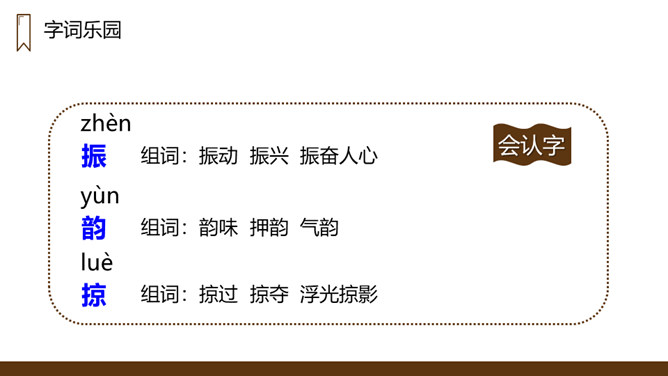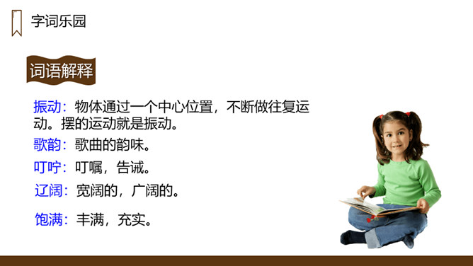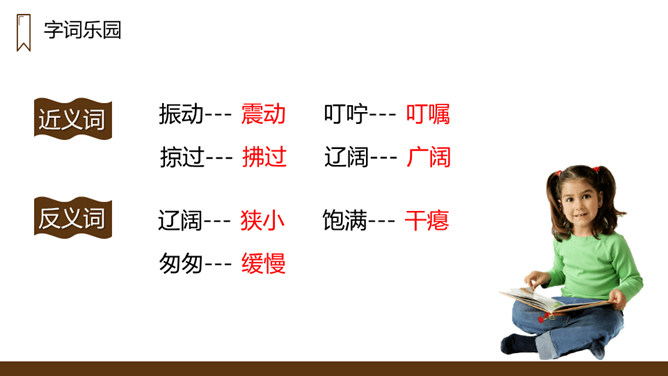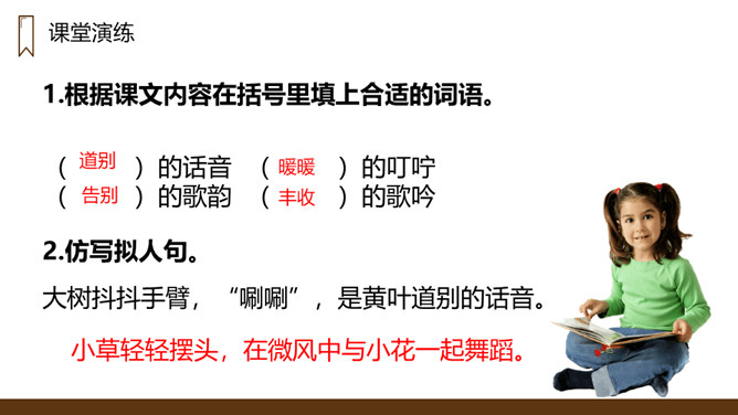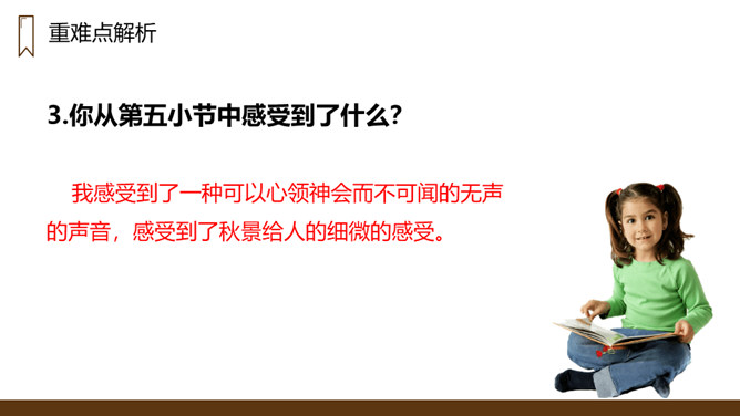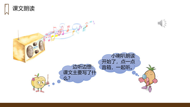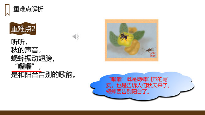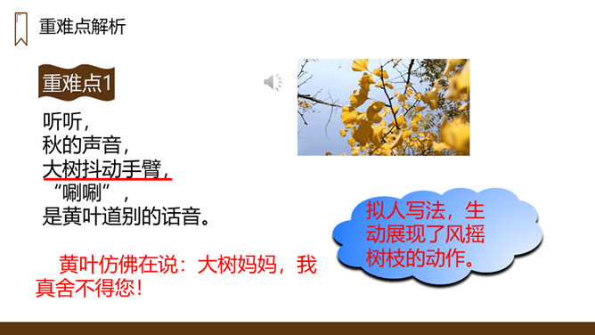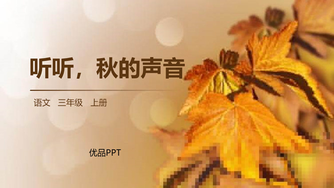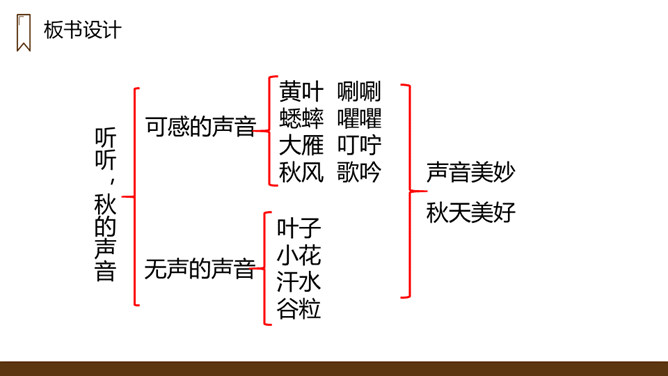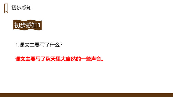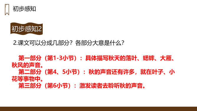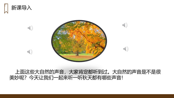 上面这些大自然的声音,大家肯定都听到过。大自然的声音是不是很美妙呢?今天让我们一起来听一听秋天都有哪些声音!课文主要写了秋天里大自然的一些声音。课文可以分成几部分?各部分大意是什么?第一部分(第1-3小节):具体描写秋天的落叶、蟋蟀、大雁、秋风的声音。第二部分(第4、5小节):秋的声音还有许多,就在叶子、小花等事物中。第三部分(第6小节):激发读者去聆听秋的声音。所属专题:听听秋的声音ppt。