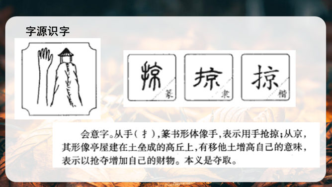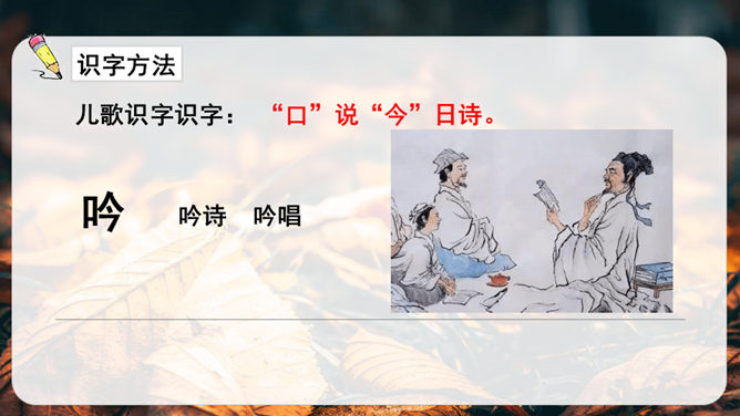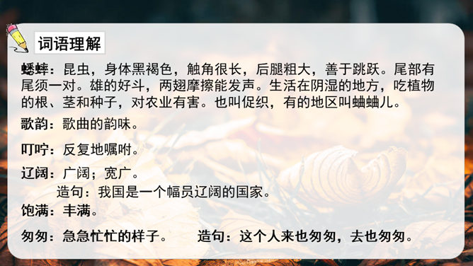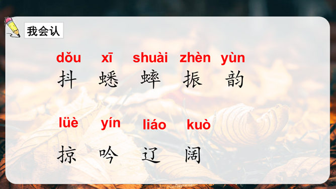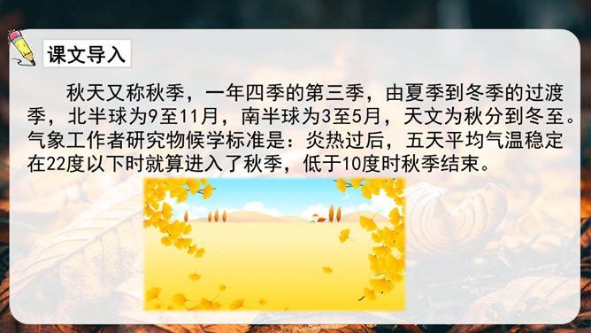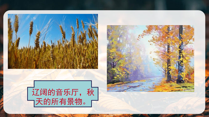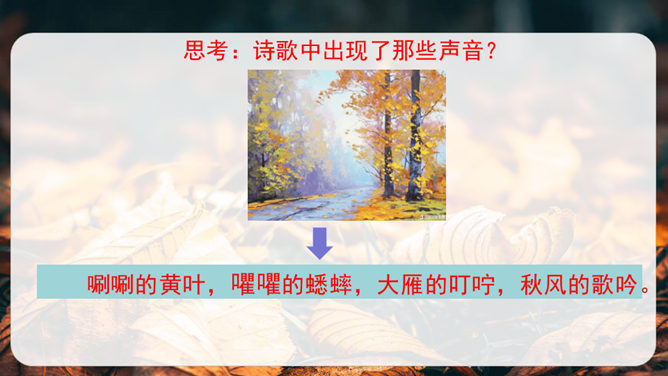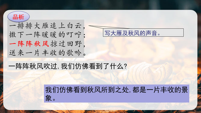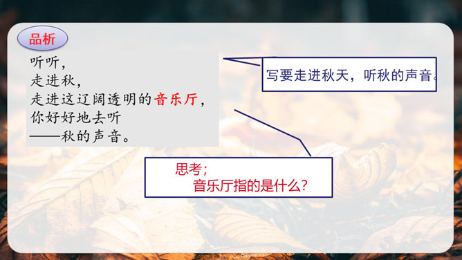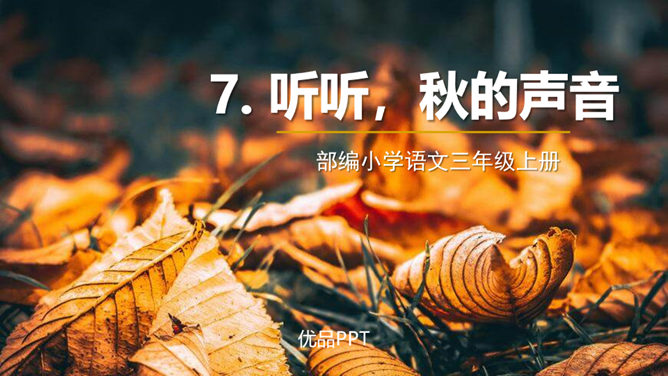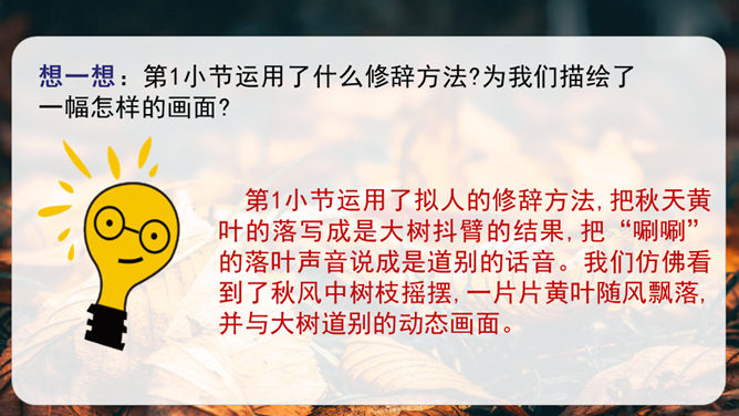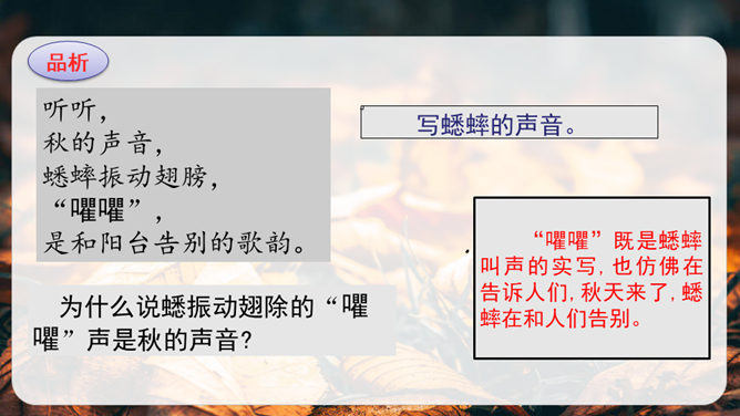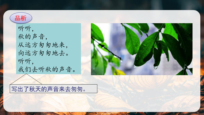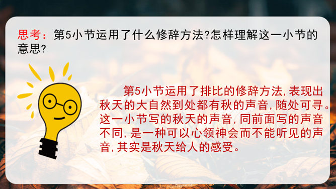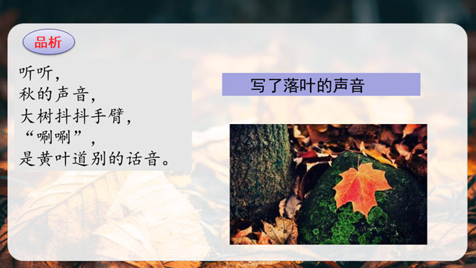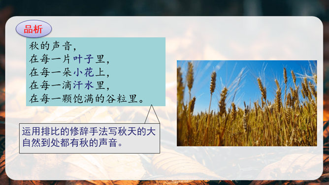 第1小节运用了什么修辞方法?为我们描绘了一幅怎样的画面?第1小节运用了拟人的修辞方法,把秋天黄叶的落写成是大树抖臂的结果,把“唰唰”的落叶声音说成是道别的话音。我们仿佛看到了秋风中树枝摇摆,一片片黄叶随风飘落,并与大树道别的动态画面。第5小节运用了排比的修辞方法,表现出秋天的大自然到处都有秋的声音,随处可寻。这一小节写的秋天的声音,同前面写的声音不同,是一种可以心领神会而不能听见的声音,其实是秋天给人的感受。所属专题:听听秋的声音ppt。