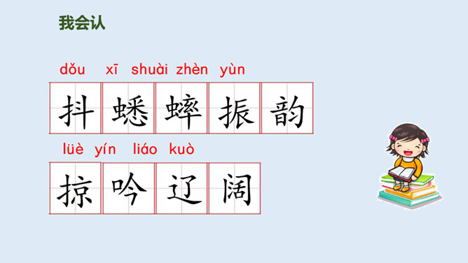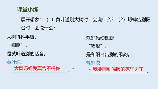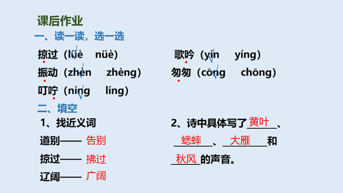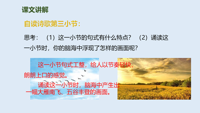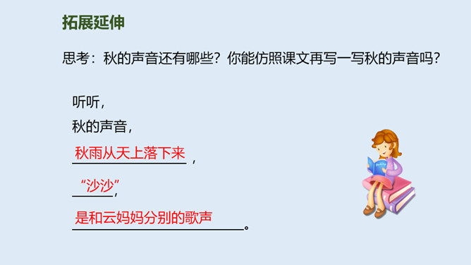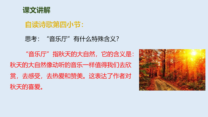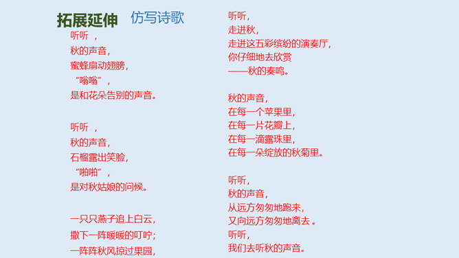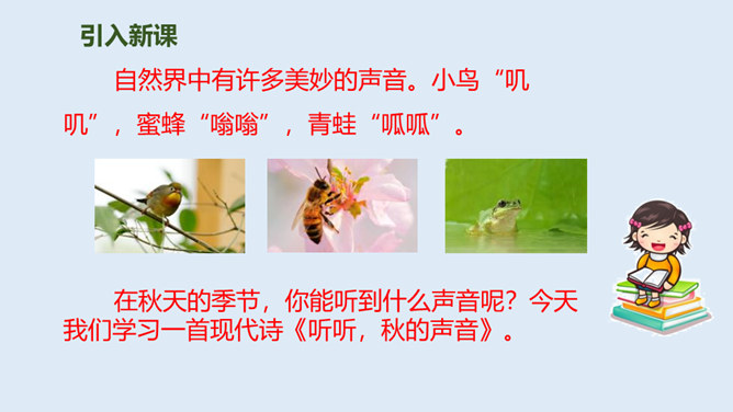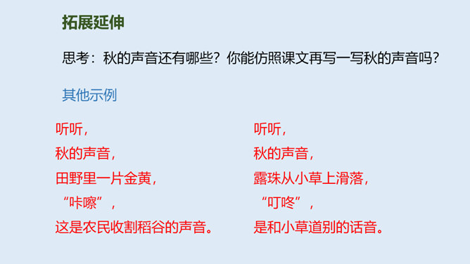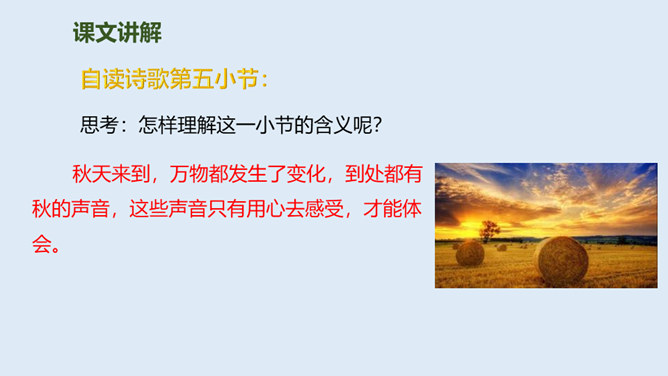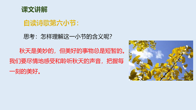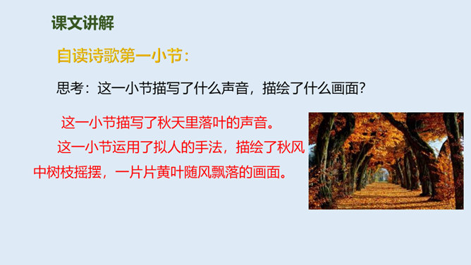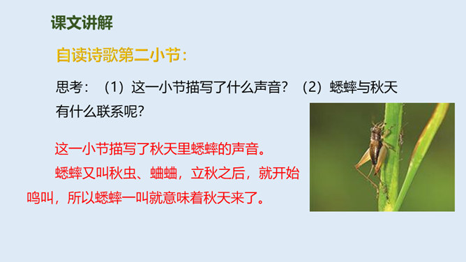 自然界中有许多美妙的声音。小鸟“叽叽”,蜜蜂“嗡嗡”,青蛙“呱呱”。在秋天的季节,你能听到什么声音呢?今天我们学习一首现代诗。思考:这一小节描写了什么声音,描绘了什么画面?这一小节描写了秋天里落叶的声音。这一小节运用了拟人的手法,描绘了秋风中树枝摇摆,一片片黄叶随风飘落的画面。思考:(1)这一小节描写了什么声音?(2)蟋蟀与秋天有什么联系呢?这一小节描写了秋天里蟋蟀的声音。蟋蟀又叫秋虫、蛐蛐,立秋之后,就开始鸣叫,所以蟋蟀一叫就意味着秋天来了。所属专题:听听秋的声音ppt。