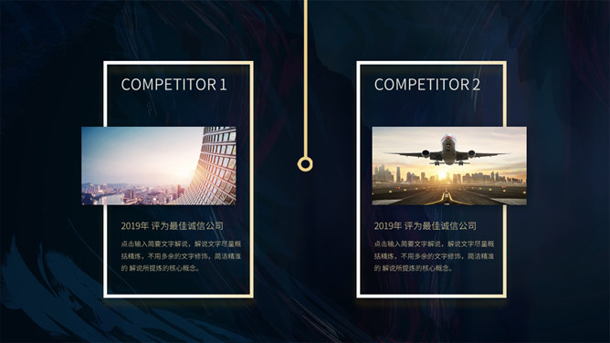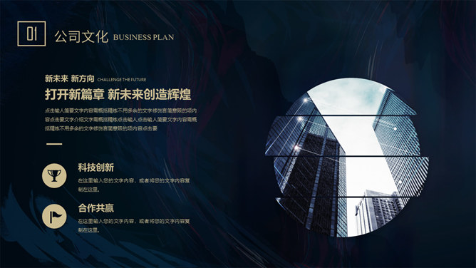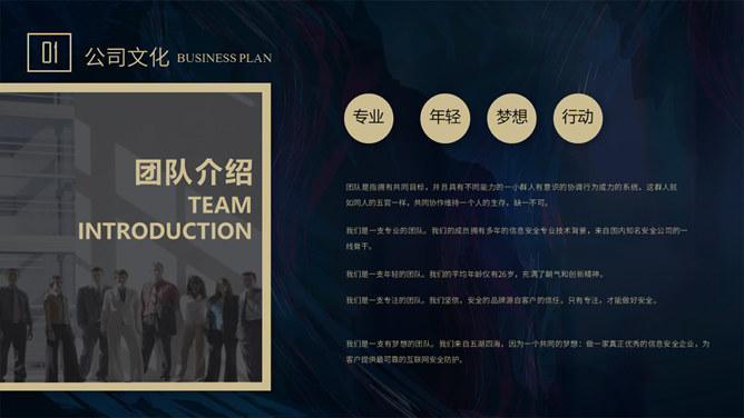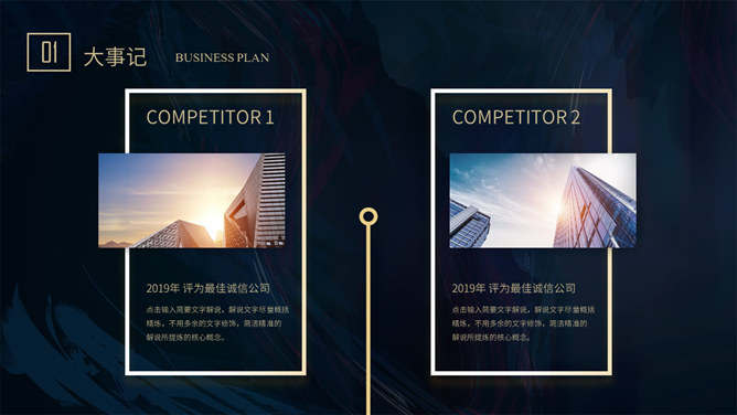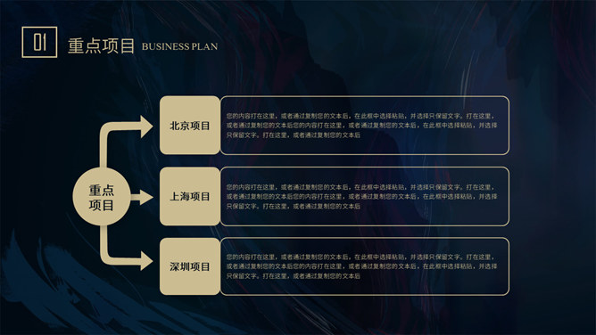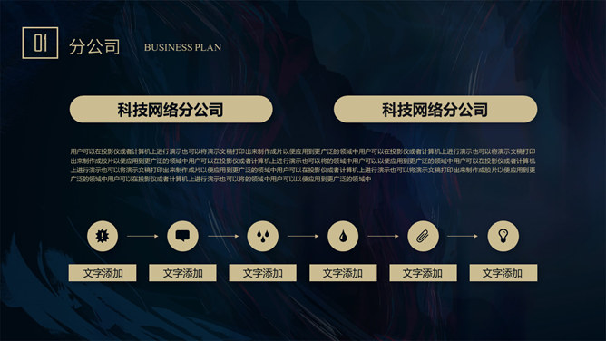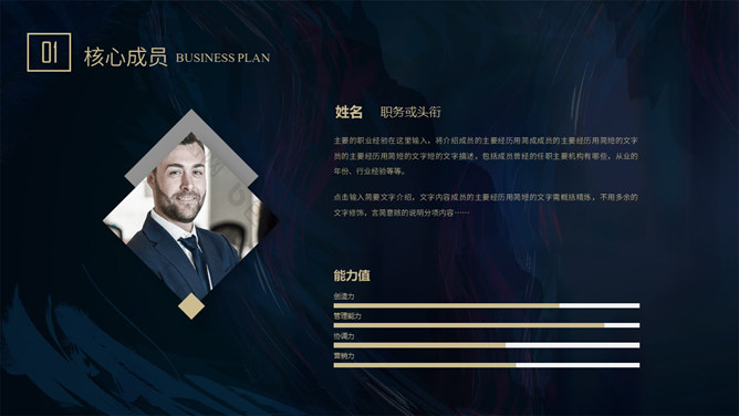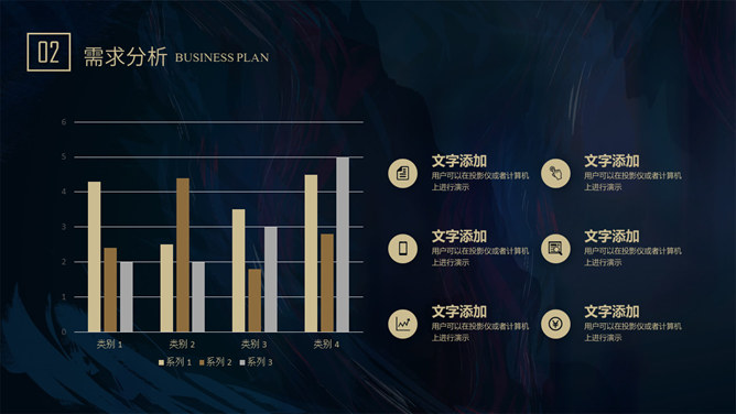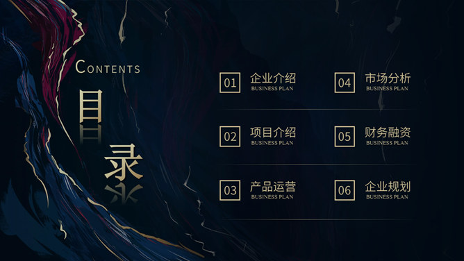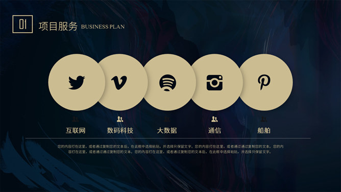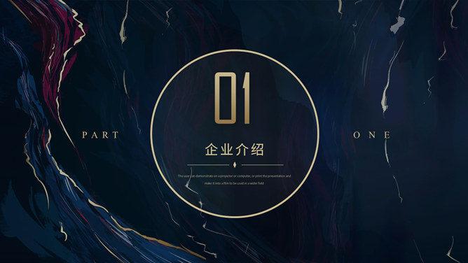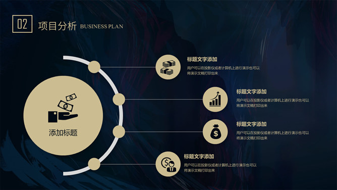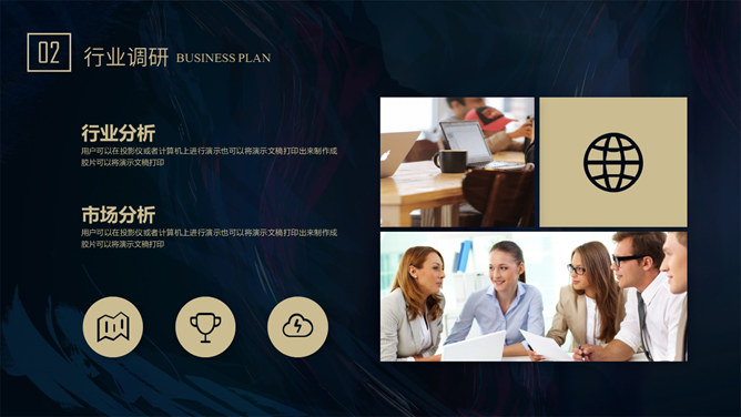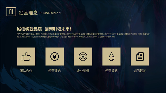 质感高端商业计划书PPT模板。一套大气商务风格幻灯片模板,深蓝艺术纹理背景,暗金主色调,适合商务场合。