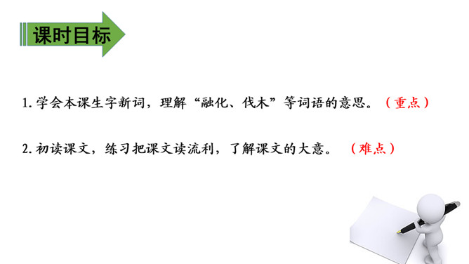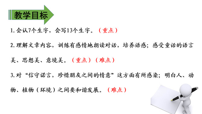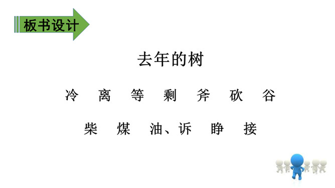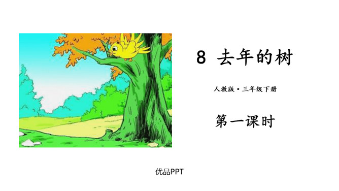 教学目标:1.会认7个生字,会写13个生字。(重点)2.理解文章内容,训练有感情地朗读对话,培养语感;感受童话的语言美、思想美、意境美。(重点)(难点)3.对“信守诺言,珍惜朋友之间的情意”这方面有所感染;明白人、动物、植物(环境)之间要和谐发展。(难点)课时目标:1.学会本课生字新词,理解“融化、伐木”等词语的意思。(重点)2.初读课文,练习把课文读流利,了解课文的大意。 (难点)所属专题:去年的树ppt。