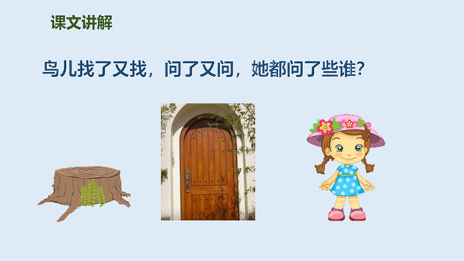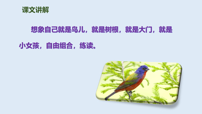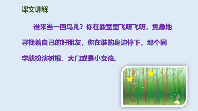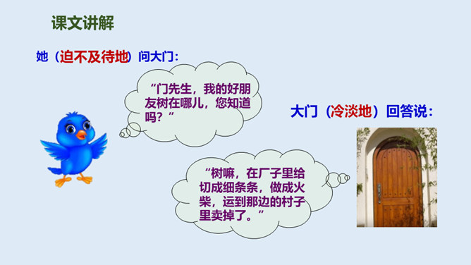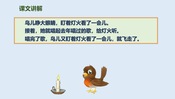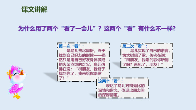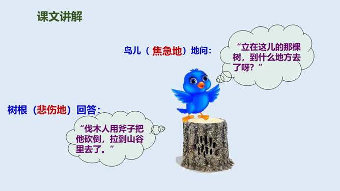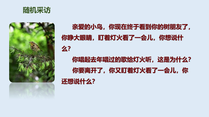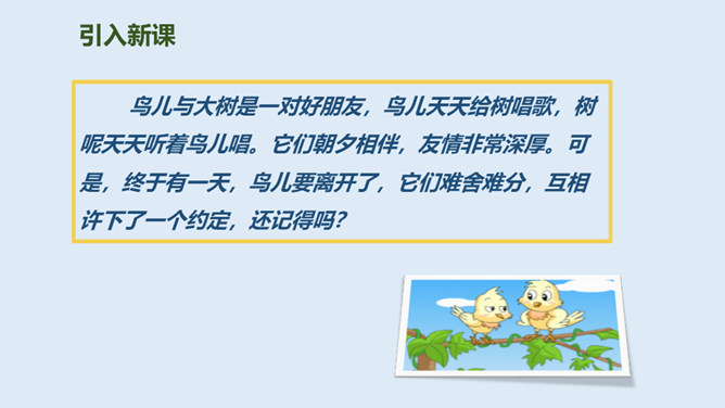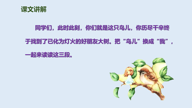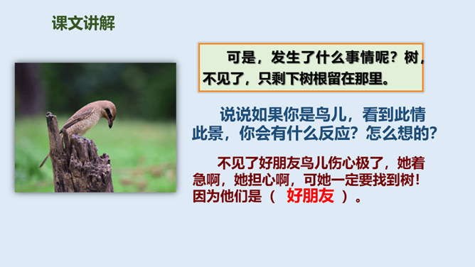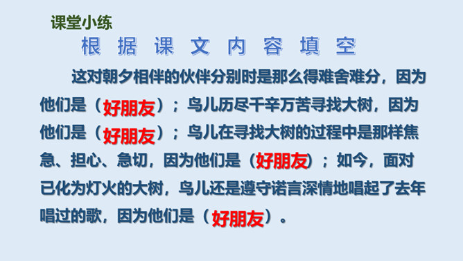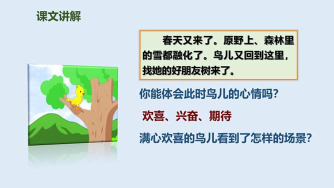 鸟儿与大树是一对好朋友,鸟儿天天给树唱歌,树呢天天听着鸟儿唱。它们朝夕相伴,友情非常深厚。可是,终于有一天,鸟儿要离开了,它们难舍难分,互相许下了一个约定,还记得吗?说说如果你是鸟儿,看到此情此景,你会有什么反应?怎么想的?同学们,此时此刻,你们就是这只鸟儿,你历尽千辛终于找到了已化为灯火的好朋友大树。把“鸟儿”换成“我”,一起来读读这三段。课文学到这儿,你还有什么话要说吗?想对谁说?所属专题:去年的树ppt。