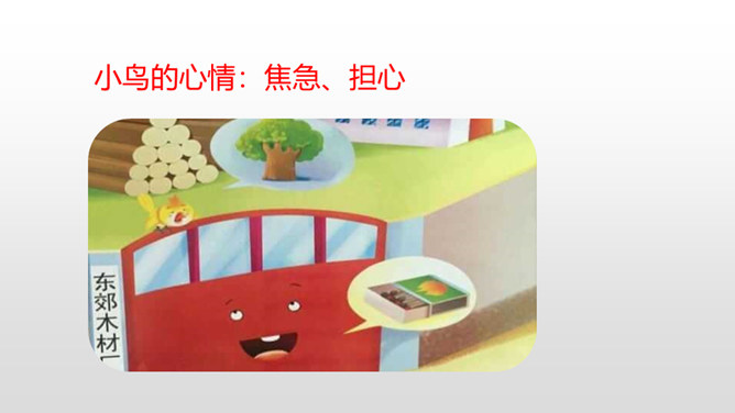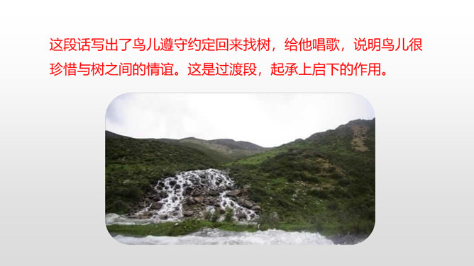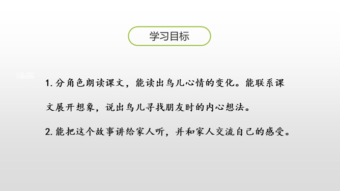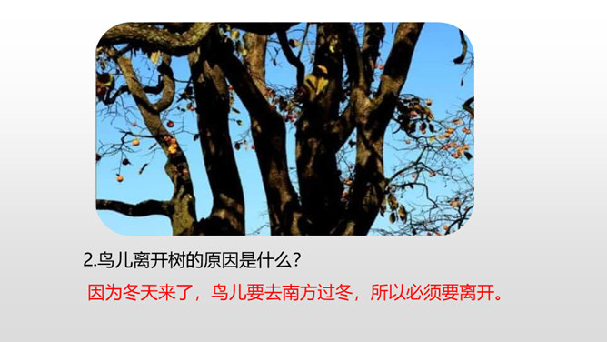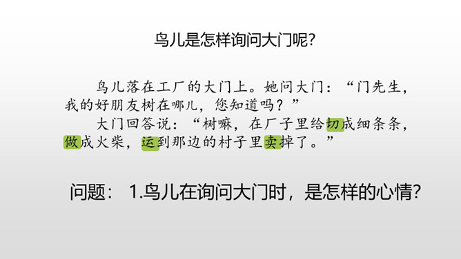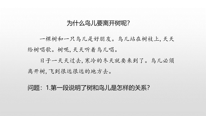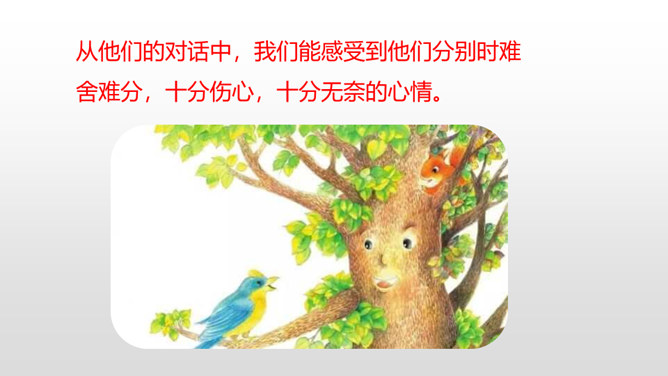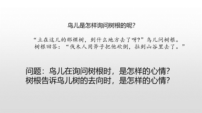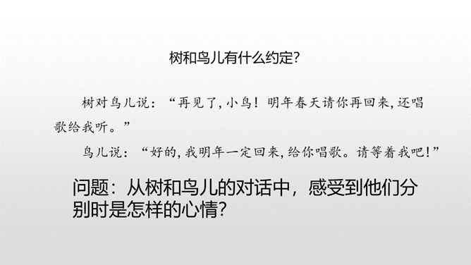 1.分角色朗读课文,能读出鸟儿心情的变化。能联系课文展开想象,说出鸟儿寻找朋友时的内心想法。2.能把这个故事讲给家人听,并和家人交流自己的感受。 问题:1.第一段说明了树和鸟儿是怎样的关系?问题:从树和鸟儿的对话中,感受到他们分别时是怎样的心情?问题:1.第一段话写出了什么?在文中的作用是什么?问题:鸟儿在询问树根时,是怎样的心情?树根告诉鸟儿树的去向时,是怎样的心情?所属专题:去年的树ppt。