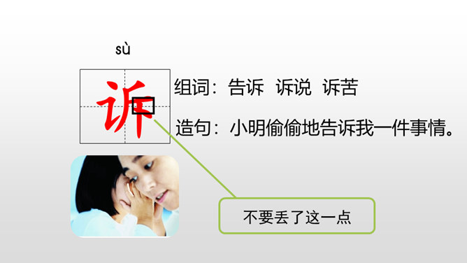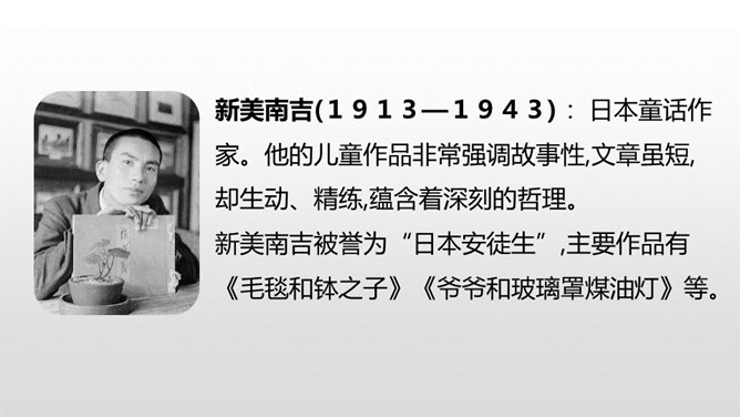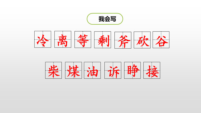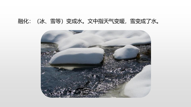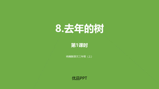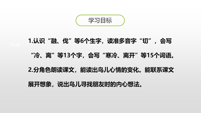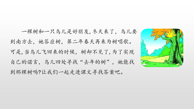 学习目标:1.认识“融、伐”等6个生字,读准多音字“切”,会写“冷、离”等13个字,会写“寒冷、离开”等15个词语。2.分角色朗读课文,能读出鸟儿心情的变化。能联系课文展开想象,说出鸟儿寻找朋友时的内心想法。一棵树和一只鸟儿是好朋友,冬天来了,鸟儿要到南方去,她答应树,第二年春天再来为树唱歌。可是,当鸟儿飞回来的时候,树却不见了,为了实现自己的诺言,鸟儿四处寻找“去年的树”,她能找到那棵树吗?让我们一起走进课文寻找答案吧。所属专题:去年的树ppt。