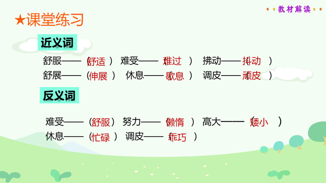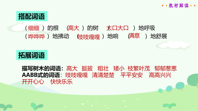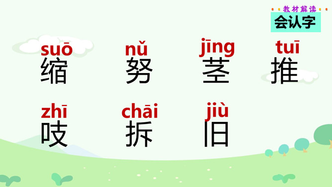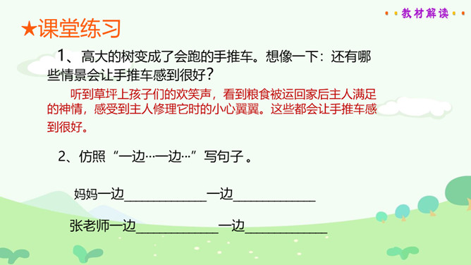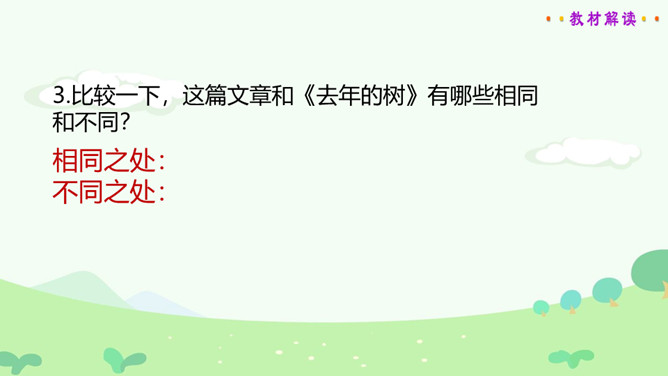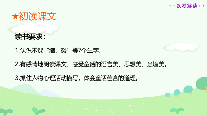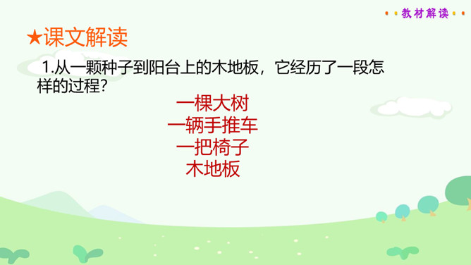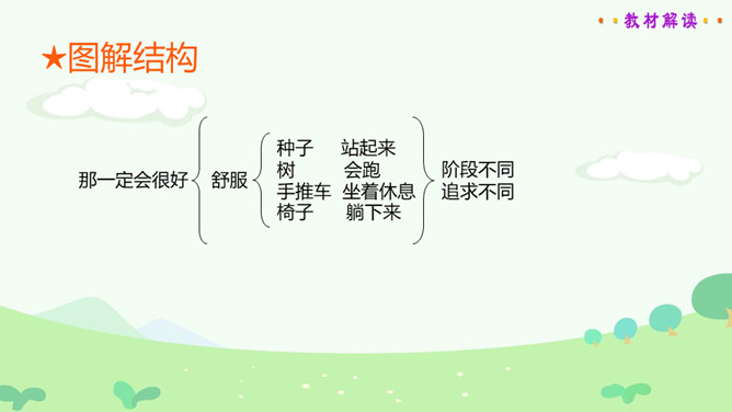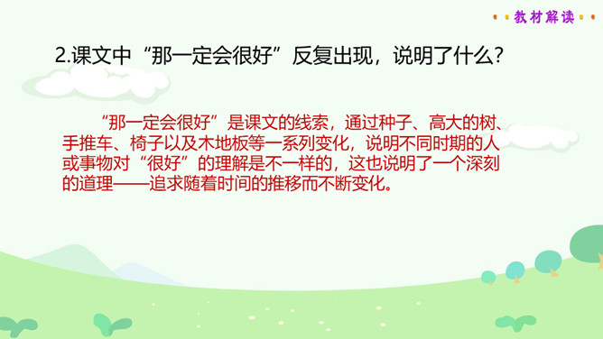 读书要求:1.认识本课“缩、努”等7个生字。2.有感情地朗读课文,感受童话的语言美、思想美、意境美。3.抓住人物心理活动描写,体会童话蕴含的道理。从一颗种子到阳台上的木地板,它经历了一段怎样的过程?课文中“那一定会很好”反复出现,说明了什么?“那一定会很好”是课文的线索,通过种子、高大的树、手推车、椅子以及木地板等一系列变化,说明不同时期的人或事物对“很好”的理解是不一样的,这也说明了一个深刻的道理——追求随着时间的推移而不断变化。所属专题:那一定会很好ppt。