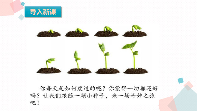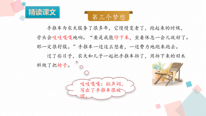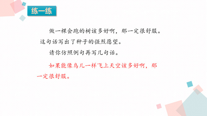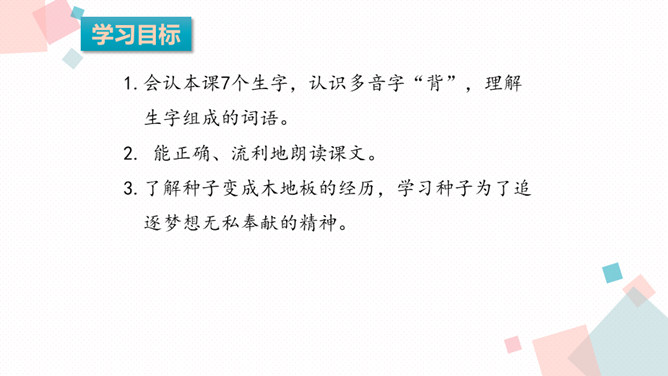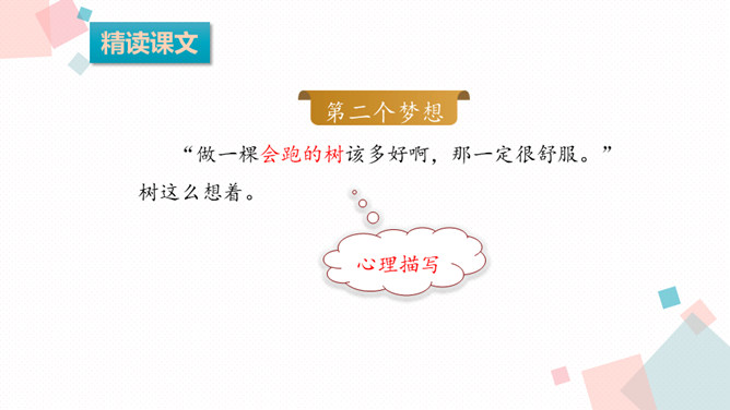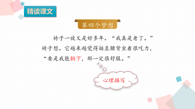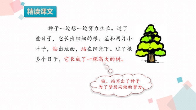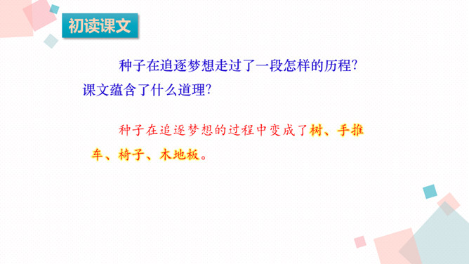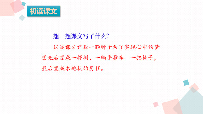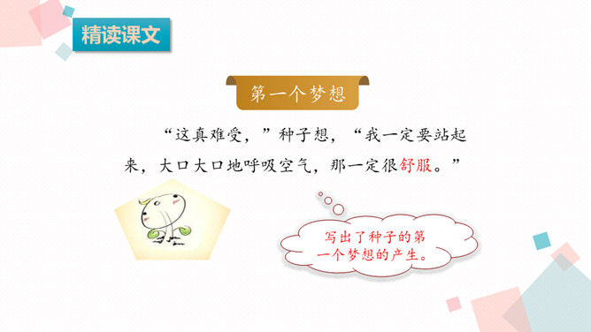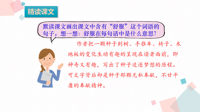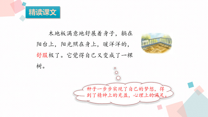 想一想课文写了什么?这篇课文记叙一颗种子为了实现心中的梦想先后变成一棵树、一辆手推车、一把椅子,最后变成木地板的历程。种子在追逐梦想走过了一段怎样的历程?课文蕴含了什么道理?种子在追逐梦想的过程中变成了树、手推车、椅子、木地板。钻、站写出了种子为了梦想而做的努力。种子一步步实现了自己的梦想,得到了精神上的充盈,心理上的满足。默读课文画出课文中含有“舒服”这个词语的句子,想一想:舒服在每句话中是什么意思?所属专题:那一定会很好ppt。