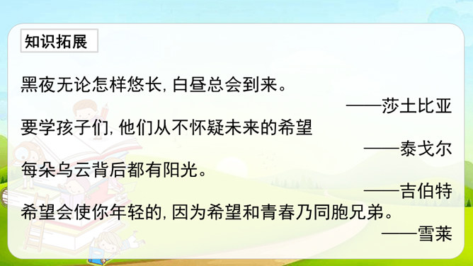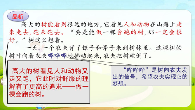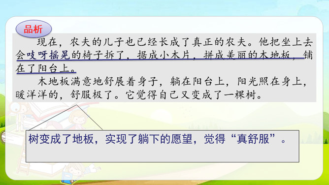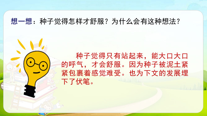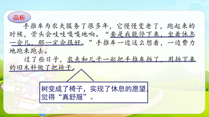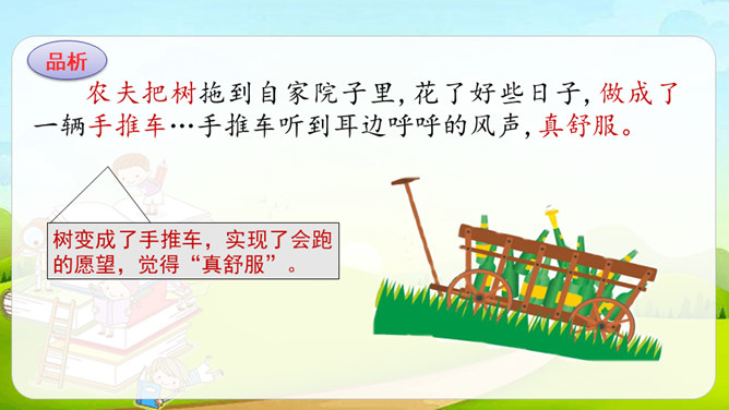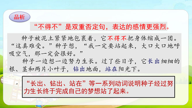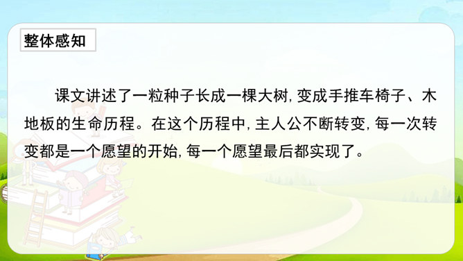 “不得不”是双重否定句,表达的感情更强烈。“长出、钻出、站在”等一系列动词说明种子经过努力生长终于完成自己的梦想站了起来。想一想:种子觉得怎样才舒服?为什么会有这种想法?种子觉得只有站起来,能大口大口的呼气,才会舒服。因为种子被泥土紧紧包裹着感觉难受。也为下文的发展埋下了伏笔。阅读第一部分(第1-3自然段):种子长成大树的经历。阅读第二部分(第4-7自然段):大树变成手推车的历程。所属专题:那一定会很好ppt。