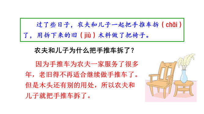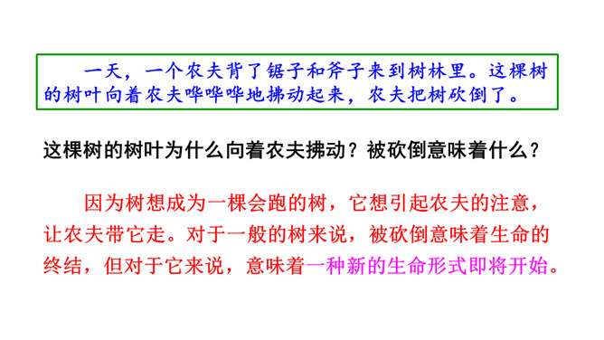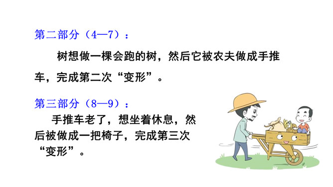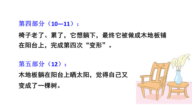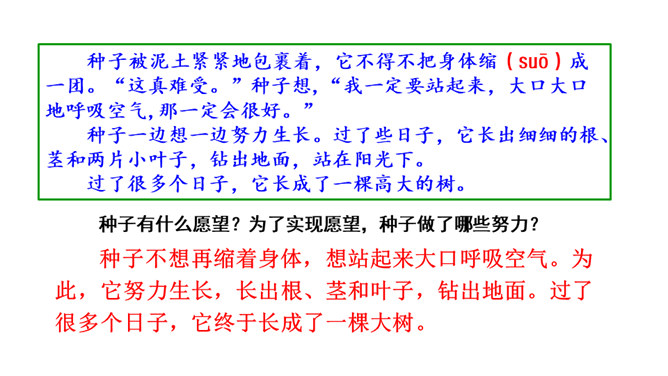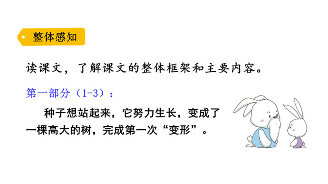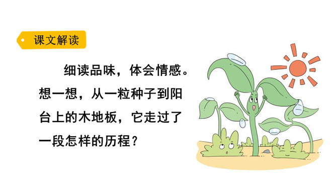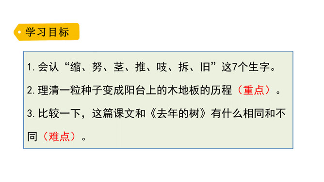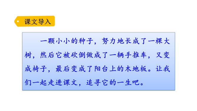 一颗小小的种子,努力地长成了一棵大树,然后它被砍倒做成了一辆手推车,又变成椅子,最后变成了阳台上的木地板。让我们一起走进课文,追寻它的一生吧。1.会认“缩、努、茎、推、吱、拆、旧”这7个生字。2.理清一粒种子变成阳台上的木地板的历程(重点)。3.比较一下,这篇课文和《去年的树》有什么相同和不同(难点)。种子不想再缩着身体,想站起来大口呼吸空气。为此,它努力生长,长出根、茎和叶子,钻出地面。过了很多个日子,它终于长成了一棵大树。所属专题:那一定会很好ppt。