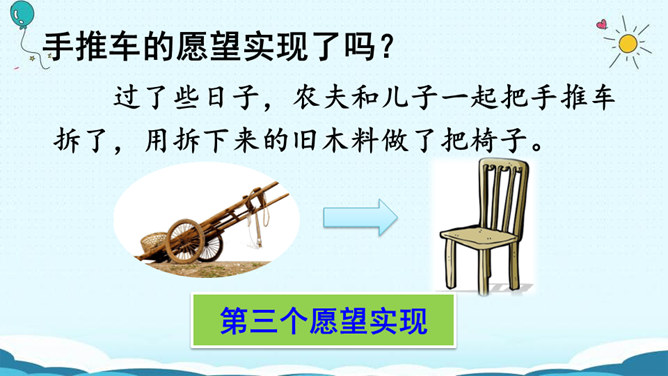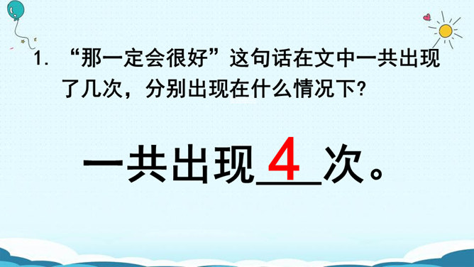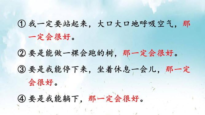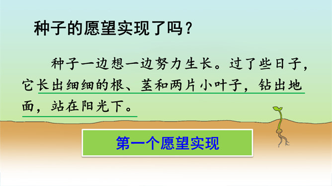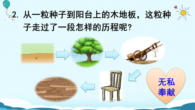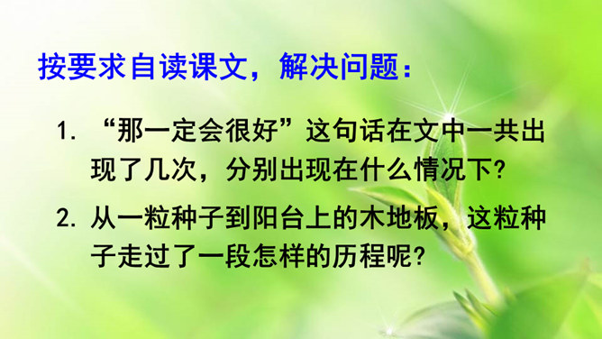 按要求自读课文,解决问题:“那一定会很好”这句话在文中一共出现了几次,分别出现在什么情况下?从一粒种子到阳台上的木地板,这粒种子走过了一段怎样的历程呢?从一粒种子到阳台上的木地板,这一过程还反应了什么?这篇文章表达了作者怎样的感情?说说你的看法。还反映了人们生活的变化。“美丽的”不仅写出了木地板本身的美丽,也表达出作者对“一粒种子”无私奉献精神的赞美。所属专题:那一定会很好ppt。