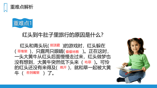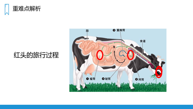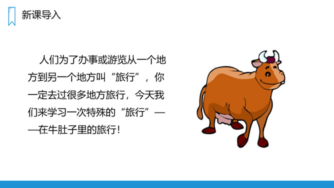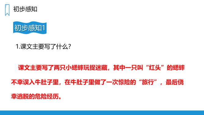 人们为了办事或游览从一个地方到另一个地方叫“旅行”,你一定去过很多地方旅行,今天我们来学习一次特殊的“旅行”——在牛肚子里的旅行!课文主要写了两只小蟋蟀玩捉迷藏,其中一只叫“红头”的蟋蟀不幸误入牛肚子里,在牛肚子里做了一次惊险的“旅行”,最后侥幸逃脱的危险经历。第一部分(第1-7自然段):介绍红头进入牛肚子里的原因。第二部分(第8-20自然段):具体描写红头在牛肚子里的旅行的过程。所属专题:在牛肚子里旅行ppt。