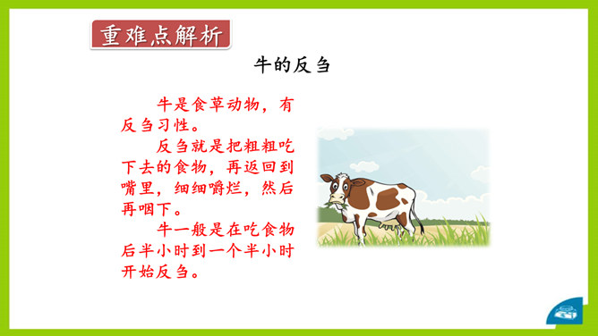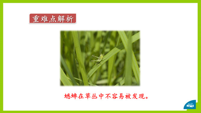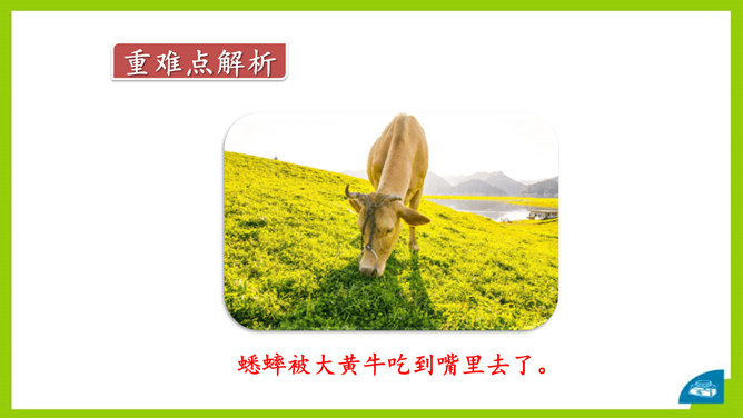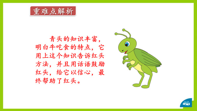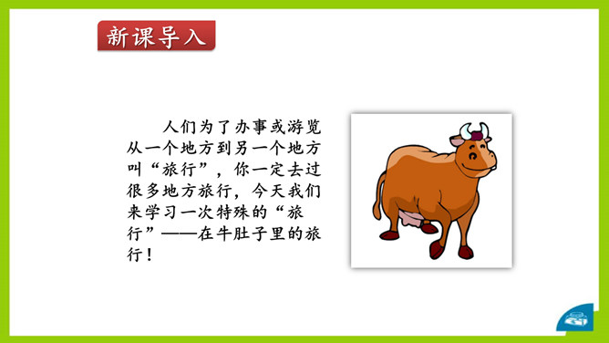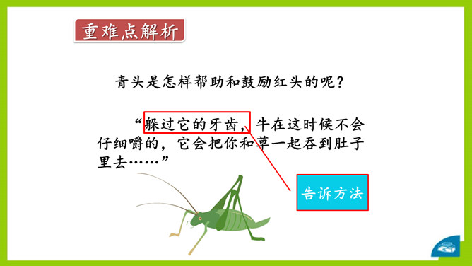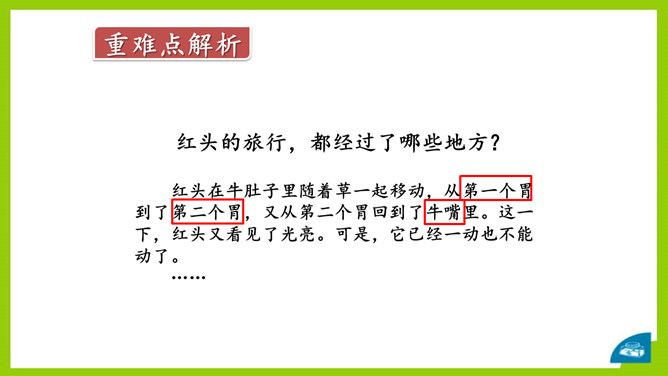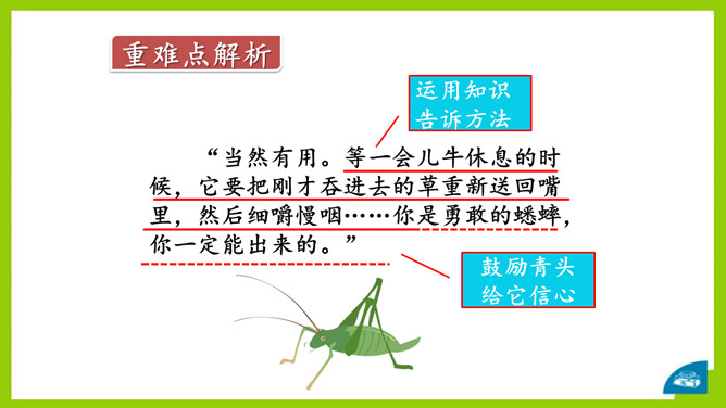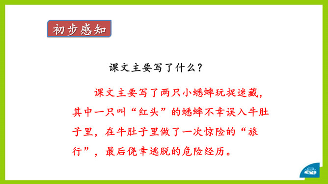课文主要写了什么?课文主要写了两只小蟋蟀玩捉迷藏,其中一只叫“红头”的蟋蟀不幸误入牛肚子里,在牛肚子里做了一次惊险的“旅行”,最后侥幸逃脱的危险经历。想象:红头在心中还会对青头说什么?如果不是你懂得这些知识,我就逃不出来了,你真是一个聪明的好朋友!从红头在牛肚子里旅行中,你有怎样的感悟?知识就是力量,正确地使用知识能够帮助我们战胜困难,所以我们一定要好好学习,多看各种各样的书,做一个博学的人。所属专题:在牛肚子里旅行ppt。