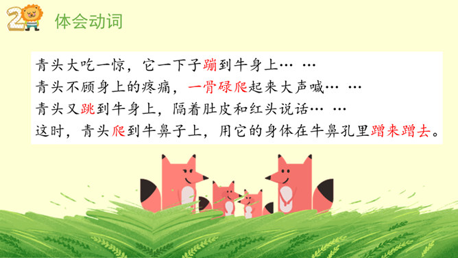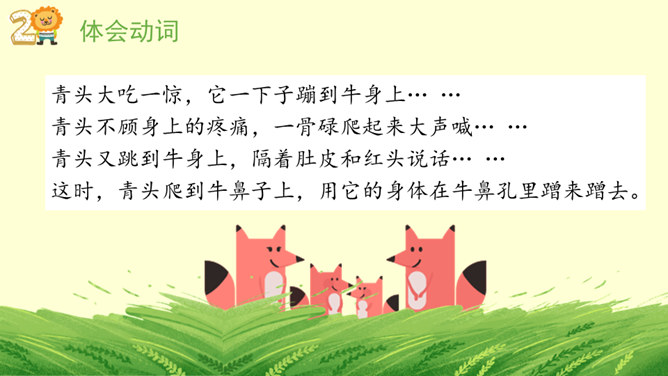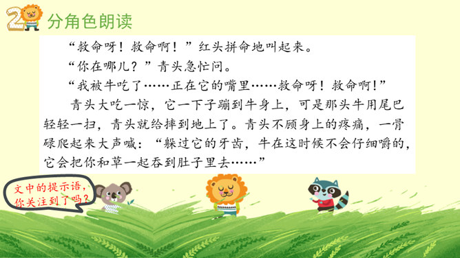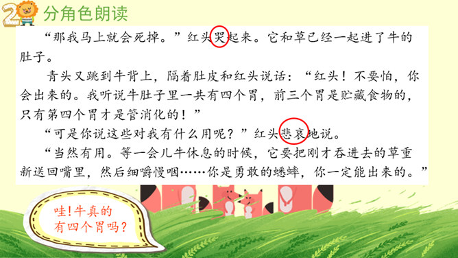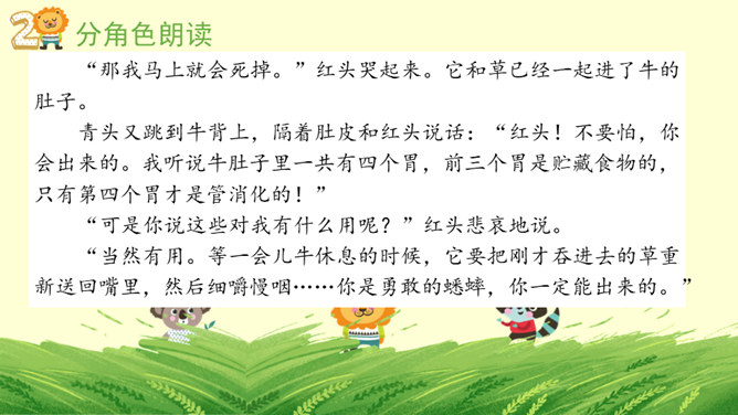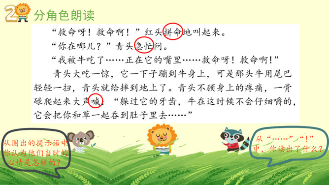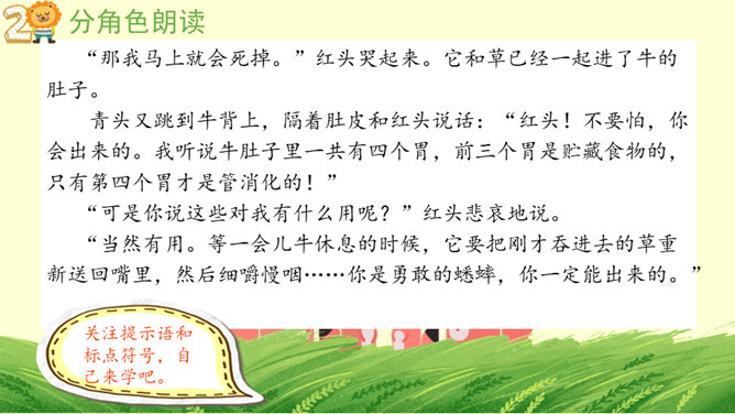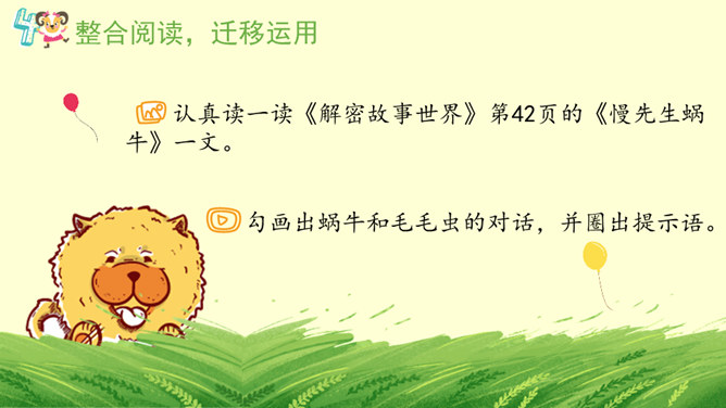 默读课文8-18段,想想青头是怎样指挥红头一步步脱险的,画出相关的句子。文中的提示语,你关注到了吗?从圈出的提示语中你认为他们当时的心情是怎样的?关注提示语和标点符号,自己来学吧。凭借旅行路线,讲讲这个故事吧!认真读一读《解密故事世界》第42页的《慢先生蜗牛》一文。勾画出蜗牛和毛毛虫的对话,并圈出提示语。所属专题:在牛肚子里旅行ppt。
