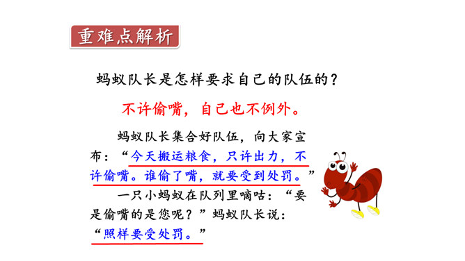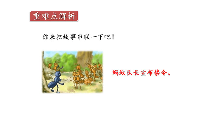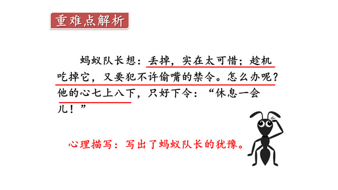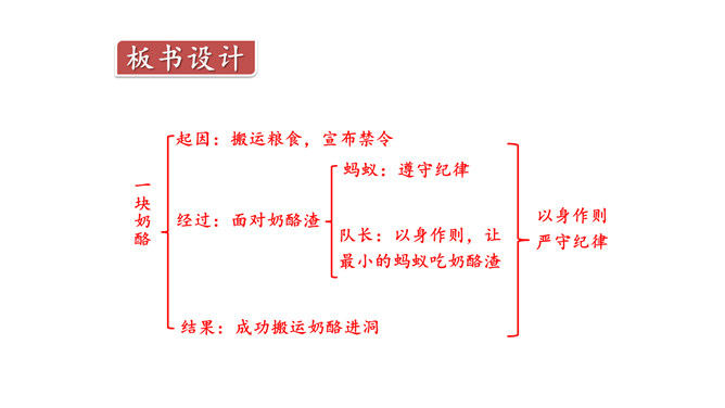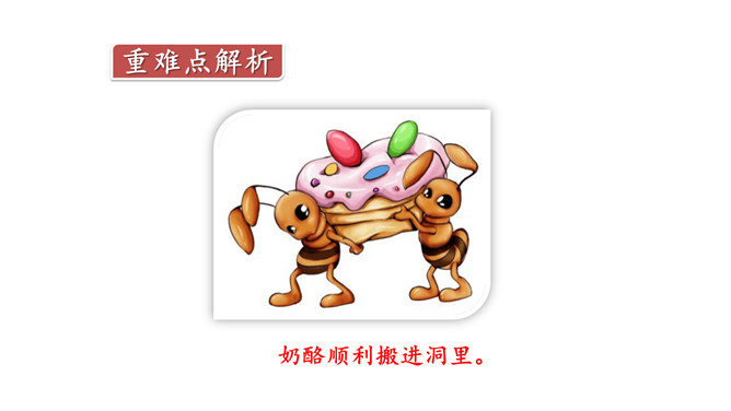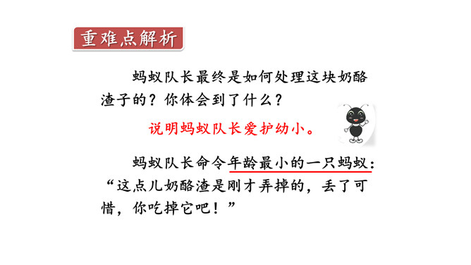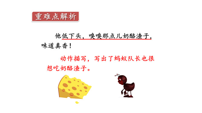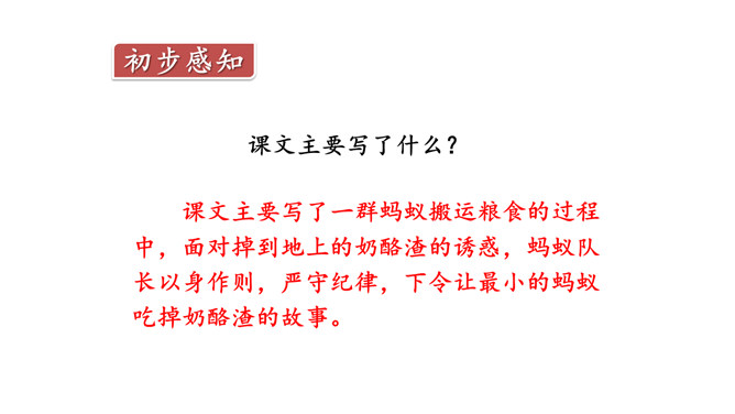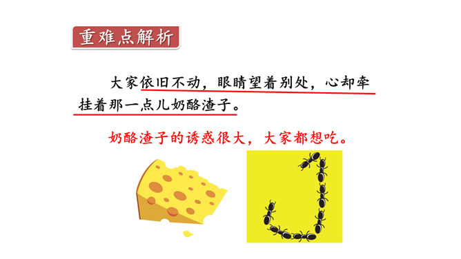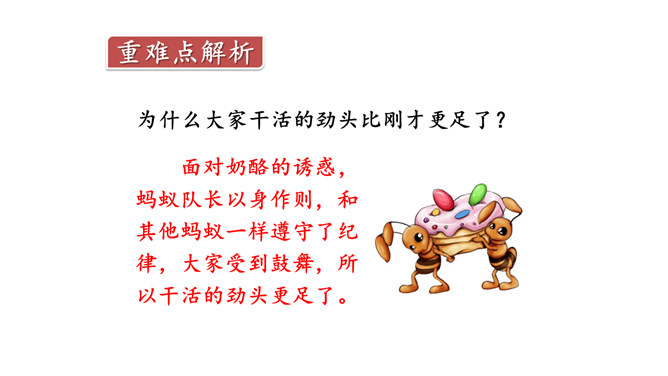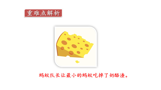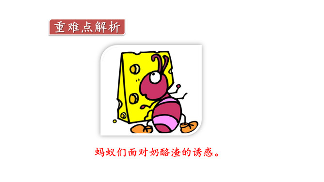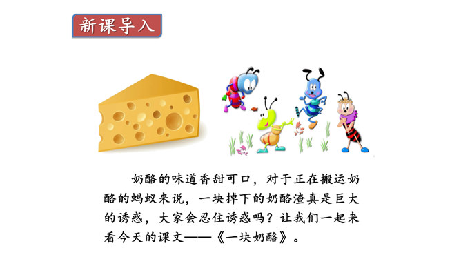 奶酪的味道香甜可口,对于正在搬运奶酪的蚂蚁来说,一块掉下的奶酪渣真是巨大的诱惑,大家会忍住诱惑吗?让我们一起来看今天的课文。课文主要写了什么?课文主要写了一群蚂蚁搬运粮食的过程中,面对掉到地上的奶酪渣的诱惑,蚂蚁队长以身作则,严守纪律,下令让最小的蚂蚁吃掉奶酪渣的故事。为什么大家干活的劲头比刚才更足了?面对奶酪的诱惑,蚂蚁队长以身作则,和其他蚂蚁一样遵守了纪律,大家受到鼓舞,所以干活的劲头更足了。所属专题:一块奶酪ppt。