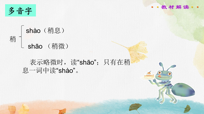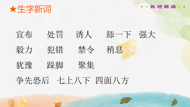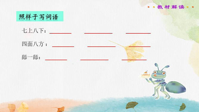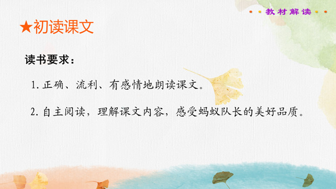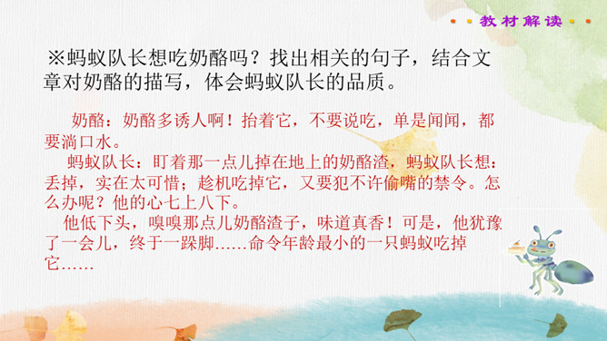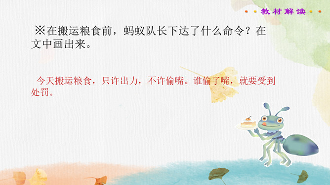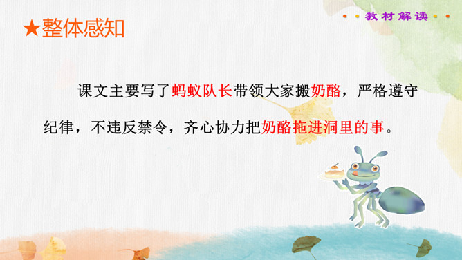 读书要求:1.正确、流利、有感情地朗读课文。2.自主阅读,理解课文内容,感受蚂蚁队长的美好品质。课文主要写了蚂蚁队长带领大家搬奶酪,严格遵守纪律,不违反禁令,齐心协力把奶酪拖进洞里的事。在搬运粮食前,蚂蚁队长下达了什么命令?在文中画出来。蚂蚁队长想吃奶酪吗?找出相关的句子说一说。你喜欢这个蚂蚁队长吗?说说理由。蚂蚁队长想吃奶酪吗?找出相关的句子,结合文章对奶酪的描写,体会蚂蚁队长的品质。所属专题:一块奶酪ppt。