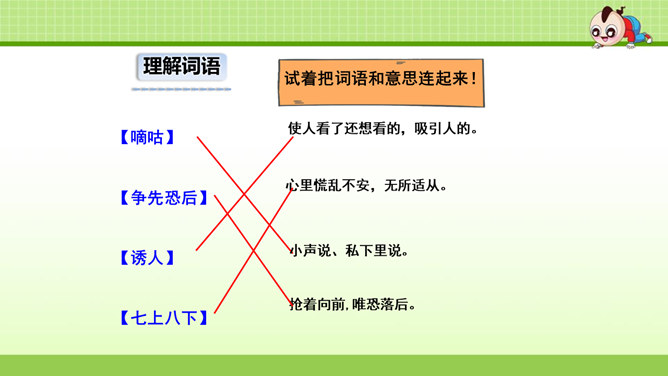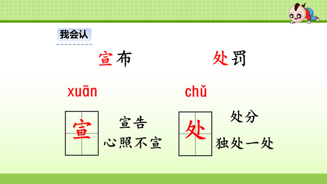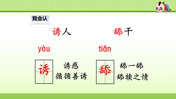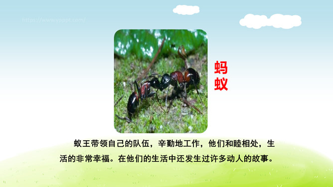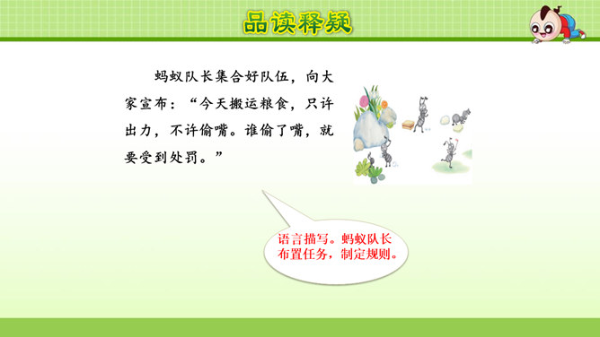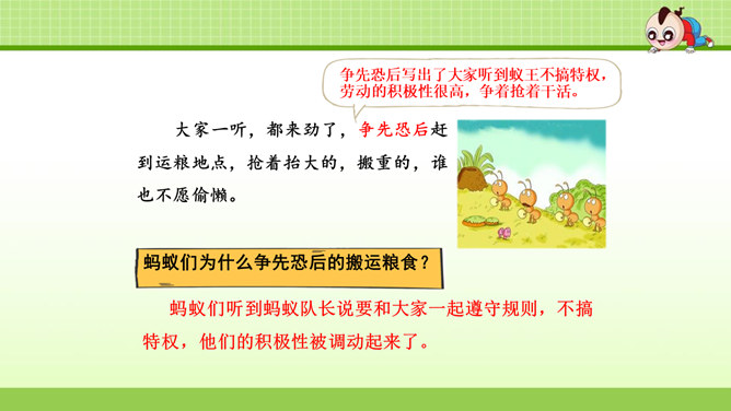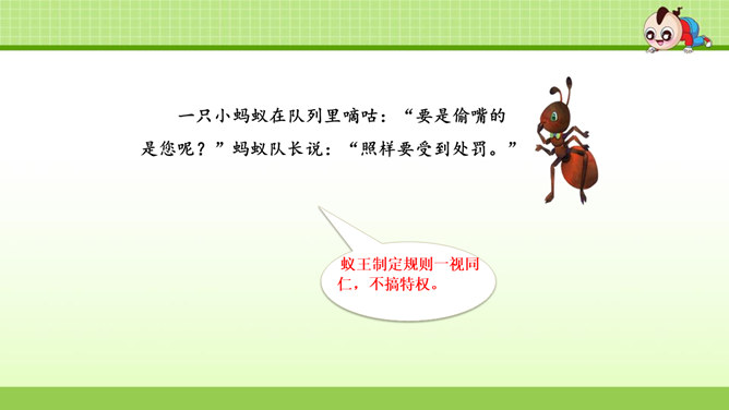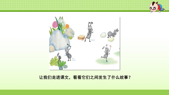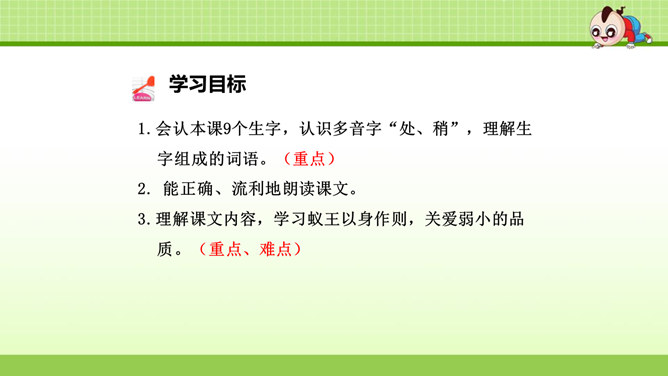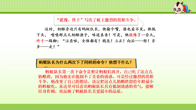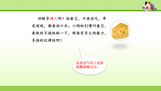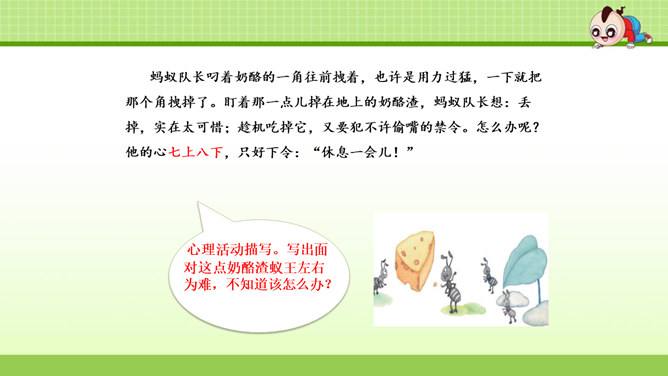 这篇课文叙述了蚂蚁队长在搬运食物时抵制奶酪渣的诱惑,不搞特权,把奶酪渣让给了年龄最小的蚂蚁的事,赞扬了蚂蚁队长以身作则,关爱弱小的品质。这篇课文是一个童话故事。讲的是蚁王带领自己的队伍搬运粮食的事。让我们体会出了蚁王以身作则、严守纪律的美好品质。教育了我们要关爱弱小。1.会认本课9个生字,认识多音字“处、稍”,理解生字组成的词语。(重点)2. 能正确、流利地朗读课文。3.理解课文内容,学习蚁王以身作则,关爱弱小的品质。(重点、难点)所属专题:一块奶酪ppt。