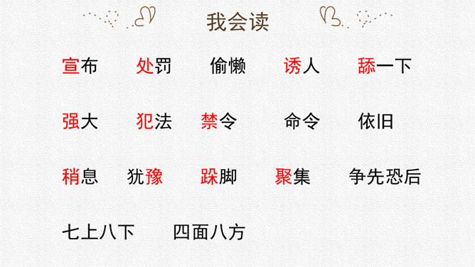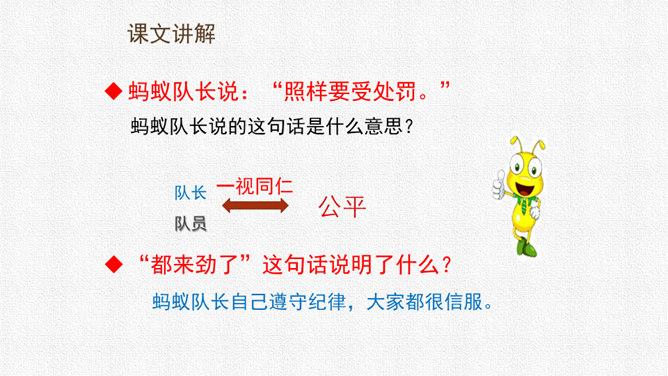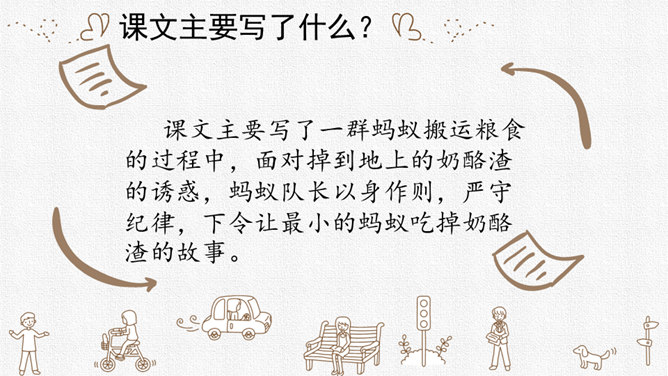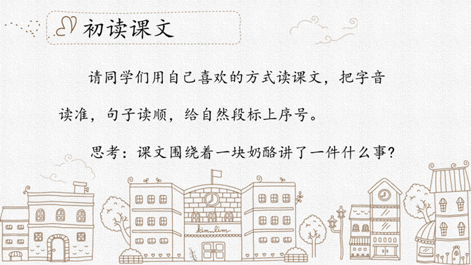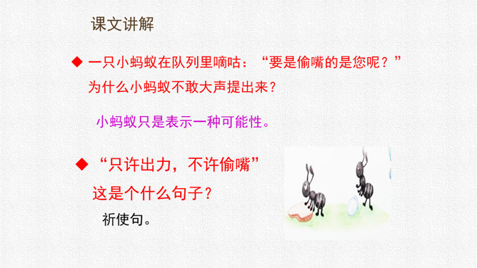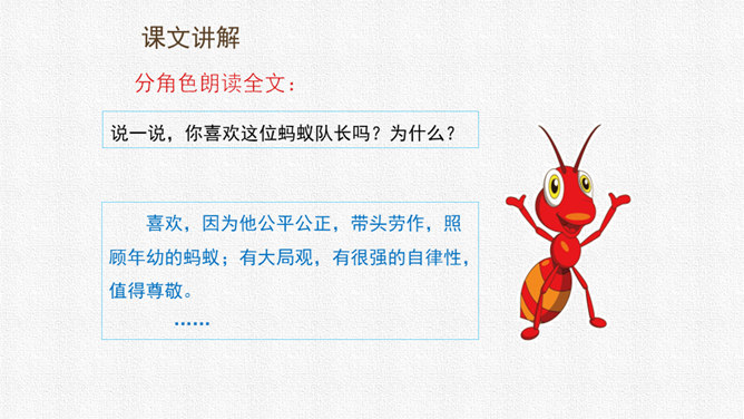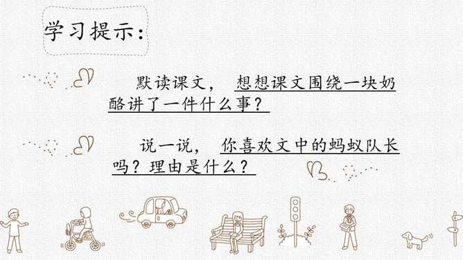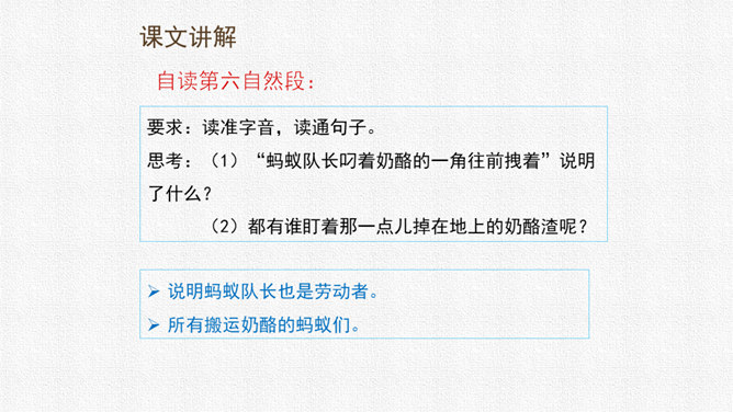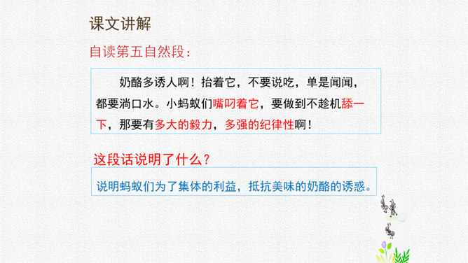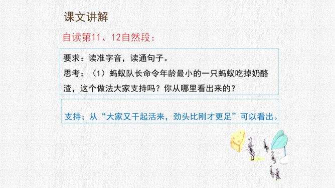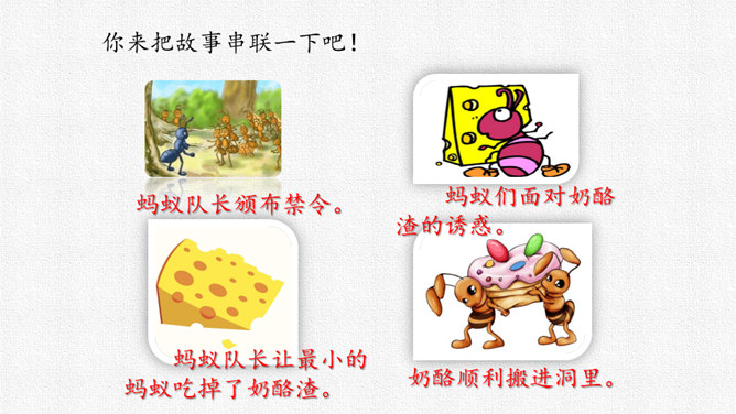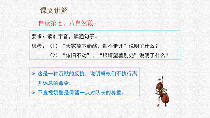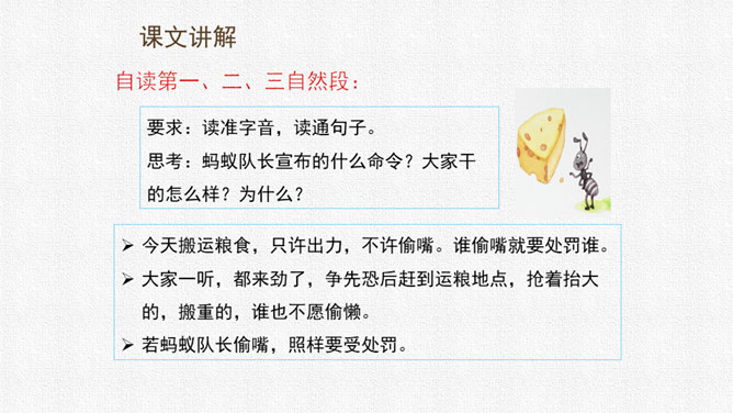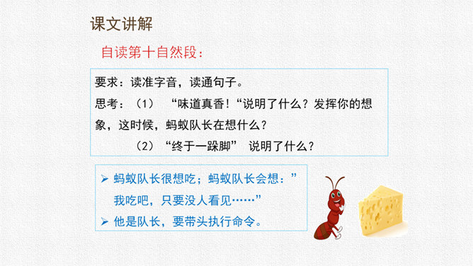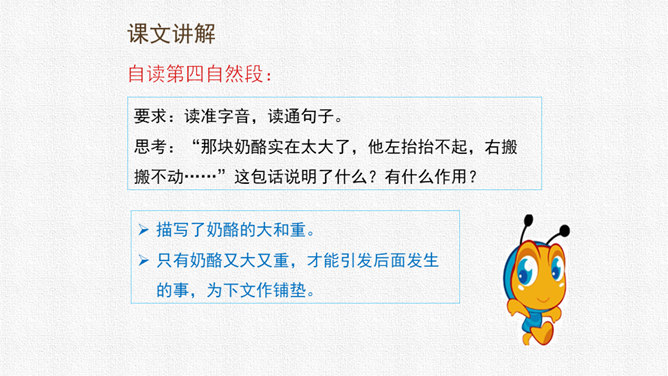 请同学们用自己喜欢的方式读课文,把字音读准,句子读顺,给自然段标上序号。思考:课文围绕着一块奶酪讲了一件什么事?要求:读准字音,读通句子。思考:蚂蚁队长宣布的什么命令?大家干的怎么样?为什么?要求:读准字音,读通句子。思考:“那块奶酪实在太大了,他左抬抬不起,右搬搬不动……”这包话说明了什么?有什么作用?描写了奶酪的大和重。只有奶酪又大又重,才能引发后面发生的事,为下文作铺垫。所属专题:一块奶酪ppt。