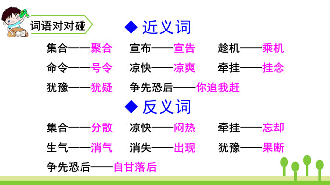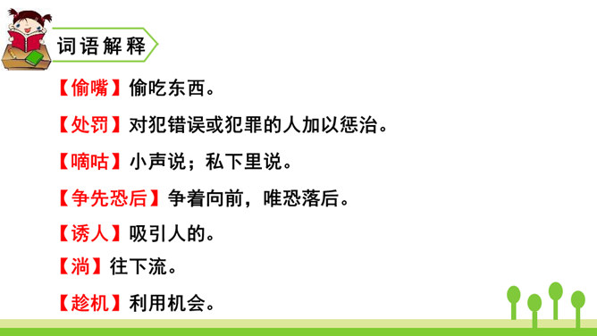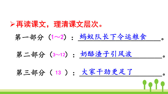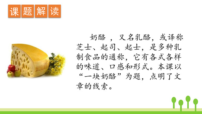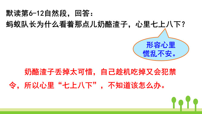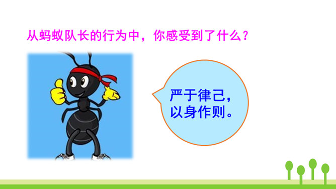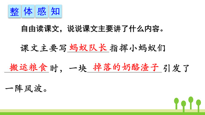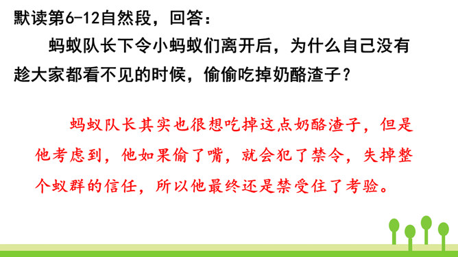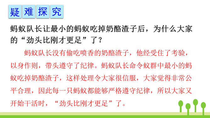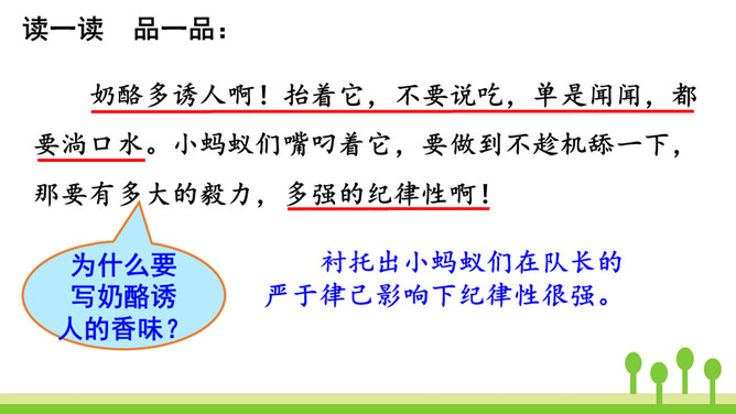 同学们,请大家认真朗读课文,注意生字词的读音,边读边思考:课文围绕一块奶酪讲了一件什么事?你喜欢文中的蚂蚁队长吗?说说理由。默读第1-5自然段,回答:为什么大家一听蚂蚁队长说自己要是偷嘴,“照样要处罚”之后,就都来劲了,争先恐后运粮?因为小蚂蚁们觉得队长以身作则,不搞特权,这样显得公平合理,所以劳动起来都特别卖力。为什么要写奶酪诱人的香味?衬托出小蚂蚁们在队长的严于律己影响下纪律性很强。所属专题:一块奶酪ppt。