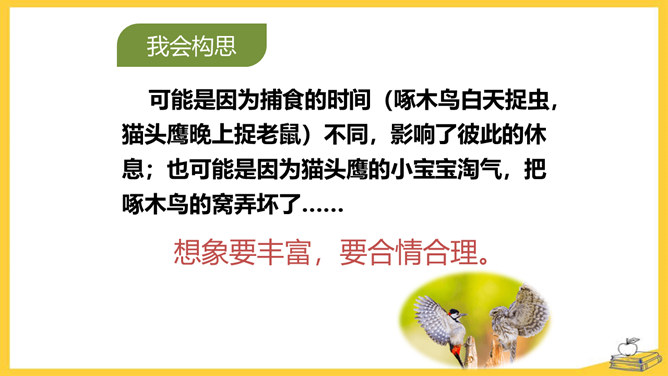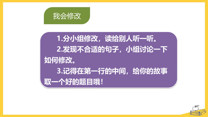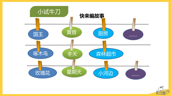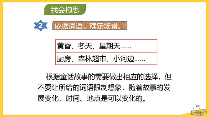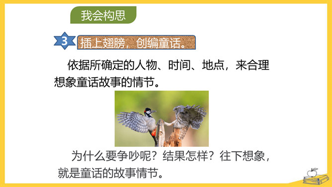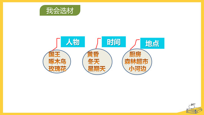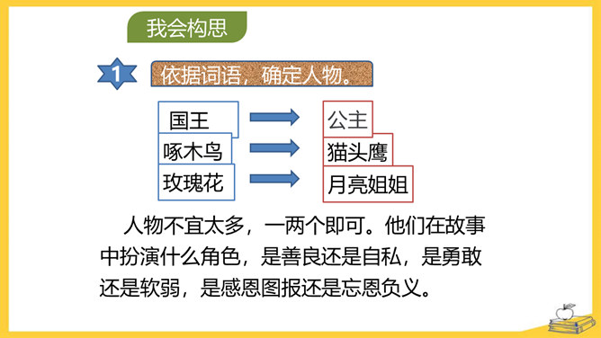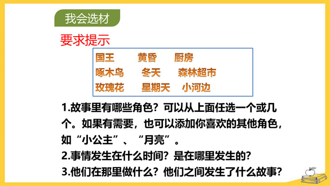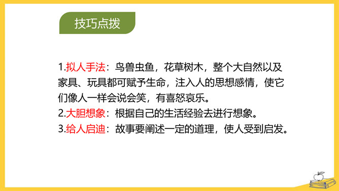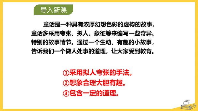 下面的童话你都读过吗?你知道这些童话分别讲述了什么内容吗?童话是一种具有浓厚幻想色彩的虚构的故事。童话多采用夸张、拟人、象征等来编写一些奇异、特别的故事情节。通过一个生动、有趣的小故事,告诉我们一个做人处事的道理,让大家受到教育。①采用拟人夸张的手法。②想象合理大胆有趣。③包含一定的道理。1.故事里有哪些角色?可以从上面任选一个或几个。如果有需要,也可以添加你喜欢的其他角色,如“小公主”、“月亮”。2.事情发生在什么时间?是在哪里发生的?3.他们在那里做什么?他们之间发生了什么故事?所属专题:我来编童话ppt。
