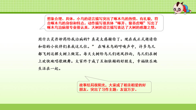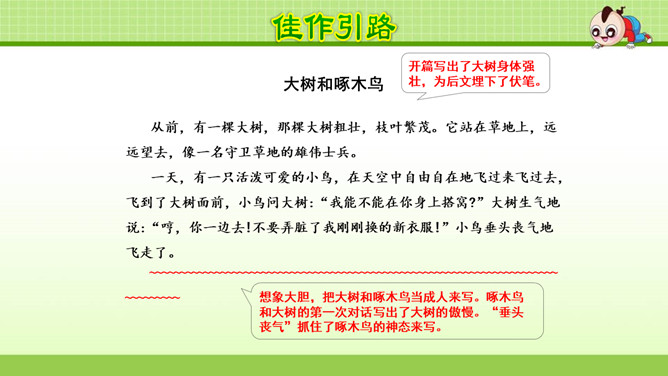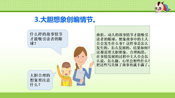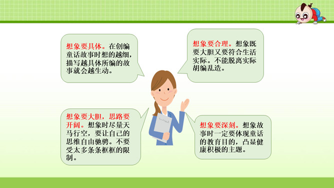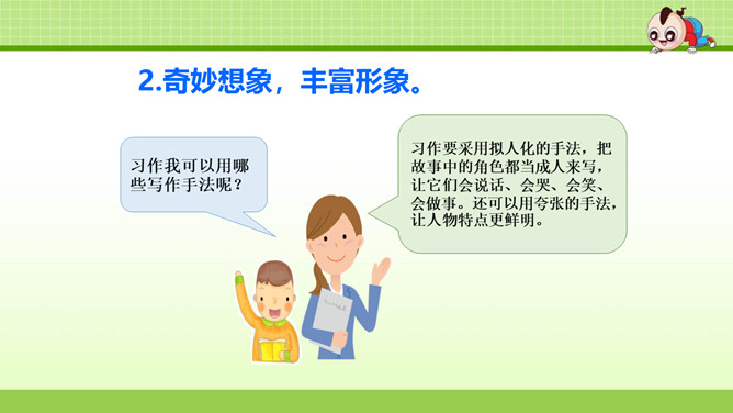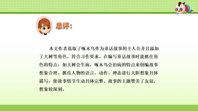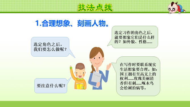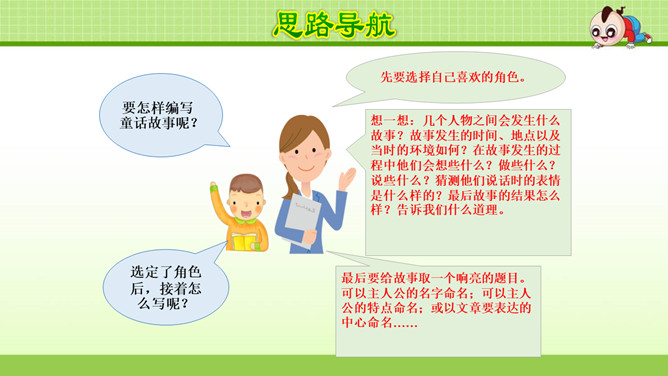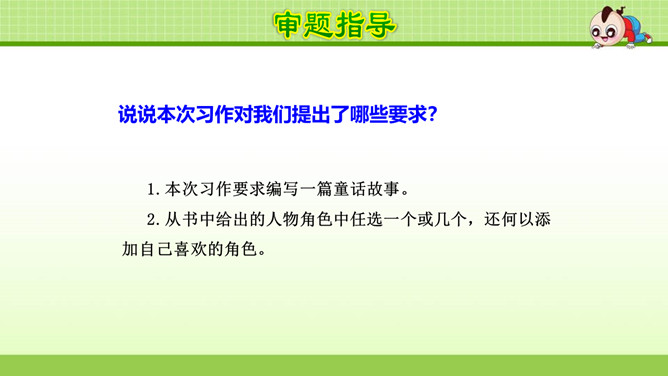 说说本次习作对我们提出了哪些要求? 1.本次习作要求编写一篇童话故事。2.从书中给出的人物角色中任选一个或几个,还何以添加自己喜欢的角色。要怎样编写童话故事呢?选定了角色后,接着怎么写呢?先要选择自己喜欢的角色。想一想:几个人物之间会发生什么故事?故事发生的时间、地点以及当时的环境如何?在故事发生的过程中他们会想些什么?做些什么?说些什么?猜测他们说话时的表情是什么样的?最后故事的结果怎么样?告诉我们什么道理。所属专题:我来编童话ppt。