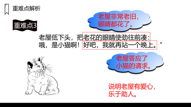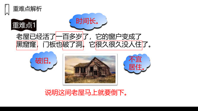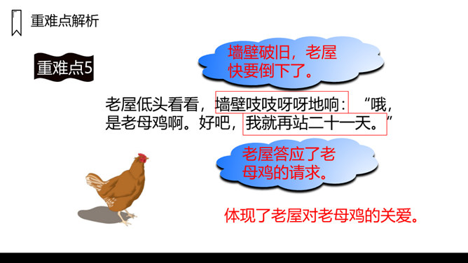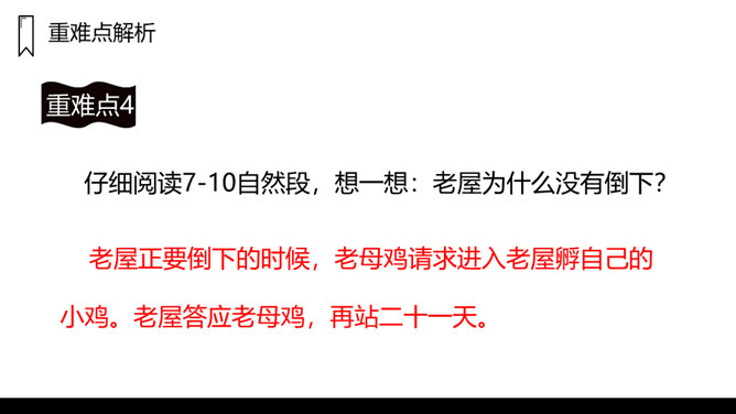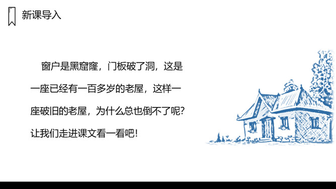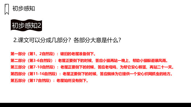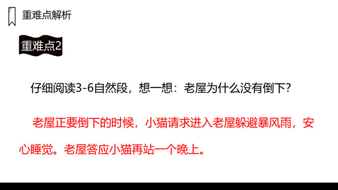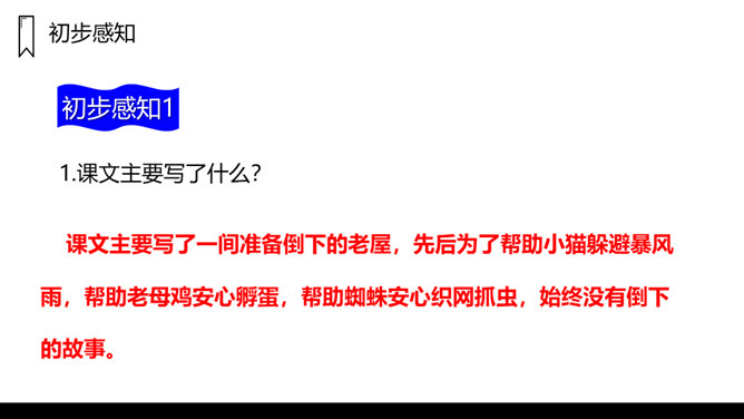 窗户是黑窟窿,门板破了洞,这是一座已经有一百多岁的老屋,这样一座破旧的老屋,为什么总也倒不了呢?让我们走进课文看一看吧!1.课文主要写了什么?课文主要写了一间准备倒下的老屋,先后为了帮助小猫躲避暴风雨,帮助老母鸡安心孵蛋,帮助蜘蛛安心织网抓虫,始终没有倒下的故事。2.课文可以分成几部分?各部分大意是什么?第一部分(第1、2自然段):破旧的老屋准备倒下。第二部分(第3-6自然段):老屋正要倒下的时候,答应小猫再站一晚上,帮助小猫躲避暴风雨。所属专题:总也倒不了的老屋ppt。