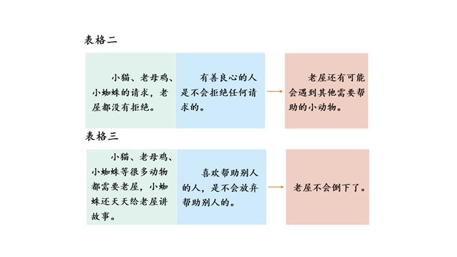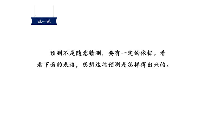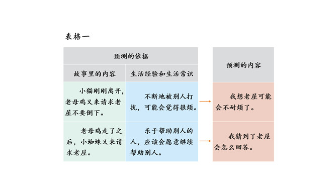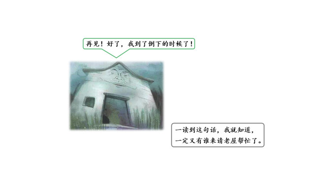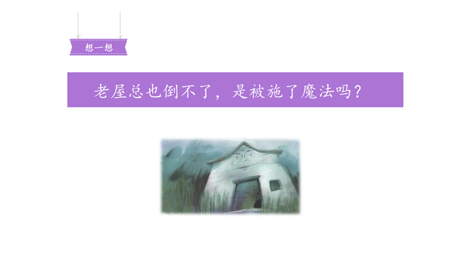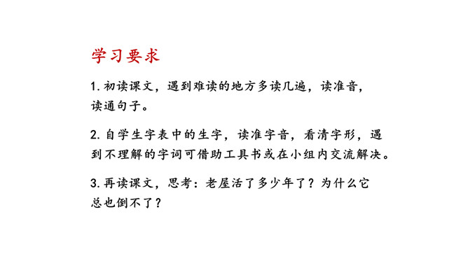 学习要求:1.初读课文,遇到难读的地方多读几遍,读准音,读通句子。2.自学生字表中的生字,读准字音,看清字形,遇到不理解的字词可借助工具书或在小组内交流解决。3.再读课文,思考:老屋活了多少年了?为什么它总也倒不了?文章的题目、插图,文章内容里的一些线索,都可以帮助我们预测。预测的内容可能跟故事的实际内容一样,也可能不一样。预测不是随意猜测,要有一定的依据。看看下面的表格,想想这些预测是怎样得出来的。所属专题:总也倒不了的老屋ppt。