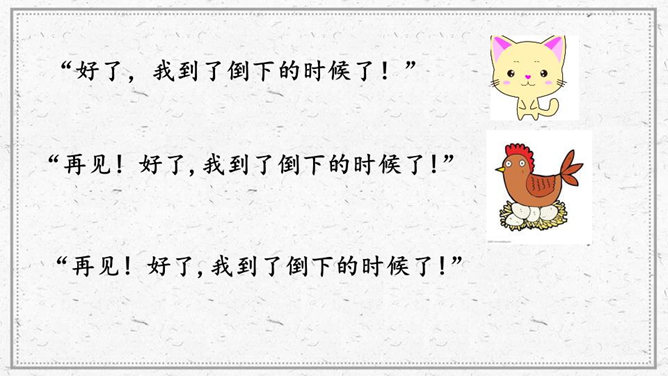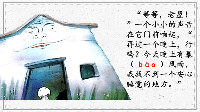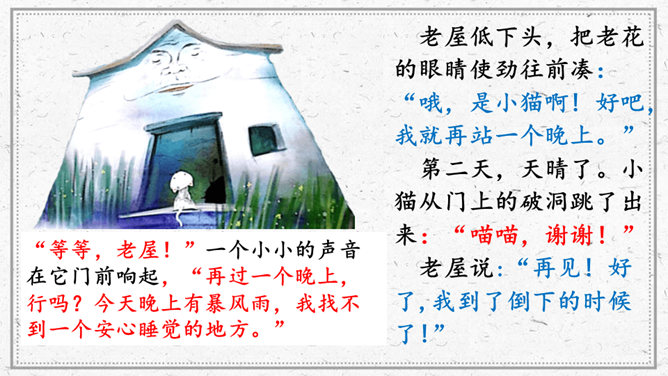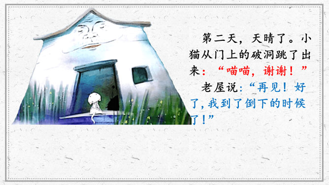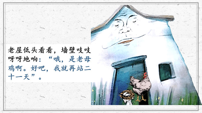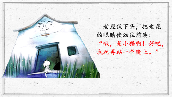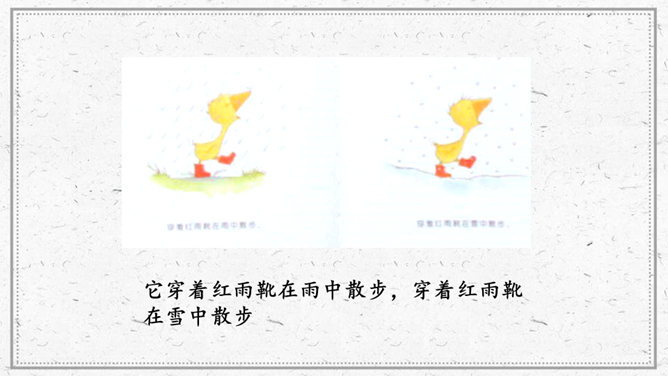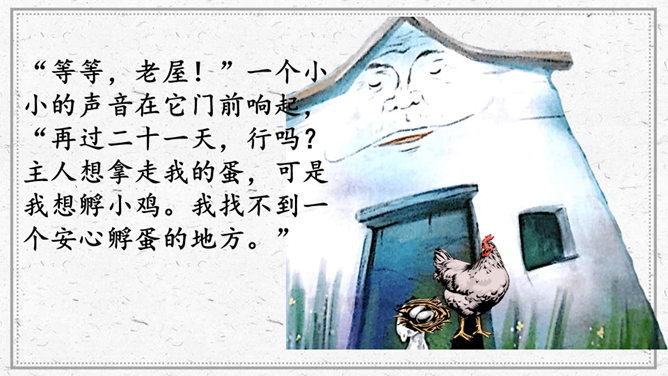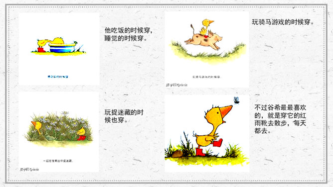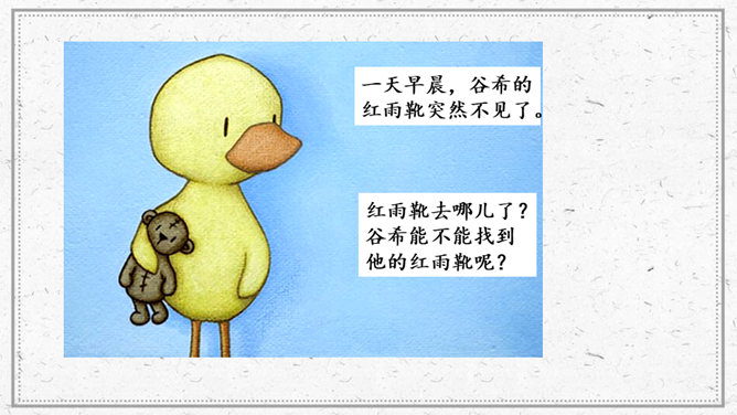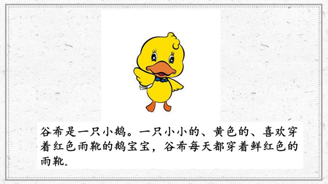小狗、小白兔、花甲虫、蝴蝶、小麻雀、蜻蜓、小鸟、蜗牛、……它们也遇到困难想请老屋帮忙,结合之前的对话想一想,它们会怎样请求老屋,老屋又会怎么回答?同桌两人为一组,一人扮演老屋,一人扮演小动物。谷希是一只小鹅。一只小小的、黄色的、喜欢穿着红色雨靴的鹅宝宝,谷希每天都穿着鲜红色的雨靴。所属专题:总也倒不了的老屋ppt。