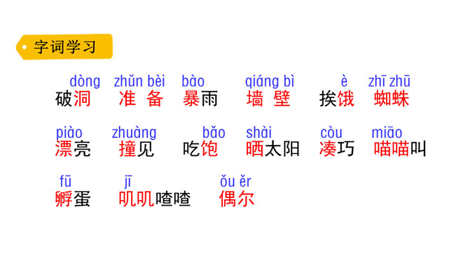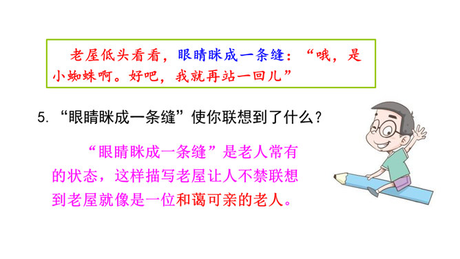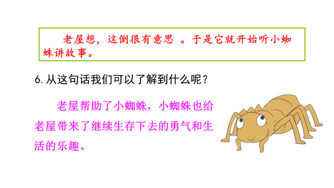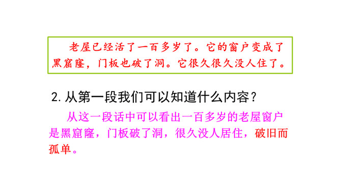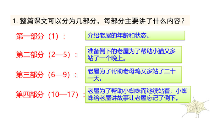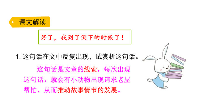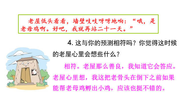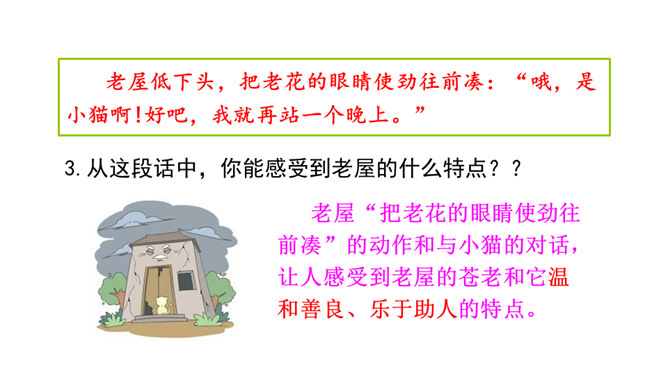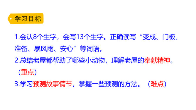 老屋活了一百多岁了,已经破旧不堪快要倒下了,可是每当它要倒下时,总会有小动物跑来请它不要倒下,于是它就一直没有倒下。这是怎么回事呢?让我们一起去看看这总也倒不了的老屋吧。1.会认8个生字,会写13个生字。正确读写“变成、门板、准备、暴风雨、安心”等词语。2.总结老屋都帮助了哪些小动物,理解老屋的奉献精神。(重点)3.学习预测故事情节,掌握一些预测的方法。(难点)所属专题:总也倒不了的老屋ppt。