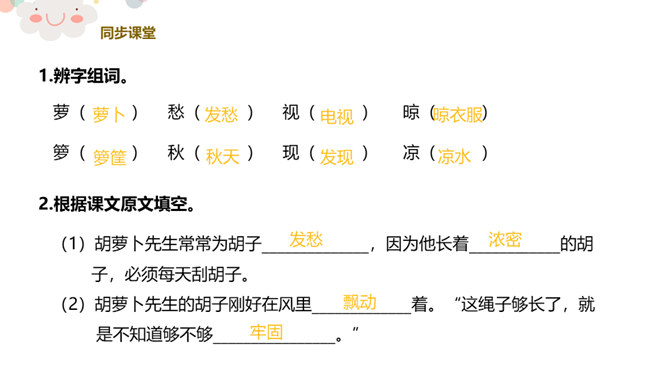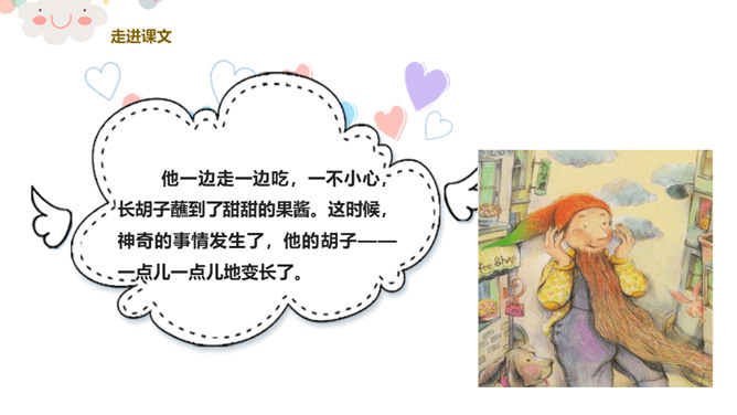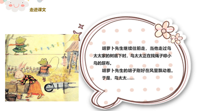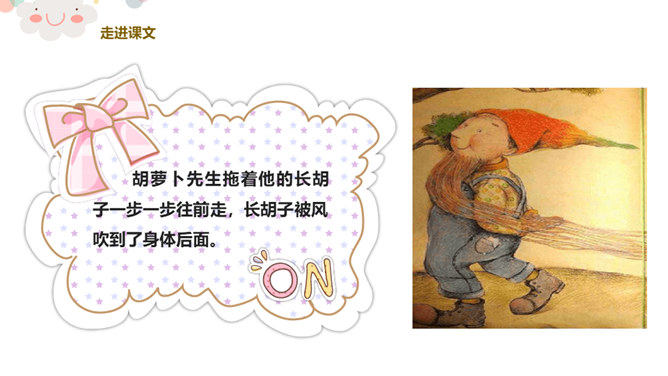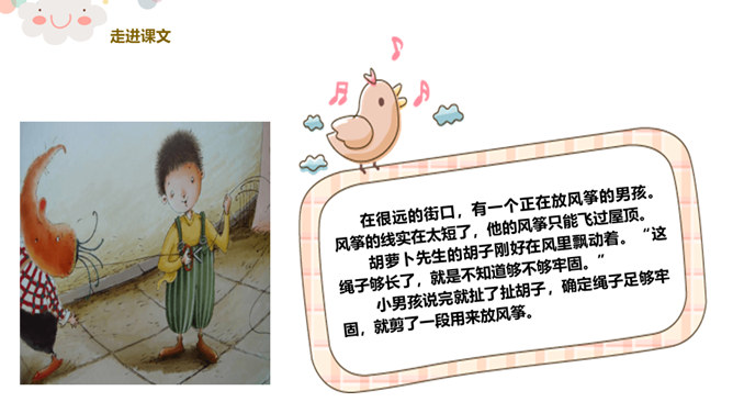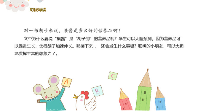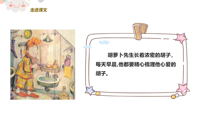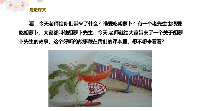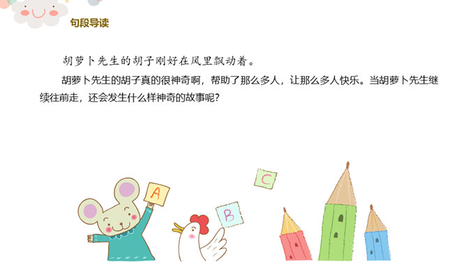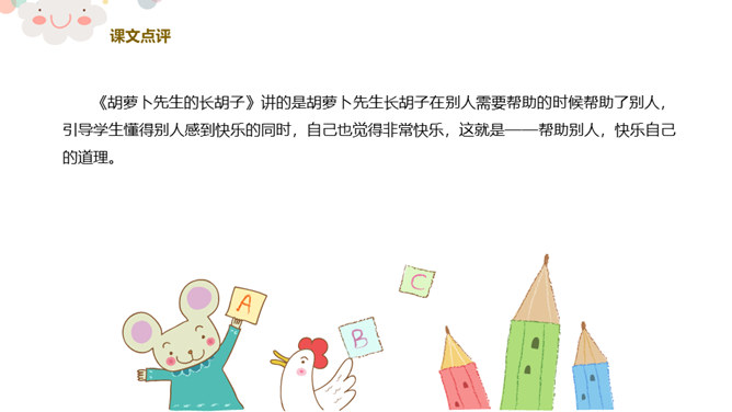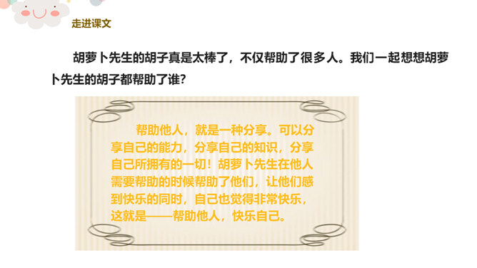 看,今天老师给你们带来了什么?谁爱吃胡萝卜?有一个老先生也很爱吃胡萝卜,大家都叫他胡萝卜先生。今天,老师就给大家带来了一个关于胡萝卜先生的故事,这个好听的故事藏在我们的课本里,想不想来看看?胡萝卜先生的胡子真是太棒了,不仅帮助了很多人。我们一起想想胡萝卜先生的胡子都帮助了谁?帮助他人,就是一种分享。可以分享自己的能力,分享自己的知识,分享自己所拥有的一切!胡萝卜先生在他人需要帮助的时候帮助了他们,让他们感到快乐的同时,自己也觉得非常快乐,这就是——帮助他人,快乐自己。所属专题:胡萝卜先生的长胡子ppt。