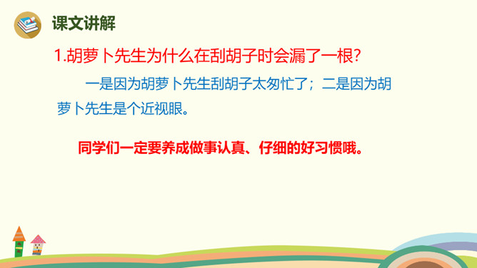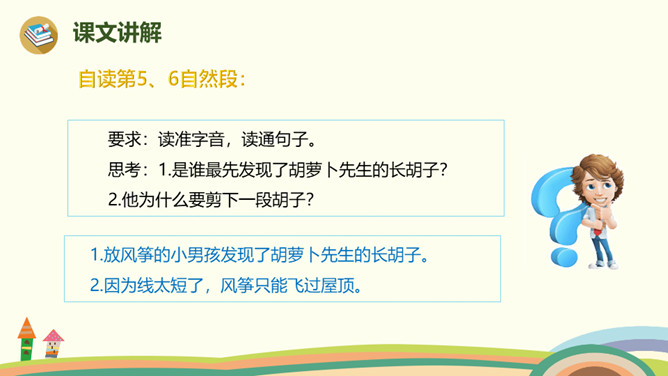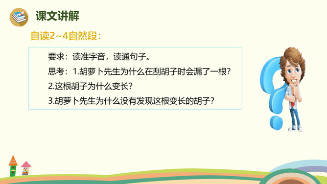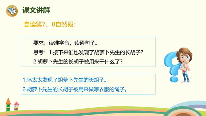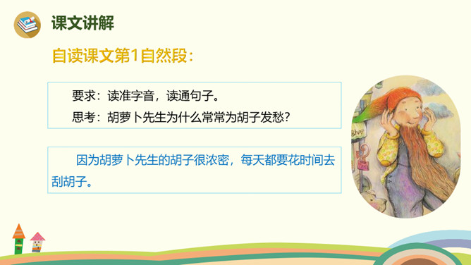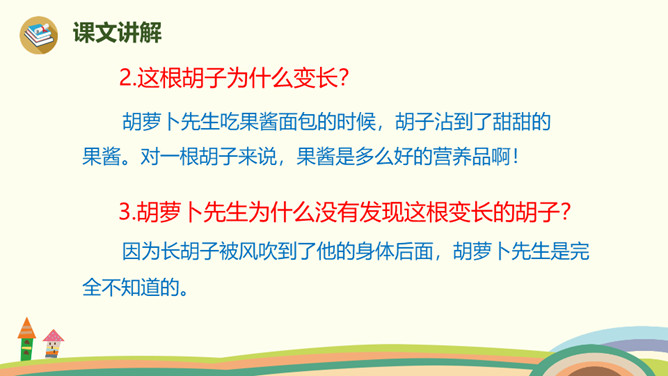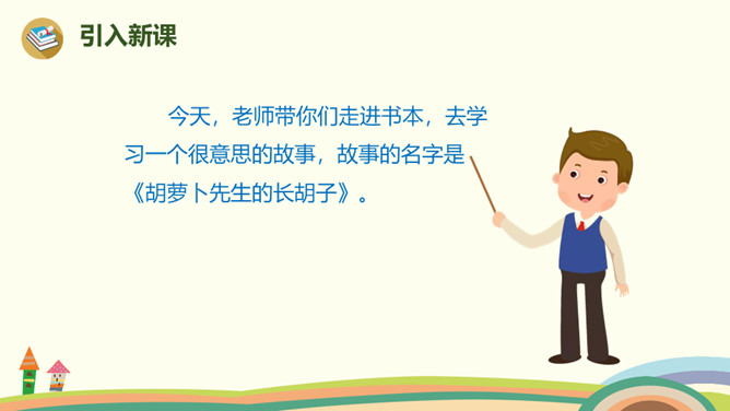 胡萝卜先生的胡子还会继续长,他还会继续往前走,一路上,他的胡子还可以帮助谁,用来做什么呢?鼹鼠老师带着学生过马路,他们挨着个,但不是前面的撞了后面的, 就是后面的踩了前面的。鼹鼠老师看见胡萝卜先生的长胡子,突然有了个好主意。她剪下一段胡萝卜先生的胡子,让每个小鼹鼠都拉住这段胡子,自己牵着胡子走在最前面。这样,小鼹鼠们顺利地过了马路。所属专题:胡萝卜先生的长胡子ppt。