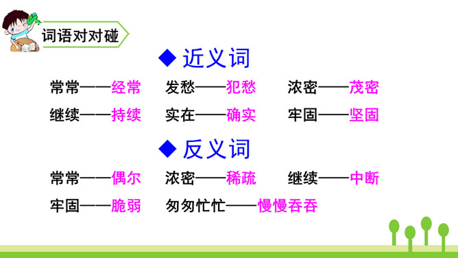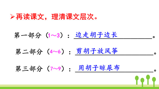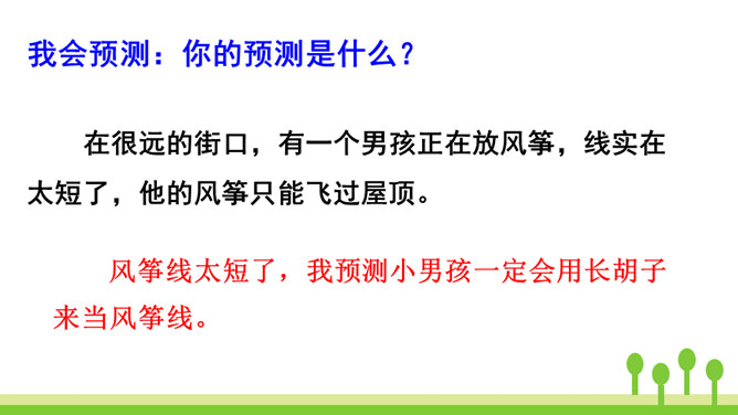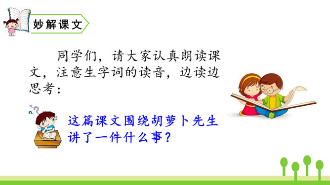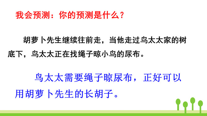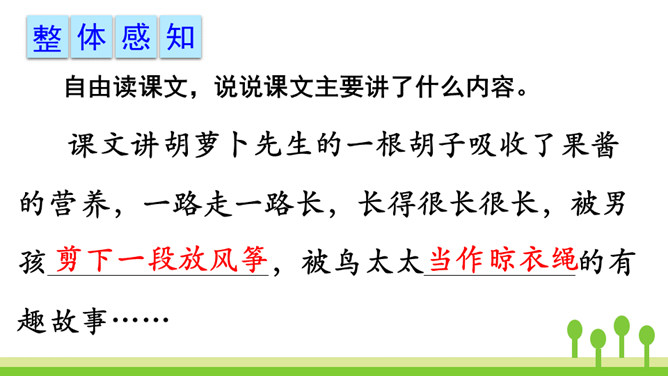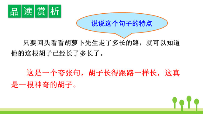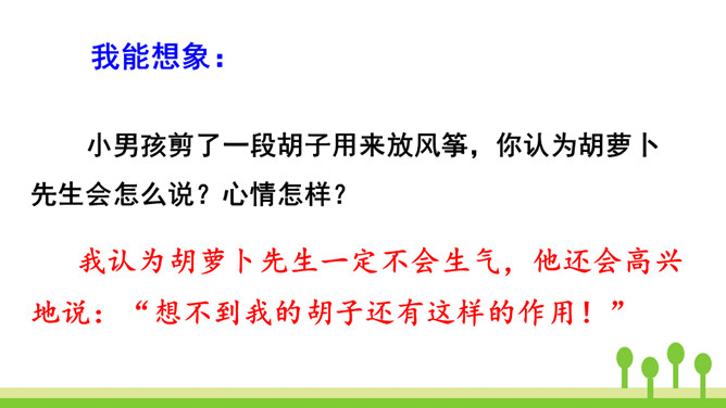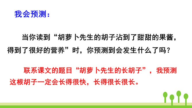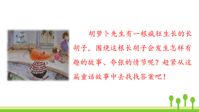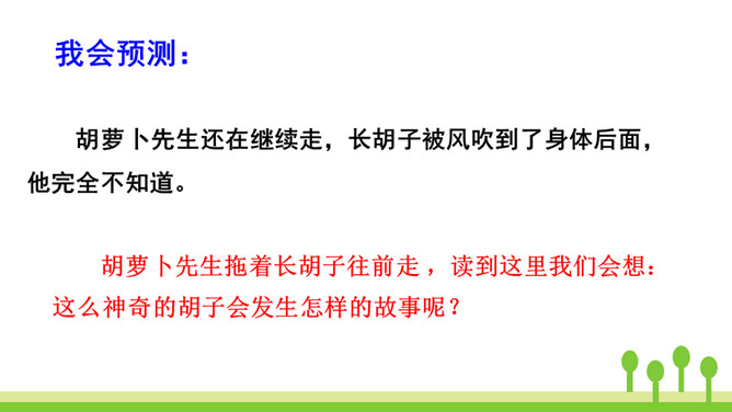 你读到“胡萝卜先生的胡子沾到了甜甜的果酱,得到了很好的营养”时,你预测到会发生什么了吗?联系课文的题目“胡萝卜先生的长胡子”,我预测这根胡子一定会长得很快,长得很长很长。这是一个夸张句,胡子长得跟路一样长,这真是一根神奇的胡子。这里的省略号表示故事并没有讲完,情节还会继续向前发展。使用省略号,引起读者的思考,启发读者续编故事。从本文的故事以及大家续编的故事中,你感受到了什么?所属专题:胡萝卜先生的长胡子ppt。