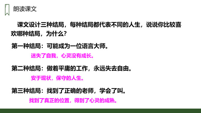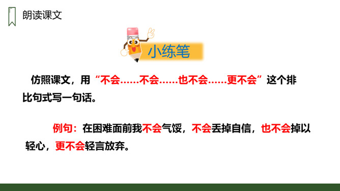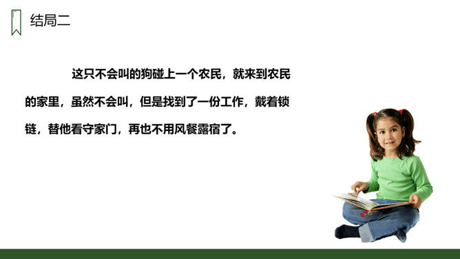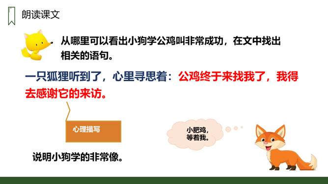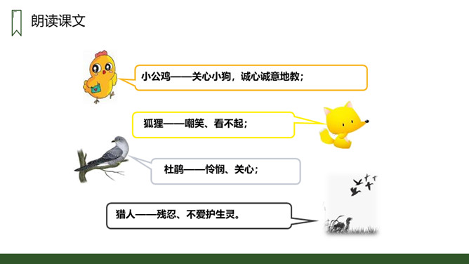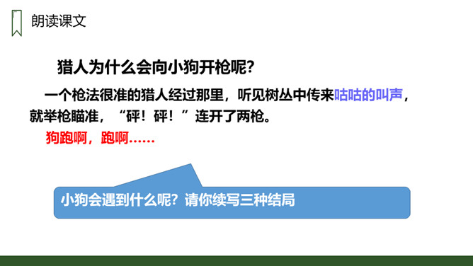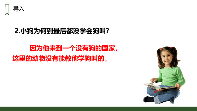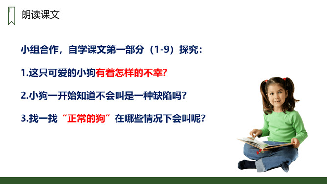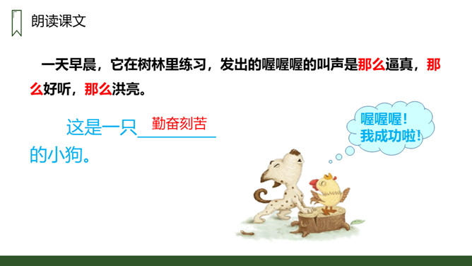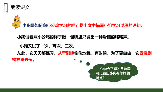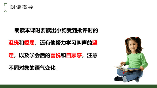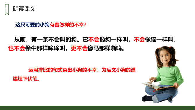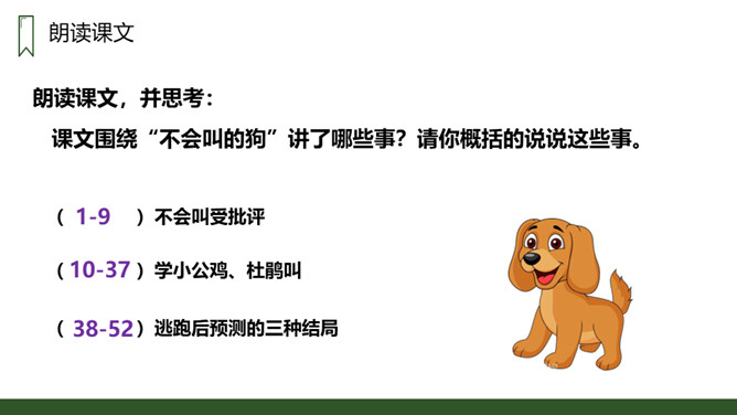 朗读本课时要读出小狗受到批评时的沮丧和委屈,还有他努力学习叫声的坚定,以及学会后的喜悦和自豪感,注意不同对象的语气变化。请用一句话概括文章的主要内容。一只不会叫的狗学习叫的故事。小狗为何到最后都没学会狗叫?因为他来到一个没有狗的国家,这里的动物没有能教他学狗叫的。朗读课文,并思考:课文讲了哪些事?请你概括的说说这些事。不会叫受批评,学小公鸡、杜鹃叫,逃跑后预测的三种结局。所属专题:不会叫的狗ppt。