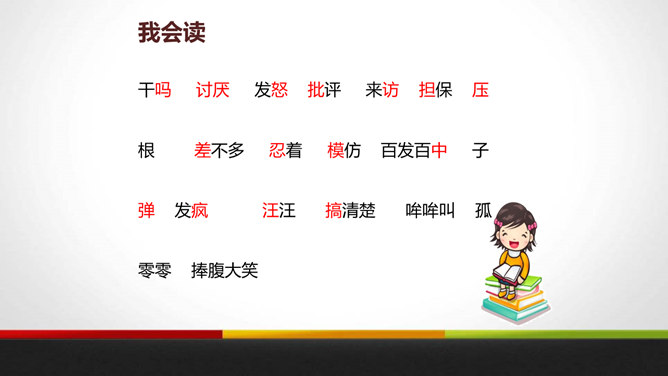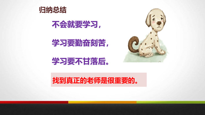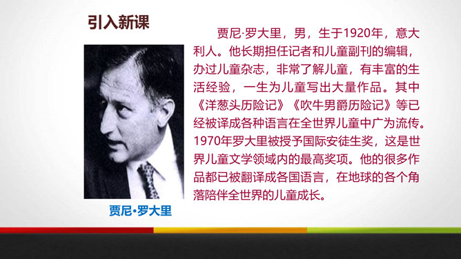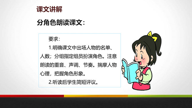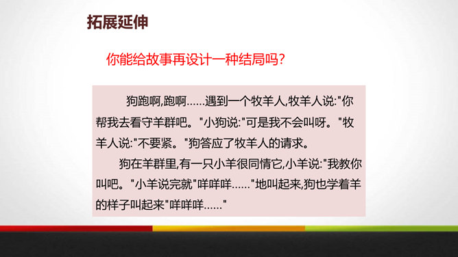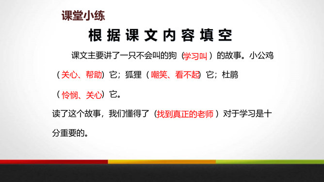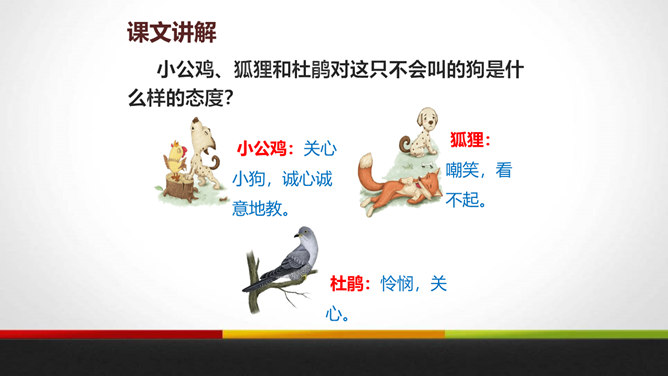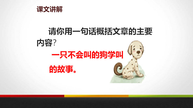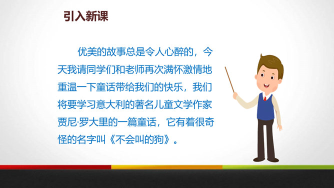 优美的故事总是令人心醉的,今天我请同学们和老师再次满怀激情地重温一下童话带给我们的快乐,我们将要学习意大利的著名儿童文学作家贾尼·罗大里的一篇童话。分角色朗读课文:要求:1.明确课文中出场人物的名单、人数;分组指定组员扮演角色。注意朗读的重音、声调、节奏。揣摩人物心理,把握角色形象。2.听读后学生简短评议。你觉得这是一只怎样的小狗呢?你是从哪里发现的?所属专题:不会叫的狗ppt。