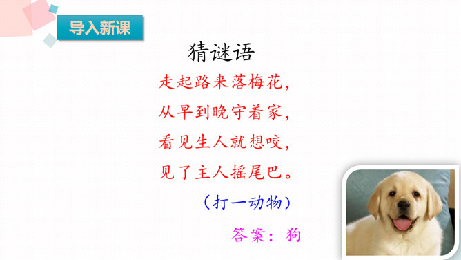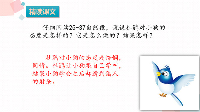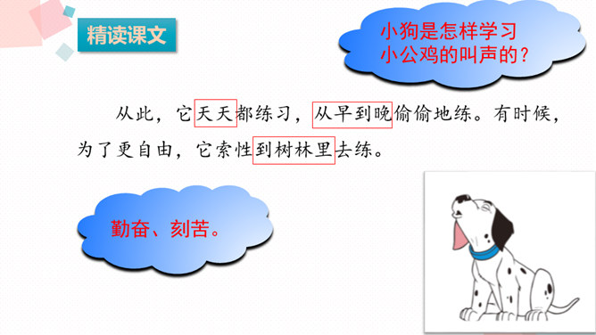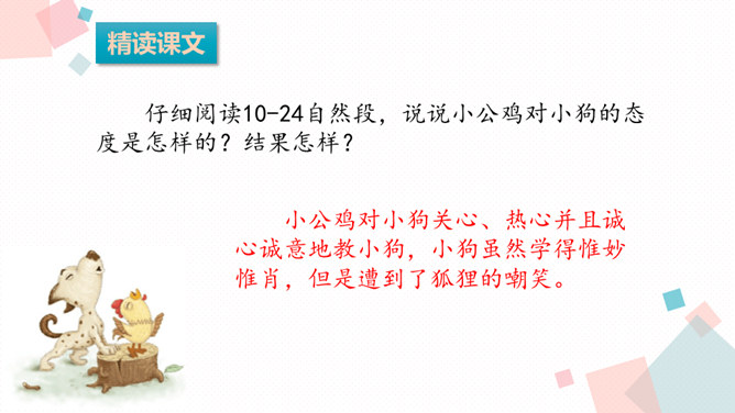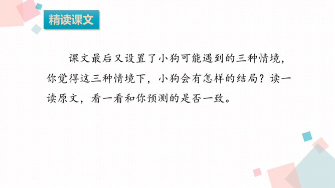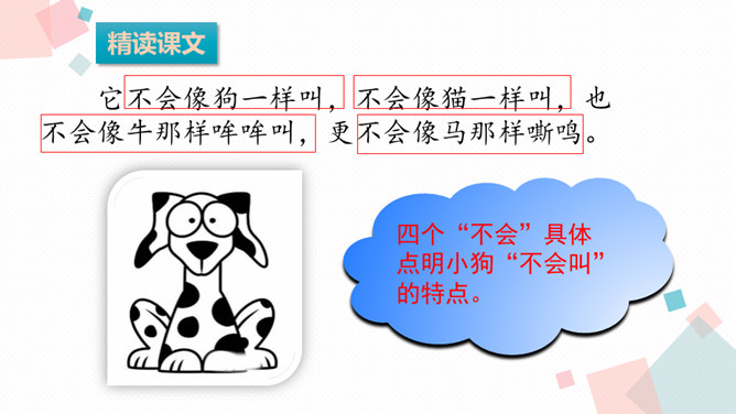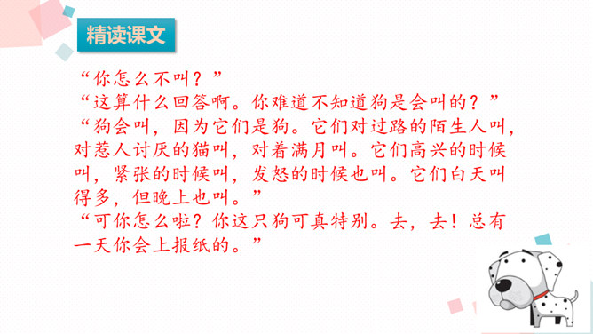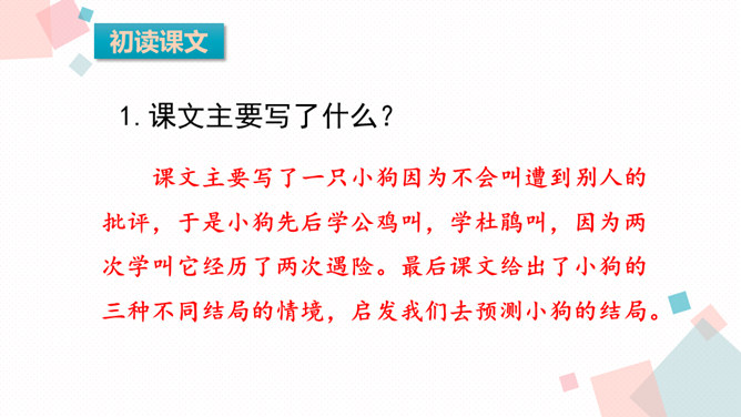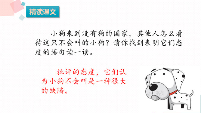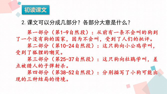 课文可以分成几部分?各部分大意是什么?第一部分(第1-9自然段):从前有一条不会叫的狗到了一个没有狗的国家,因为不会叫,受到了人们的批评。第二部分(第10-24自然段):这只狗向小公鸡学叫,受到了狐狸的嘲笑。第三部分(第25-37自然段):这只狗向杜鹃学叫,差点被猎人的子弹射杀。第四部分(第38-52自然段):分别描写了小狗可能出现的三种结局的情境。所属专题:不会叫的狗ppt。